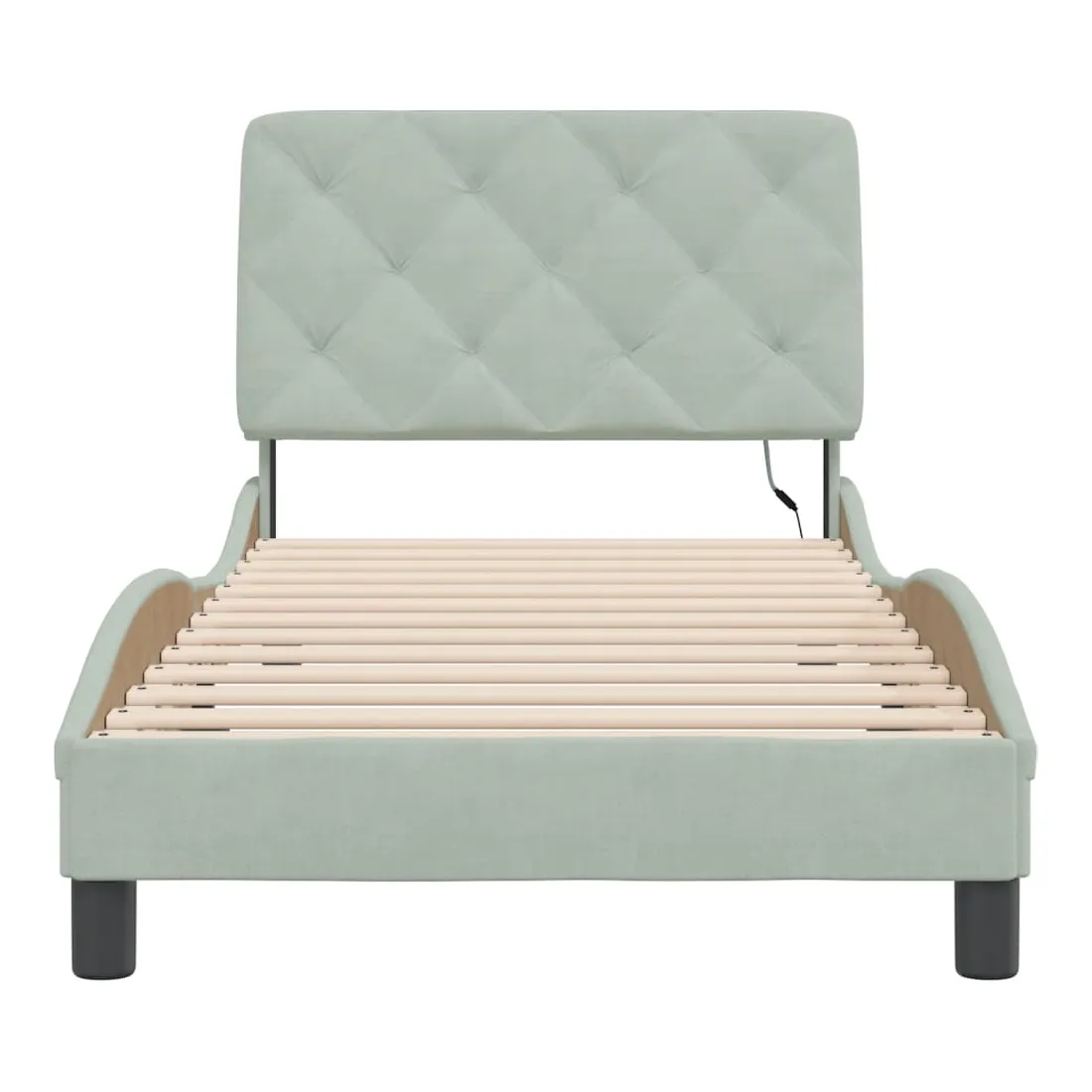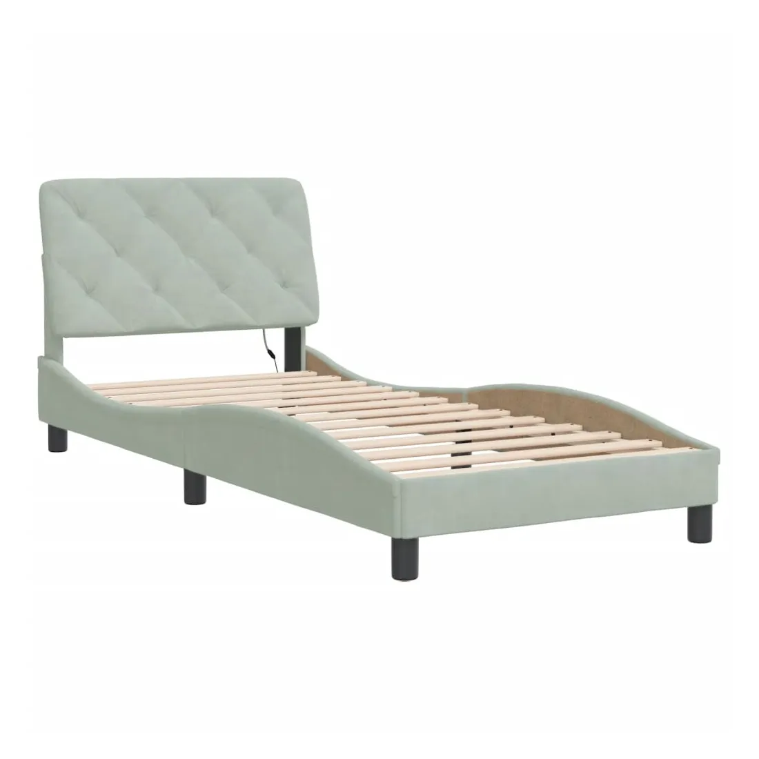 Obtenez une meilleure nuit de sommeil reposante grâce à ce cadre de lit avec lumières LED ! Il est un supplément accueillant à toute chambre à coucher. Velours doux : le velours est un tissu doux et confortable, agréable au toucher. Lattes de contreplaqué : les lattes de contreplaqué assurent une bonne répartition du poids, garantissant que le matelas reste en place à chaque torsion de votre corps pendant le sommeil. Excellent soutien : l'oreiller de tête de lit est rembourré avec de la mousse pour un confort ultra doux et optimal vous offre un excellent soutien du dos lorsque vous êtes assis dans votre lit pour lire ou regarder la télévision. Bande LED colorée : apportez de la gaieté dans l'obscurité avec des lumières LED colorées ! Les bandes auto-agrippantes situées à l'arrière du coussin de la tête de lit peuvent être utilisées pour fixer les lumières LED. Design latéral ondulé : l’aspect ondulé du cadre de lit est élégant et sophistiqué, ajoutant une touche moderne et élégante à votre décor, ce qui en fait le point central de votre chambre à coucher. Bon à savoir :Un matelas n'est pas inclus avec ce lit. Nous offrons une sélection variée de matelas. Vous pouvez consulter notre boutique pour trouver un matelas assorti.Ce produit est doté d'un connecteur USB qui nécessite une source d'alimentation USB de 5V certifiée (non incluse).