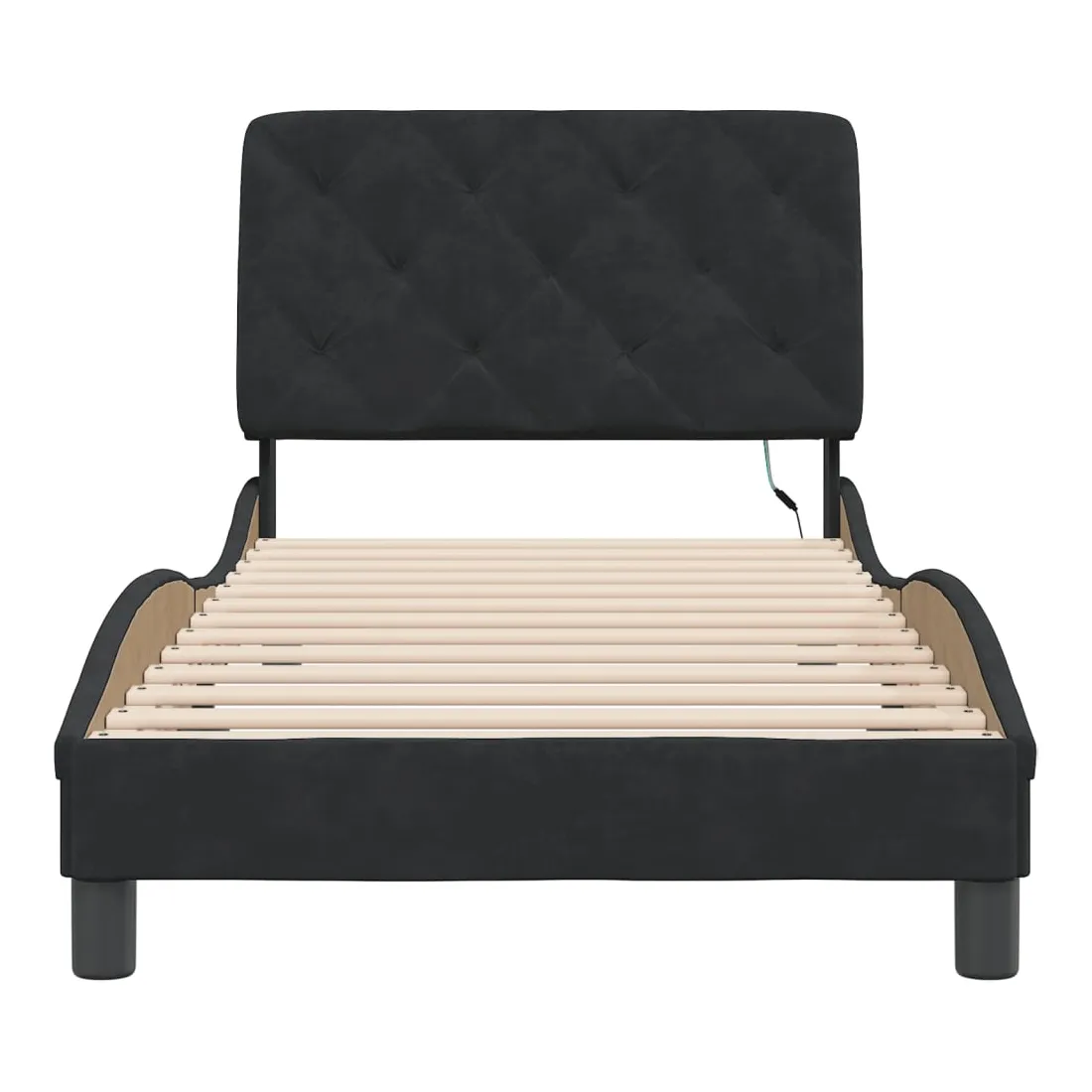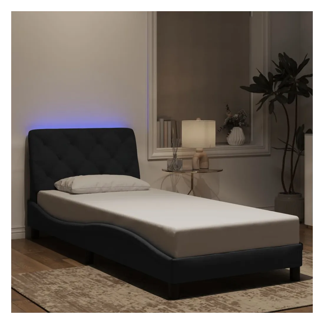 Obtenez une meilleure nuit de sommeil reposante grâce à ce cadre de lit avec lumières LED ! Il est un supplément accueillant à toute chambre à coucher. Velours doux : le velours est un tissu doux et confortable, agréable au toucher. Lattes de contreplaqué : les lattes de contreplaqué assurent une bonne répartition du poids, garantissant que le matelas reste en place à chaque torsion de votre corps pendant le sommeil. Excellent soutien : l'oreiller de tête de lit est rembourré avec de la mousse pour un confort ultra doux et optimal vous offre un excellent soutien du dos lorsque vous êtes assis dans votre lit pour lire ou regarder la télévision. Bande LED colorée : apportez de la gaieté dans l'obscurité avec des lumières LED colorées ! Les bandes auto-agrippantes situées à l'arrière du coussin de la tête de lit peuvent être utilisées pour fixer les lumières LED. Design latéral ondulé : l’aspect ondulé du cadre de lit est élégant et sophistiqué, ajoutant une touche moderne et élégante à votre décor, ce qui en fait le point central de votre chambre à coucher. Bon à savoir :Un matelas n'est pas inclus avec ce lit. Nous offrons une sélection variée de matelas. Vous pouvez consulter notre boutique pour trouver un matelas assorti.Ce produit est doté d'un connecteur USB qui nécessite une source d'alimentation USB de 5V certifiée (non incluse).