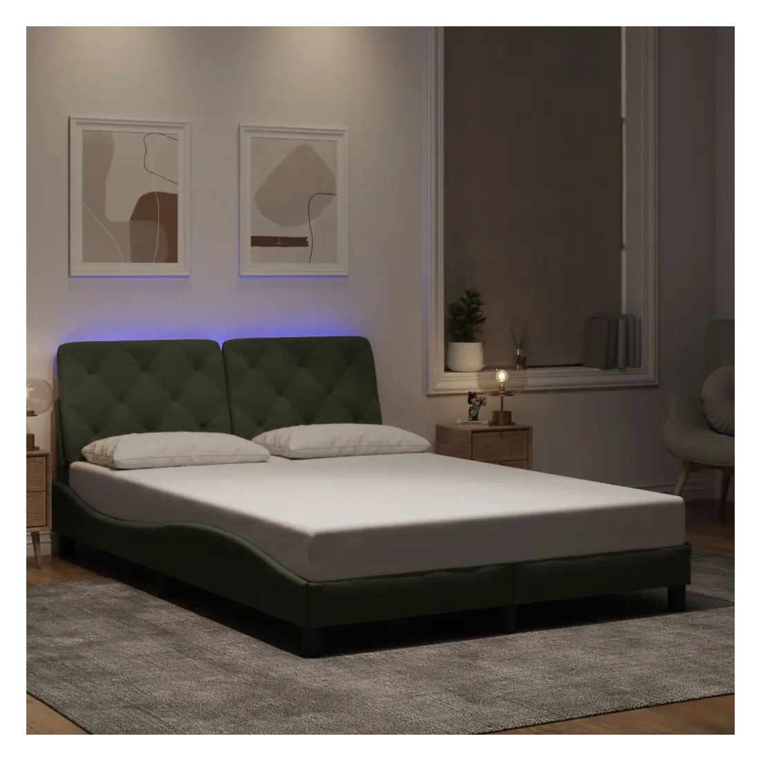 Obtenez une meilleure nuit de sommeil reposante grâce à ce cadre de lit avec lumières LED ! Il est un supplément accueillant à toute chambre à coucher. Velours doux : le velours est un tissu doux et confortable, agréable au toucher. Lattes de contreplaqué : les lattes de contreplaqué assurent une bonne répartition du poids, garantissant que le matelas reste en place à chaque torsion de votre corps pendant le sommeil. Excellent soutien : l'oreiller de tête de lit est rembourré avec de la mousse pour un confort ultra doux et optimal vous offre un excellent soutien du dos lorsque vous êtes assis dans votre lit pour lire ou regarder la télévision. Bande LED colorée : apportez de la gaieté dans l'obscurité avec des lumières LED colorées ! Les bandes auto-agrippantes situées à l'arrière du coussin de la tête de lit peuvent être utilisées pour fixer les lumières LED. Design latéral ondulé : l’aspect ondulé du cadre de lit est élégant et sophistiqué, ajoutant une touche moderne et élégante à votre décor, ce qui en fait le point central de votre chambre à coucher. Bon à savoir :Un matelas n'est pas inclus avec ce lit. Nous offrons une sélection variée de matelas. Vous pouvez consulter notre boutique pour trouver un matelas assorti.Ce produit est doté d'un connecteur USB qui nécessite une source d'alimentation USB de 5V certifiée (non incluse).
