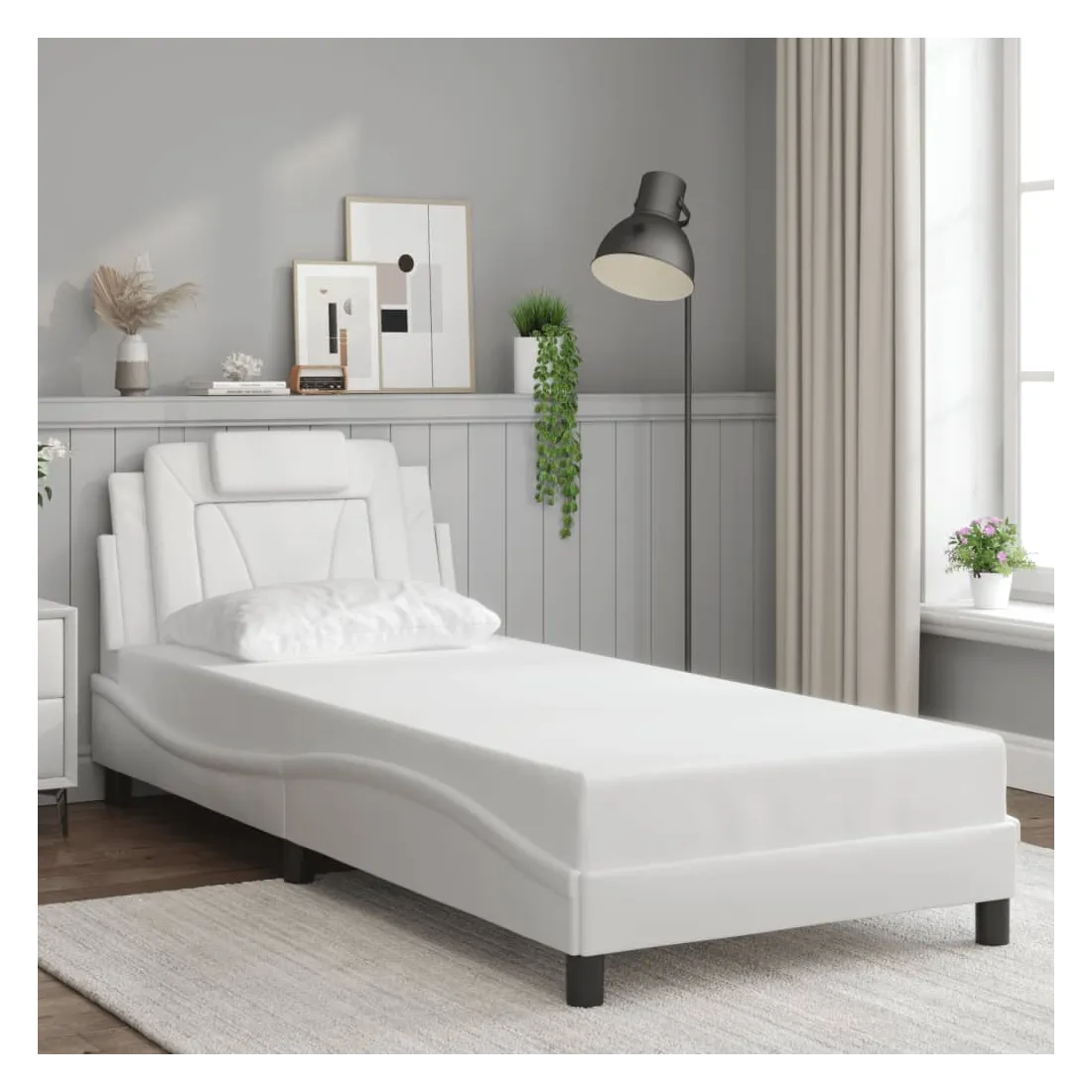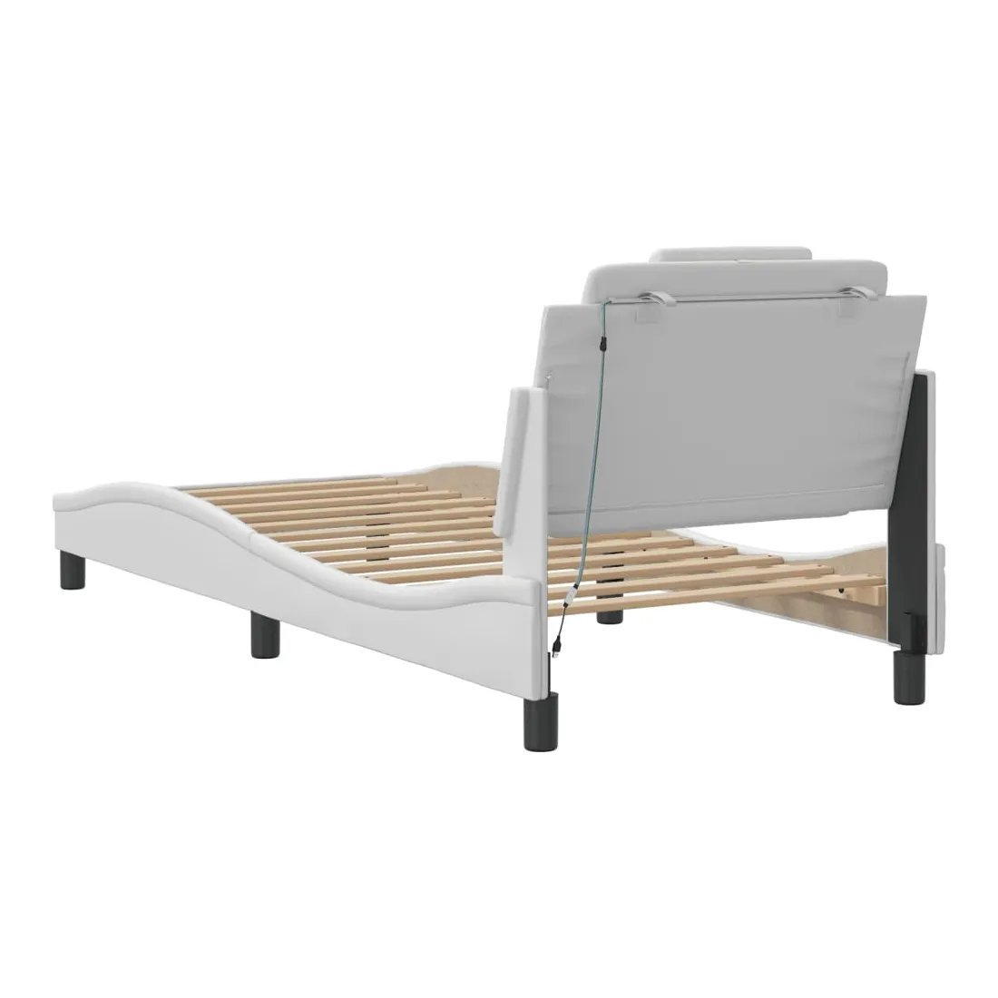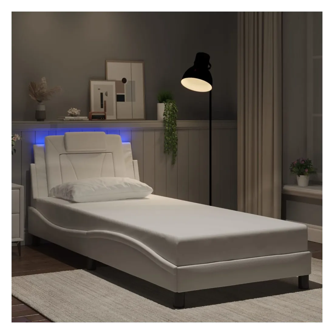 Obtenez une meilleure nuit de sommeil reposante grâce à ce cadre de lit avec lumières LED ! Il est un supplément accueillant à toute chambre à coucher. Similicuir durable : le similicuir de qualité supérieure est un matériau très durable. Il est résistant aux taches, ce qui le rend facile à nettoyer avec un chiffon humide. La surface lisse donne également un aspect luxueux et la beauté du cuir véritable.Lattes de contreplaqué : les lattes de contreplaqué assurent une bonne répartition du poids, garantissant que le matelas reste en place à chaque torsion de votre corps pendant le sommeil. Excellent soutien : l'oreiller de tête de lit est rembourré avec de la mousse pour un confort ultra doux et optimal vous offre un excellent soutien du dos lorsque vous êtes assis dans votre lit pour lire ou regarder la télévision. Bande LED colorée : apportez de la gaieté dans l'obscurité avec des lumières LED colorées ! Les bandes auto-agrippantes situées à l'arrière du coussin de la tête de lit peuvent être utilisées pour fixer les lumières LED. Design latéral ondulé : l’aspect ondulé du cadre de lit est élégant et sophistiqué, ajoutant une touche moderne et élégante à votre décor, ce qui en fait le point central de votre chambre à coucher. Bon à savoir :Un matelas n'est pas inclus avec ce lit. Nous offrons une sélection variée de matelas. Vous pouvez consulter notre boutique pour trouver un matelas assorti.Ce produit est doté d'un connecteur USB qui nécessite une source d'alimentation USB de 5V certifiée (non incluse).