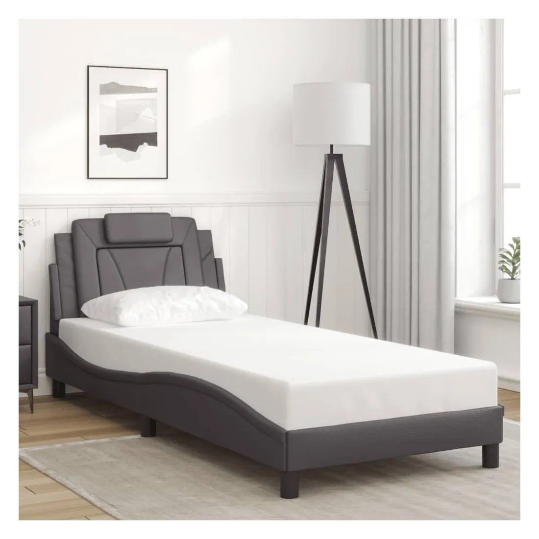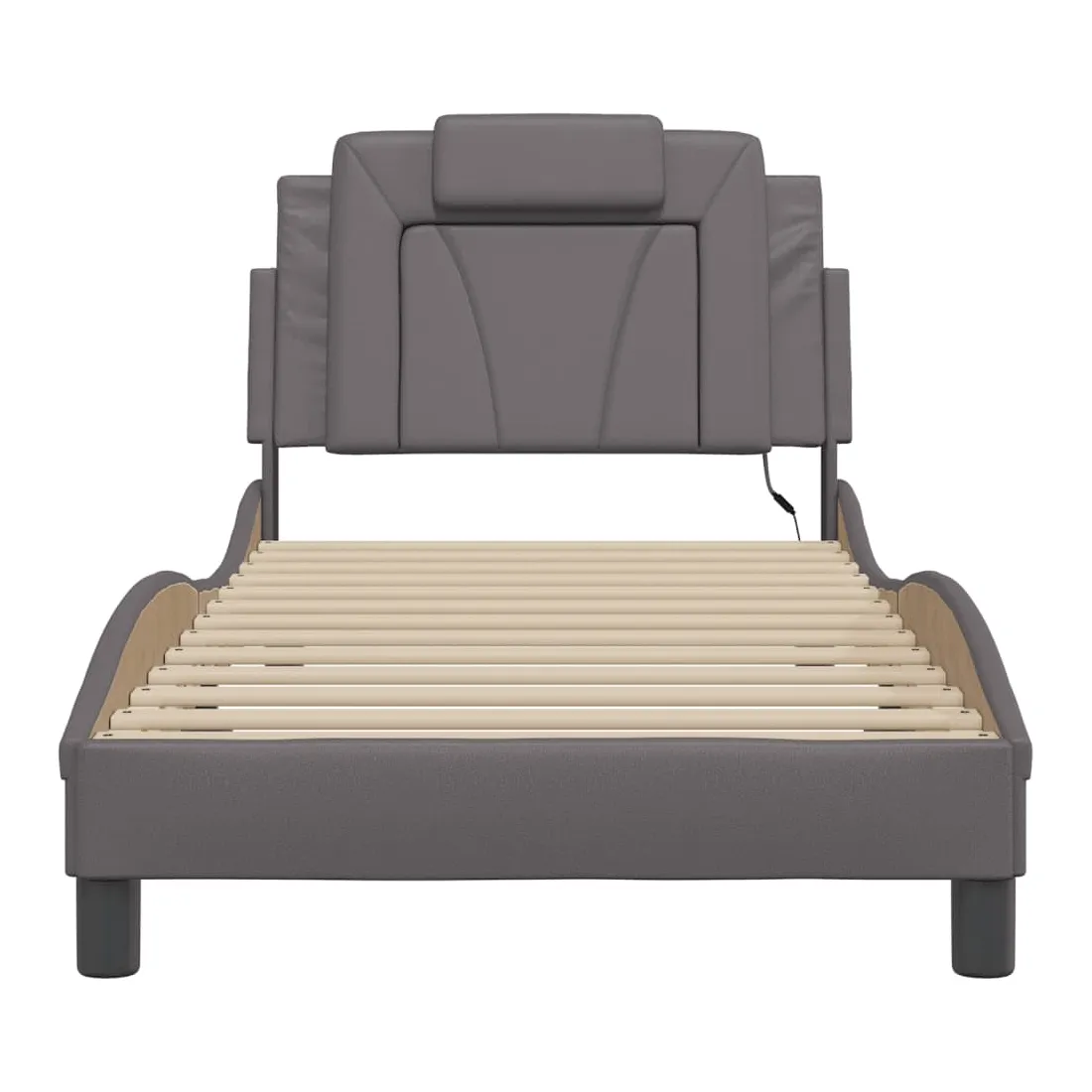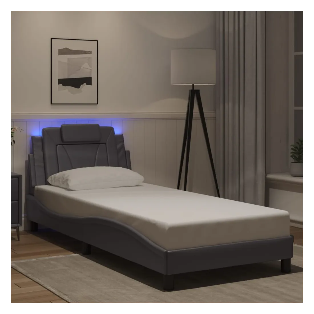 Obtenez une meilleure nuit de sommeil reposante grâce à ce cadre de lit avec lumières LED ! Il est un supplément accueillant à toute chambre à coucher. Similicuir durable : le similicuir de qualité supérieure est un matériau très durable. Il est résistant aux taches, ce qui le rend facile à nettoyer avec un chiffon humide. La surface lisse donne également un aspect luxueux et la beauté du cuir véritable.Lattes de contreplaqué : les lattes de contreplaqué assurent une bonne répartition du poids, garantissant que le matelas reste en place à chaque torsion de votre corps pendant le sommeil. Excellent soutien : l'oreiller de tête de lit est rembourré avec de la mousse pour un confort ultra doux et optimal vous offre un excellent soutien du dos lorsque vous êtes assis dans votre lit pour lire ou regarder la télévision. Bande LED colorée : apportez de la gaieté dans l'obscurité avec des lumières LED colorées ! Les bandes auto-agrippantes situées à l'arrière du coussin de la tête de lit peuvent être utilisées pour fixer les lumières LED. Design latéral ondulé : l’aspect ondulé du cadre de lit est élégant et sophistiqué, ajoutant une touche moderne et élégante à votre décor, ce qui en fait le point central de votre chambre à coucher. Bon à savoir :Un matelas n'est pas inclus avec ce lit. Nous offrons une sélection variée de matelas. Vous pouvez consulter notre boutique pour trouver un matelas assorti.Ce produit est doté d'un connecteur USB qui nécessite une source d'alimentation USB de 5V certifiée (non incluse).