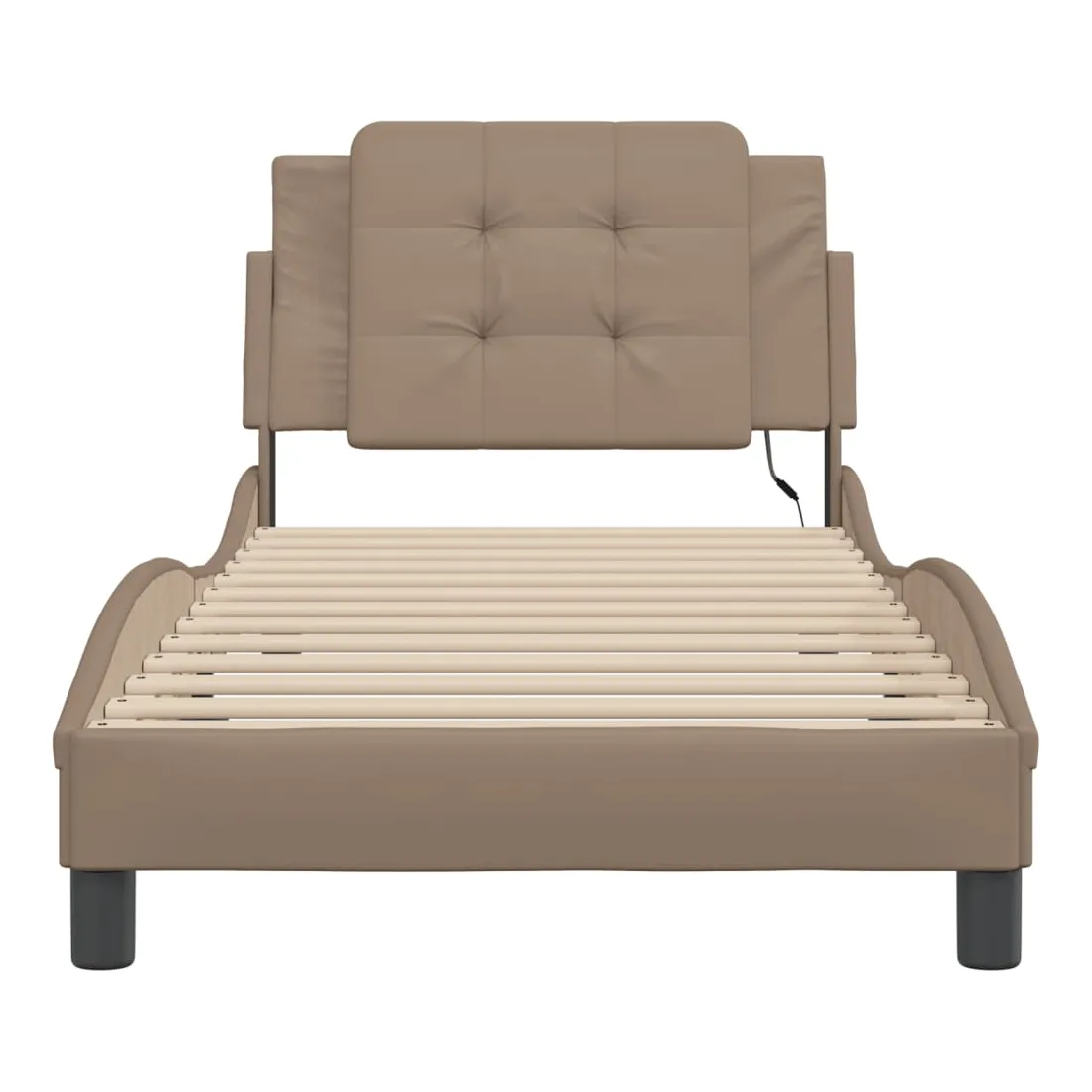 Obtenez une meilleure nuit de sommeil reposante grâce à ce cadre de lit avec lumières LED ! Il est un supplément accueillant à toute chambre à coucher. Similicuir durable : le similicuir de qualité supérieure est un matériau très durable. Il est résistant aux taches, ce qui le rend facile à nettoyer avec un chiffon humide. La surface lisse donne également un aspect luxueux et la beauté du cuir véritable.Lattes de contreplaqué : les lattes de contreplaqué assurent une bonne répartition du poids, garantissant que le matelas reste en place à chaque torsion de votre corps pendant le sommeil.Excellent soutien : la tête de lit vous offre un excellent soutien du dos lorsque vous êtes assis dans votre lit pour lire ou regarder la télévision.Bande LED colorée : apportez de la gaieté dans l'obscurité avec des lumières LED colorées ! Les bandes auto-agrippantes situées à l'arrière du coussin de la tête de lit peuvent être utilisées pour fixer les lumières LED.Design latéral ondulé : l’aspect ondulé du cadre de lit est élégant et sophistiqué, ajoutant une touche moderne et élégante à votre décor, ce qui en fait le point central de votre chambre à coucher. Bon à savoir :Un matelas n'est pas inclus avec ce lit. Nous offrons une sélection variée de matelas. Vous pouvez consulter notre boutique pour trouver un matelas assorti.Ce produit est doté d'un connecteur USB qui nécessite une source d'alimentation USB de 5V certifiée (non incluse).