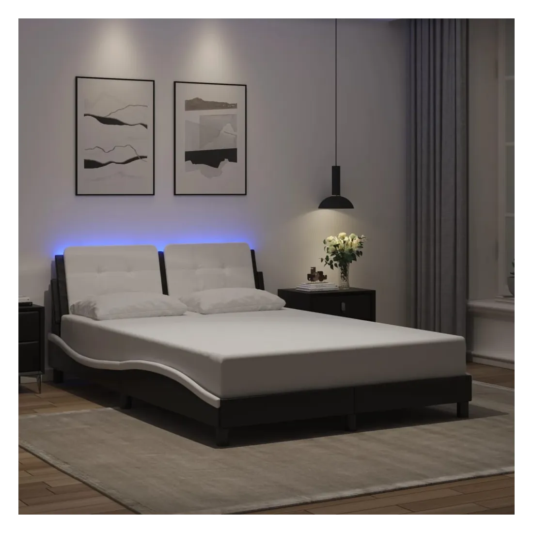 Obtenez une meilleure nuit de sommeil reposante grâce à ce cadre de lit avec lumières LED ! Il est un supplément accueillant à toute chambre à coucher. Similicuir durable : le similicuir de qualité supérieure est un matériau très durable. Il est résistant aux taches, ce qui le rend facile à nettoyer avec un chiffon humide. La surface lisse donne également un aspect luxueux et la beauté du cuir véritable.Lattes de contreplaqué : les lattes de contreplaqué assurent une bonne répartition du poids, garantissant que le matelas reste en place à chaque torsion de votre corps pendant le sommeil.Excellent soutien : la tête de lit vous offre un excellent soutien du dos lorsque vous êtes assis dans votre lit pour lire ou regarder la télévision.Bande LED colorée : apportez de la gaieté dans l'obscurité avec des lumières LED colorées ! Les bandes auto-agrippantes situées à l'arrière du coussin de la tête de lit peuvent être utilisées pour fixer les lumières LED.Design latéral ondulé : l’aspect ondulé du cadre de lit est élégant et sophistiqué, ajoutant une touche moderne et élégante à votre décor, ce qui en fait le point central de votre chambre à coucher. Bon à savoir :Un matelas n'est pas inclus avec ce lit. Nous offrons une sélection variée de matelas. Vous pouvez consulter notre boutique pour trouver un matelas assorti.Ce produit est doté d'un connecteur USB qui nécessite une source d'alimentation USB de 5V certifiée (non incluse).