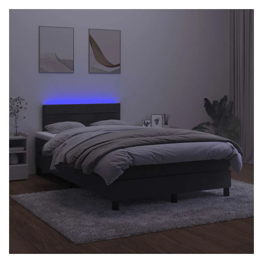 Utilisez ce sommier tapissier avec matelas et LED pour profiter d'un sommeil réparateur ! C'est le point central de votre chambre à coucher. Velours doux : le velours est un tissu doux et luxueux qui se reconnaît à son tas dense de fibres uniformément coupées qui ont une touche lisse. Le tissu en velours présente un toucher doux distinctif, ce qui le rend confortable au toucher.Tête de lit pratique : la tête de lit est réglable en hauteur selon vos préférences. La tête de lit vous offre un excellent soutien du dos lorsque vous êtes assis dans votre lit pour lire ou regarder la télévision.Bande LED colorée : apportez de l'éclairage dans l'obscurité avec des lumières LED colorées !Matelas à ressorts ensachés : le ressort ensaché individuel intégré est connu pour sa très haute qualité tout en assurant un haut niveau de durabilité et d'adaptabilité. Il peut absorber efficacement le bruit et les chocs causés par les sauts et les rotations.Protège-matelas doux pour la peau : le protège-matelas est recouvert d'un tissu résistant et doux pour la peau, ce qui le rend souple et confortable. Bon à savoir :Pour des raisons d'hygiène, le matelas ne peut pas être retourné si l'emballage est retiré ou ouvert.Seule la partie avec un symbole de ciseaux peut être coupée et seule la partie avec l'USB continuera à fonctionner comme avant.Ce produit est doté d'un connecteur USB qui nécessite une source d'alimentation USB de 5V certifiée (non incluse).