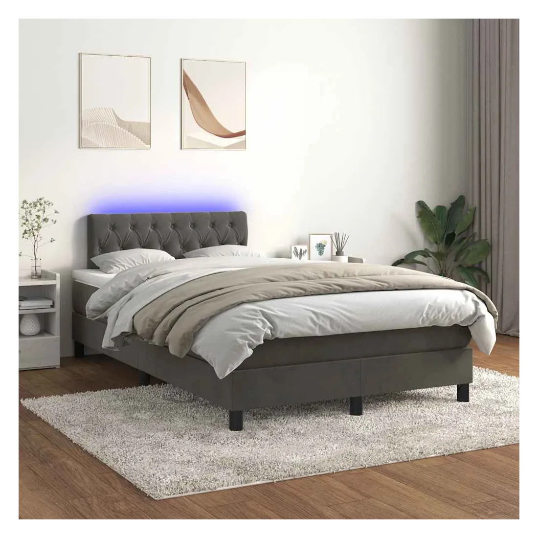 Utilisez ce sommier tapissier avec matelas et LED pour profiter d'un sommeil réparateur ! C'est le point central de votre chambre à coucher. Velours doux : le velours est un tissu doux et luxueux qui se reconnaît à son tas dense de fibres uniformément coupées qui ont une touche lisse. Le tissu en velours présente un toucher doux distinctif, ce qui le rend confortable au toucher.Tête de lit pratique : la tête de lit est réglable en hauteur selon vos préférences. La tête de lit vous offre un excellent soutien du dos lorsque vous êtes assis dans votre lit pour lire ou regarder la télévision.Bande LED colorée : apportez de l'éclairage dans l'obscurité avec des lumières LED colorées !Matelas à ressorts ensachés : le ressort ensaché individuel intégré est connu pour sa très haute qualité tout en assurant un haut niveau de durabilité et d'adaptabilité. Il peut absorber efficacement le bruit et les chocs causés par les sauts et les rotations.Protège-matelas doux pour la peau : le protège-matelas est recouvert d'un tissu résistant et doux pour la peau, ce qui le rend souple et confortable. Bon à savoir :Pour des raisons d'hygiène, le matelas ne peut pas être retourné si l'emballage est retiré ou ouvert.Seule la partie avec un symbole de ciseaux peut être coupée et seule la partie avec l'USB continuera à fonctionner comme avant.Ce produit est doté d'un connecteur USB qui nécessite une source d'alimentation USB de 5V certifiée (non incluse).