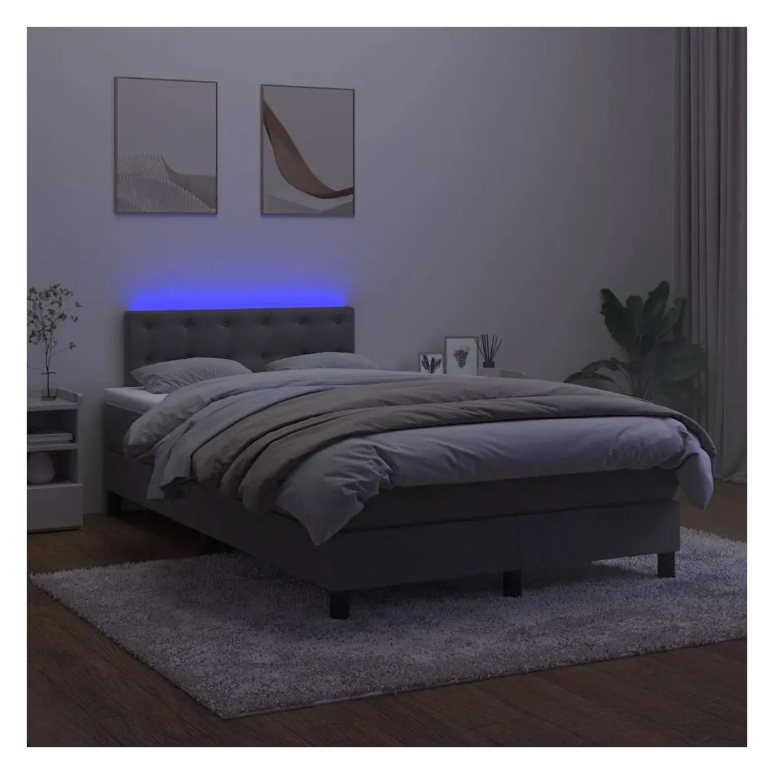 Utilisez ce sommier tapissier avec matelas et LED pour profiter d'un sommeil réparateur ! C'est le point central de votre chambre à coucher. Velours doux : le velours est un tissu doux et luxueux qui se reconnaît à son tas dense de fibres uniformément coupées qui ont une touche lisse. Le tissu en velours présente un toucher doux distinctif, ce qui le rend confortable au toucher.Tête de lit pratique : la tête de lit est réglable en hauteur selon vos préférences. La tête de lit vous offre un excellent soutien du dos lorsque vous êtes assis dans votre lit pour lire ou regarder la télévision.Bande LED colorée : apportez de l'éclairage dans l'obscurité avec des lumières LED colorées !Matelas à ressorts ensachés : le ressort ensaché individuel intégré est connu pour sa très haute qualité tout en assurant un haut niveau de durabilité et d'adaptabilité. Il peut absorber efficacement le bruit et les chocs causés par les sauts et les rotations.Protège-matelas doux pour la peau : le protège-matelas est recouvert d'un tissu résistant et doux pour la peau, ce qui le rend souple et confortable. Bon à savoir :Pour des raisons d'hygiène, le matelas ne peut pas être retourné si l'emballage est retiré ou ouvert.Seule la partie avec un symbole de ciseaux peut être coupée et seule la partie avec l'USB continuera à fonctionner comme avant.Ce produit est doté d'un connecteur USB qui nécessite une source d'alimentation USB de 5V certifiée (non incluse).