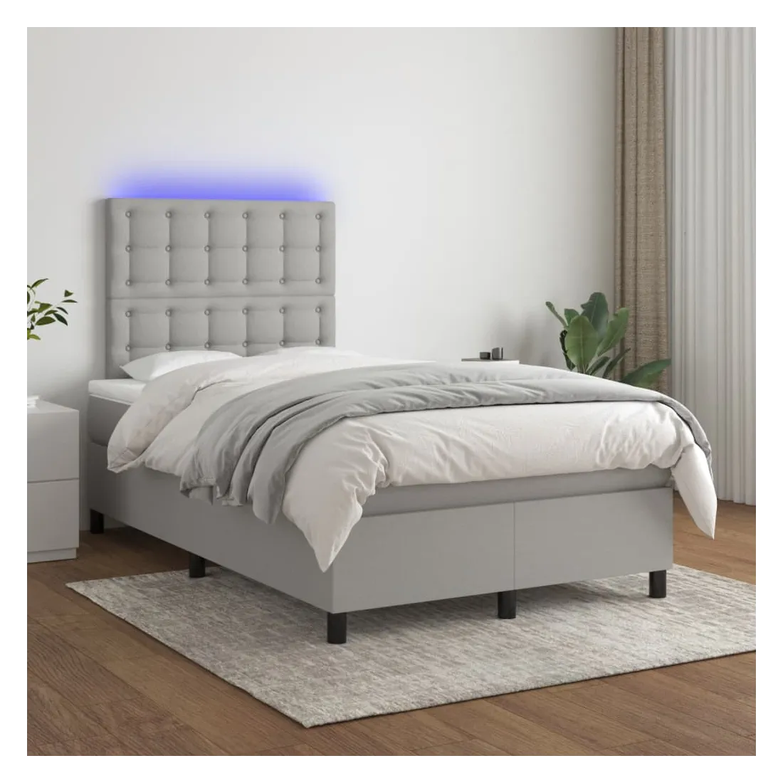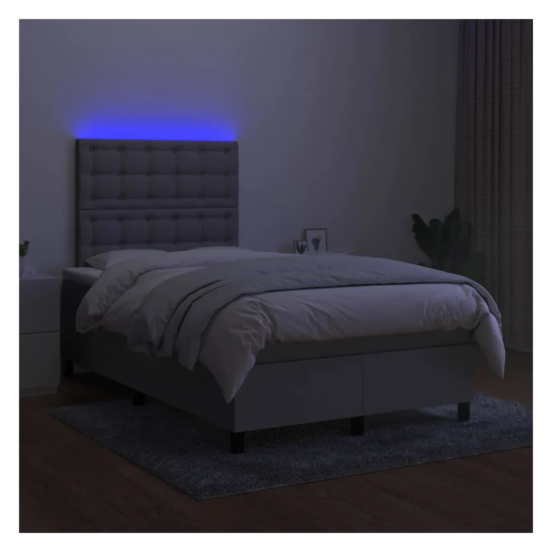 Utilisez ce sommier tapissier avec matelas et LED pour profiter d'un sommeil réparateur ! C'est le point central de votre chambre à coucher. Tissu durable : le tissu présente un aspect simple et épuré, et il est respirant et durable.Tête de lit pratique : la tête de lit est réglable en hauteur selon vos préférences. La tête de lit vous offre un excellent soutien du dos lorsque vous êtes assis dans votre lit pour lire ou regarder la télévision.Bande LED colorée : apportez de l'éclairage dans l'obscurité avec des lumières LED colorées !Matelas à ressorts ensachés : le ressort ensaché individuel intégré est connu pour sa très haute qualité tout en assurant un haut niveau de durabilité et d'adaptabilité. Il peut absorber efficacement le bruit et les chocs causés par les sauts et les rotations.Protège-matelas doux pour la peau : le protège-matelas est recouvert d'un tissu résistant et doux pour la peau, ce qui le rend souple et confortable. Bon à savoir :Pour des raisons d'hygiène, le matelas ne peut pas être retourné si l'emballage est retiré ou ouvert.Seule la partie avec un symbole de ciseaux peut être coupée et seule la partie avec l'USB continuera à fonctionner comme avant.Ce produit est doté d'un connecteur USB qui nécessite une source d'alimentation USB de 5V certifiée (non incluse).