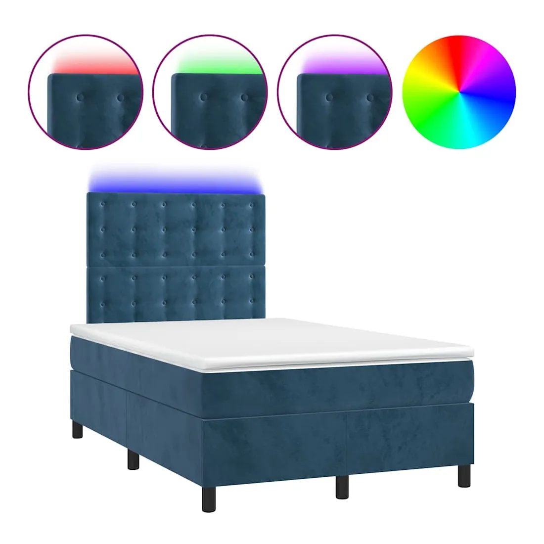 Utilisez ce sommier tapissier avec matelas et LED pour profiter d'un sommeil réparateur ! C'est le point central de votre chambre à coucher. Velours doux : le velours est un tissu doux et luxueux qui se reconnaît à son tas dense de fibres uniformément coupées qui ont une touche lisse. Le tissu en velours présente un toucher doux distinctif, ce qui le rend confortable au toucher.Tête de lit pratique : la tête de lit est réglable en hauteur selon vos préférences. La tête de lit vous offre un excellent soutien du dos lorsque vous êtes assis dans votre lit pour lire ou regarder la télévision.Bande LED colorée : apportez de l'éclairage dans l'obscurité avec des lumières LED colorées !Matelas à ressorts ensachés : le ressort ensaché individuel intégré est connu pour sa très haute qualité tout en assurant un haut niveau de durabilité et d'adaptabilité. Il peut absorber efficacement le bruit et les chocs causés par les sauts et les rotations.Protège-matelas doux pour la peau : le protège-matelas est recouvert d'un tissu résistant et doux pour la peau, ce qui le rend souple et confortable. Bon à savoir :Pour des raisons d'hygiène, le matelas ne peut pas être retourné si l'emballage est retiré ou ouvert.Seule la partie avec un symbole de ciseaux peut être coupée et seule la partie avec l'USB continuera à fonctionner comme avant.Ce produit est doté d'un connecteur USB qui nécessite une source d'alimentation USB de 5V certifiée (non incluse).
