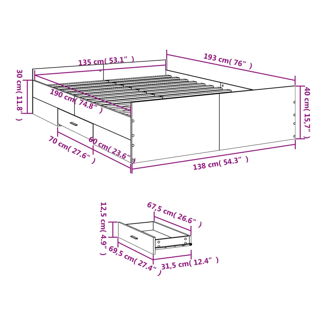 vidaXLAjoutez une touche moderne à votre chambre à coucher avec ce cadre de lit avec tiroirs ! Il apportera une touche pratique et décorative à votre espace de vie. Matériau durable : le cadre de lit est fabriquée en bois d'ingénierie. Le bois d'ingénierie est d'une qualité exceptionnelle avec une surface lisse et présente également de la résistance, de la stabilité et de la résistance à l'humidité.Lattes robustes : les lattes de contreplaqué assurent une bonne répartition du poids, garantissant que le matelas reste en place à chaque torsion de votre corps pendant le sommeil.Fonction de rangement : les tiroirs de lit inclus offrent suffisamment d'espace de rangement pour ranger vos articles essentiels, gardant votre pièce propre et bien rangée. Bon à savoir :Un matelas n'est pas inclus avec ce lit. Nous offrons une sélection variée de matelas. Vous pouvez consulter notre boutique pour trouver un matelas assorti.