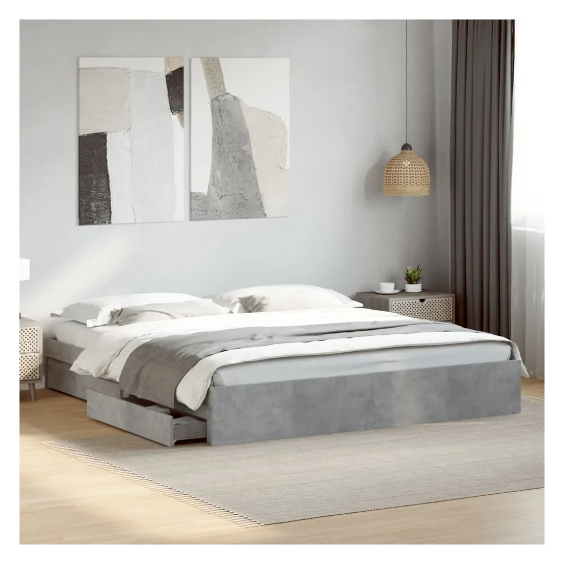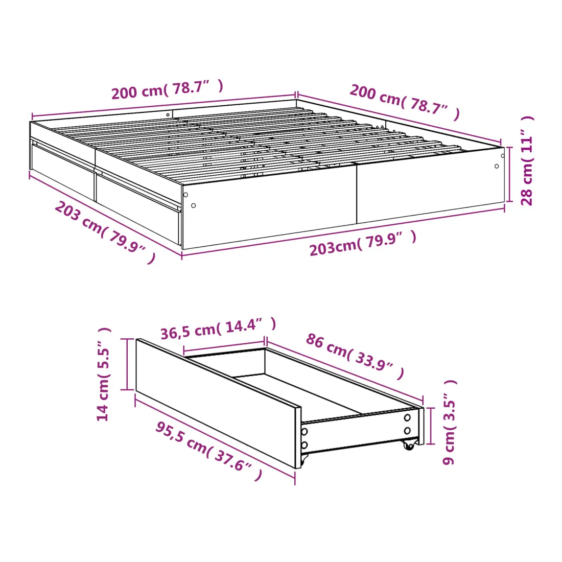 Ajoutez une touche moderne à votre chambre à coucher avec ce cadre de lit avec tiroirs ! Il apportera une touche pratique et décorative à votre espace de vie. Matériau durable : le cadre de lit est fabriquée en bois d'ingénierie. Le bois d'ingénierie est d'une qualité exceptionnelle avec une surface lisse et présente également de la résistance, de la stabilité et de la résistance à l'humidité.Lattes robustes : les lattes de contreplaqué assurent une bonne répartition du poids, garantissant que le matelas reste en place à chaque torsion de votre corps pendant le sommeil.Fonction de rangement : les tiroirs de lit inclus offrent suffisamment d'espace de rangement pour ranger vos articles essentiels, gardant votre pièce propre et bien rangée. Bon à savoir :Un matelas n'est pas inclus avec ce lit. Nous offrons une sélection variée de matelas. Vous pouvez consulter notre boutique pour trouver un matelas assorti.