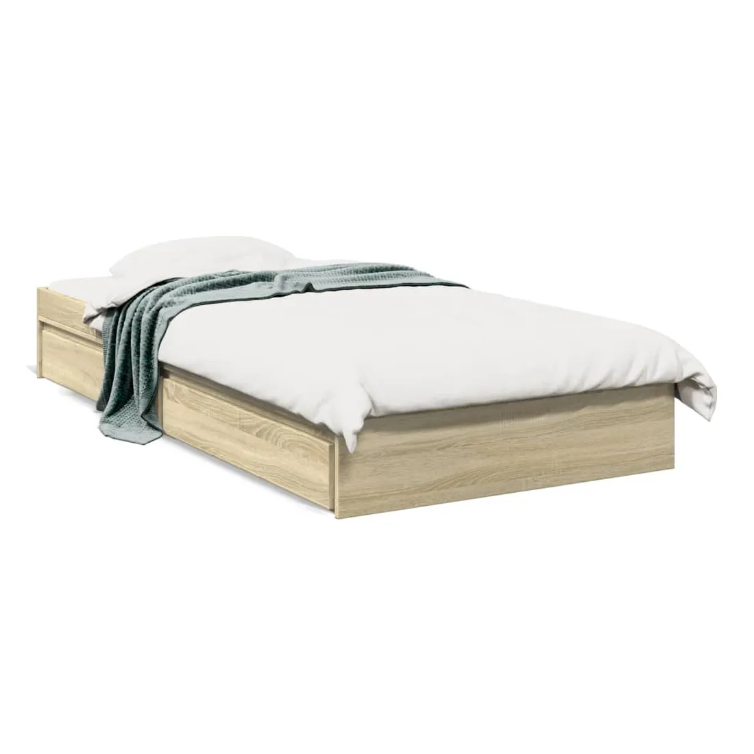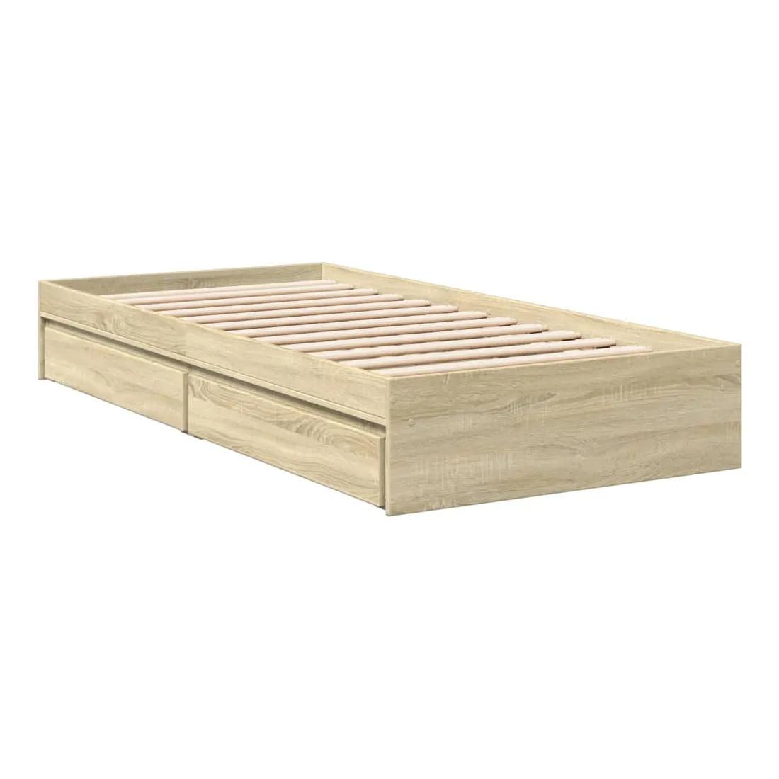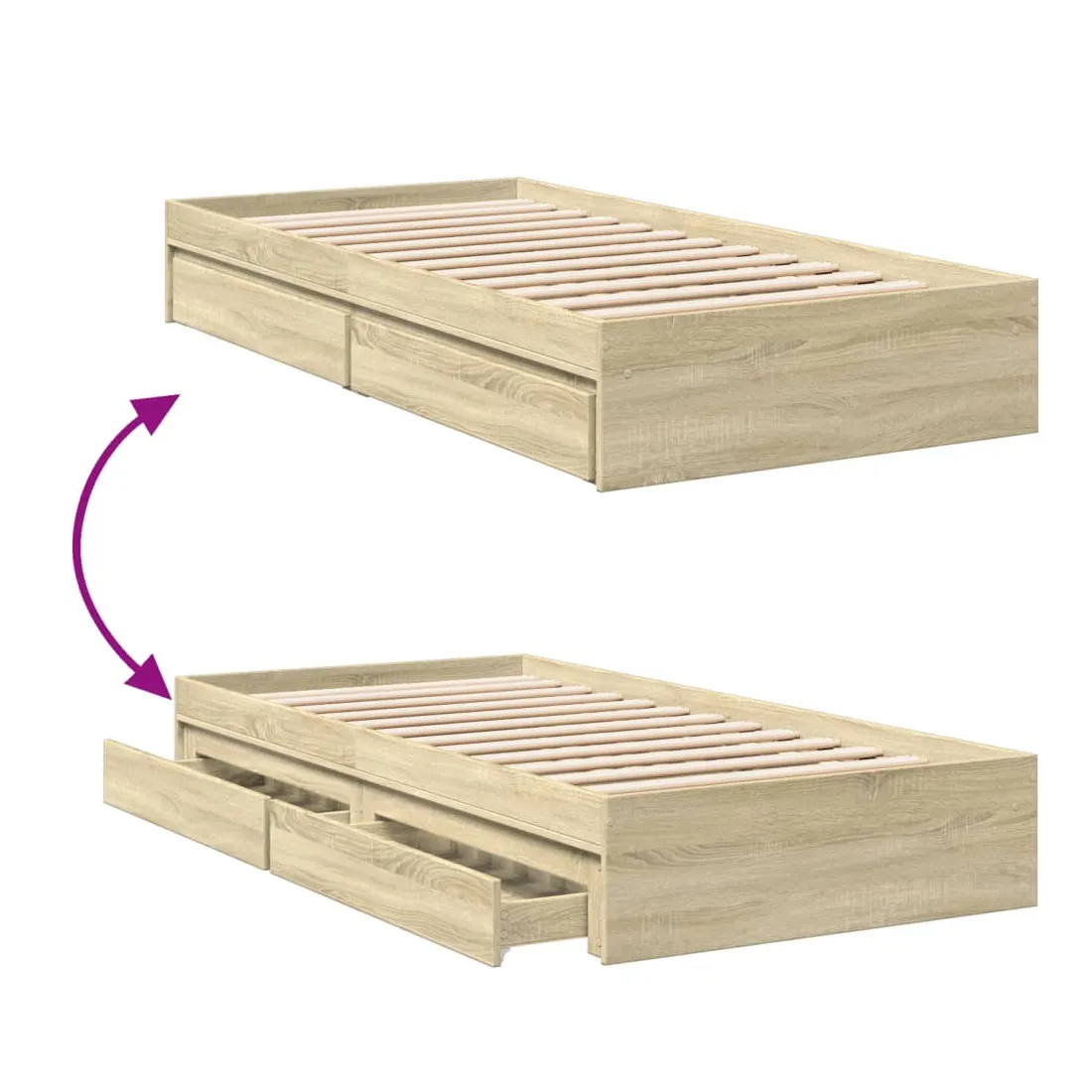 Ajoutez une touche moderne à votre chambre à coucher avec ce cadre de lit avec tiroirs ! Il apportera une touche pratique et décorative à votre espace de vie. Matériau durable : le cadre de lit est fabriquée en bois d'ingénierie. Le bois d'ingénierie est d'une qualité exceptionnelle avec une surface lisse et présente également de la résistance, de la stabilité et de la résistance à l'humidité.Lattes robustes : les lattes de contreplaqué assurent une bonne répartition du poids, garantissant que le matelas reste en place à chaque torsion de votre corps pendant le sommeil.Fonction de rangement : les tiroirs de lit inclus offrent suffisamment d'espace de rangement pour ranger vos articles essentiels, gardant votre pièce propre et bien rangée. Bon à savoir :Un matelas n'est pas inclus avec ce lit. Nous offrons une sélection variée de matelas. Vous pouvez consulter notre boutique pour trouver un matelas assorti.