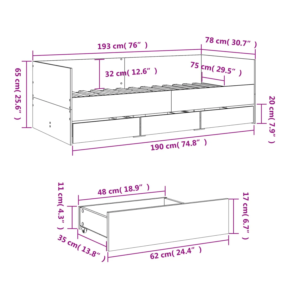 Ce lit de repos 2 en 1 avec tiroirs, servant à la fois de canapé et de lit, constitue un ajout pratique et accrocheur à votre salon ou chambre à coucher. Lit de repos polyvalent : le canapé-lit fonctionne comme un canapé pendant la journée et se transforme facilement en lit double la nuit en retirant le lit gigogne, offrant une solution pratique pour accueillir des invités et maximiser l'espace. Grand espace de rangement : ce lit d'appoint dispose de 3 tiroirs à roulettes qui offrent suffisamment d'espace pour ranger vos vêtements, chaussettes, jouets, coussins, etc.Construction solide : ce canapé-lit est doté d'un cadre robuste en bois d'ingénierie. Le bois d'ingénierie est d'une qualité exceptionnelle avec une surface lisse et se caractérise par sa solidité, sa stabilité et sa résistance à l'humidité. Bon à savoir :La livraison comprend uniquement un cadre de lit de jour. Le matelas n'est pas inclus. Vous pouvez consulter notre boutique pour trouver les matelas assortis.