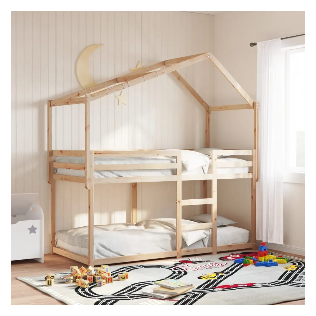 Ce lit superposé pour enfants avec toit est élégant et fonctionnel, ce qui en fait un ajout parfait à toute pièce avec un espace limité. Bois de pin massif : le bois de pin massif est un matériau naturel magnifique. Le bois de pin a un grain droit et les nœuds donnent au matériau son aspect caractéristique et rustique.Design sûr : le lit surélevé est conçu dans un souci de sécurité. Il comprend des garde-corps qui empêchent l'utilisateur de rouler pendant son sommeil.Lattes de contreplaqué : les lattes de contreplaqué assurent une bonne répartition du poids, garantissant que le matelas reste en place à chaque torsion de votre corps pendant le sommeil.Très amusant : en combinant le toit avec le lit de votre enfant, vous pouvez créer une cachette qui permettra à votre enfant de s'amuser à l'heure du coucher. Cette addition innovante non seulement sera un point focal passionnant, mais aussi apportera de la fantaisie et de l'amusement dans la chambre d'enfant.Convient aux espaces limités : le cadre de lit est un excellent choix pour toute pièce dont l'espace est limité, il fournit deux lits individuels avec un design compact.Porte latérale ouverte : le toit est doté d'une porte latérale ouverte qui permet à vos enfants d'entrer et de sortir facilement du lit. Bon à savoir :Un matelas n'est pas inclus avec ce lit. Nous offrons une sélection variée de matelas. Vous pouvez consulter notre boutique pour trouver un matelas assorti.