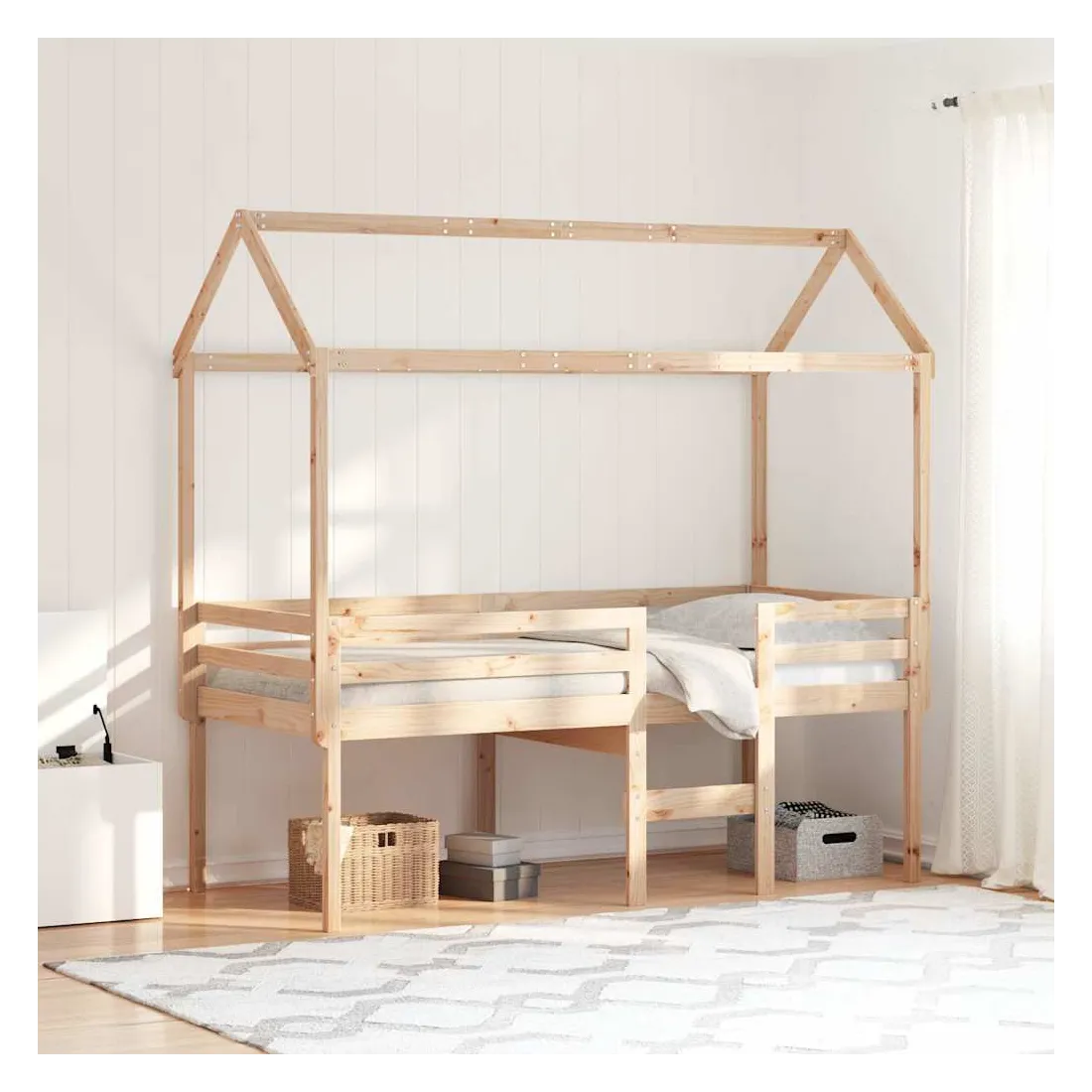 Ce lit mezzanine, dont la polyvalence est au cœur de sa conception, allie à la perfection style moderne et fonctionnalité. Il est idéal pour les petites chambres. Bois de pin massif : Le bois de pin massif est un magnifique matériau naturel. Son grain droit et ses nœuds lui confèrent un aspect rustique caractéristique.Fonctionnalité pratique : Le lit mezzanine permet d'optimiser l'espace au sol. Vous pouvez l'associer à un rideau de jeu, un matelas de jeu et un panneau de rangement pour créer un coin jeux, ou utiliser l'espace en dessous pour ranger des affaires. Les lattes en contreplaqué offrent un soutien supplémentaire au matelas et prolongent sa durée de vie en absorbant la majeure partie des contraintes et du poids.Sécurité garantie : L'échelle intégrée facilite l'accès au lit, et les barrières de sécurité assurent la sécurité pendant le sommeil.Un espace ludique : En combinant le toit avec le lit, vous pouvez créer une véritable cachette. Cet ajout novateur ne sera pas seulement un point focal captivant, mais apportera également émerveillement et enthousiasme à la chambre.Porte latérale ouverte : Le toit est doté d'une porte latérale ouverte, facilitant l'accès au lit. Bon à savoir :Le matelas n'est pas inclus avec ce lit. Nous proposons une large sélection de matelas. Vous pouvez consulter notre boutique pour trouver un matelas assorti.