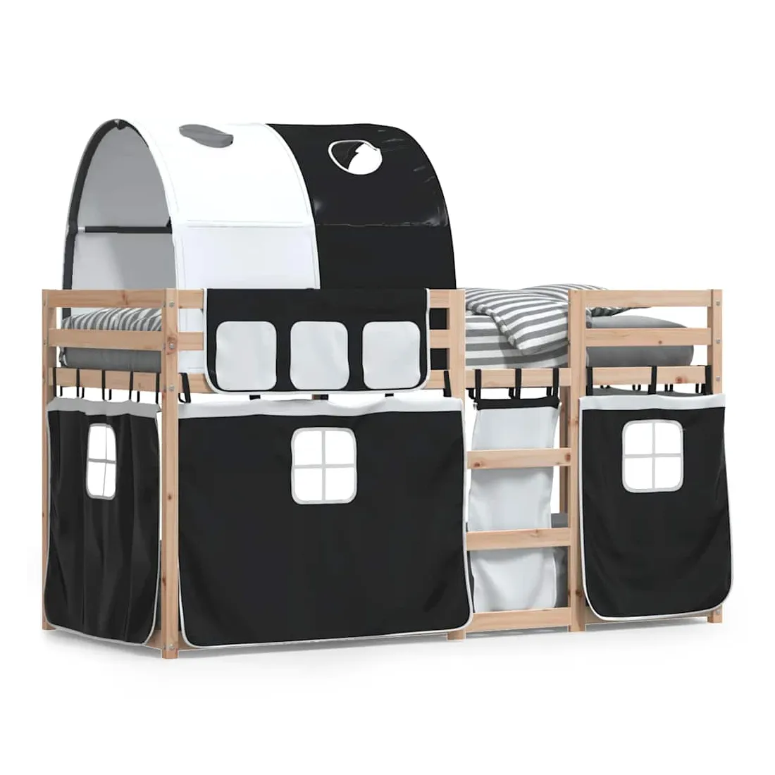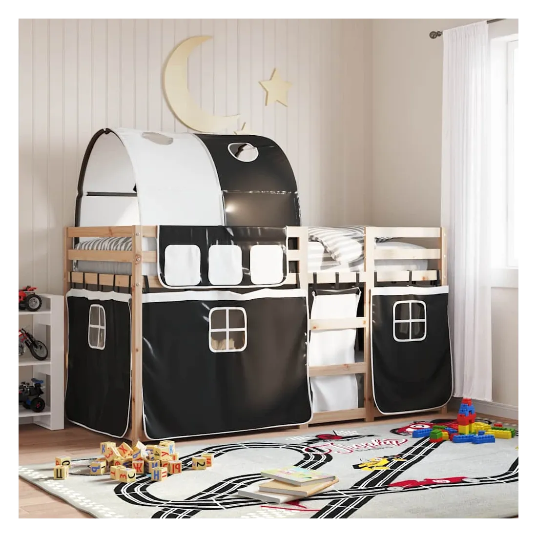 Ce lit superposé en bois est élégant et fonctionnel, ce qui en fait un supplément parfait à toute pièce dont l'espace est limité. Bois de pin massif : ce lit superposé est fabriqué en bois de pin massif pour plus de stabilité et de durabilité. Le bois de pin a un grain droit et les nœuds donnent au matériau son aspect rustique caractéristique.Très amusant : vous pouvez combiner les rideaux avec le lit superposé bas pour créer la base secrète de votre enfant, ce qui permet de s’amuser à l’heure du coucher et d’ajouter un point d'intérêt à la chambre à coucher !Barrières de sécurité : le lit supérieur est équipé de garde-corps de sécurité sur les 4 côtés, afin que votre enfant puisse dormir sans craindre de tomber.Échelle pratique : ce lit superposé double est doté d'une échelle qui permet de monter et de descendre dans et du lit en toute simplicité. Elle apporte également de la joie et transforme leur chambre en terrain de jeu intérieur. Bon à savoir :Un matelas n'est pas inclus avec ce lit. Nous offrons une sélection variée de matelas. Vous pouvez consulter notre boutique pour trouver un matelas assorti. Attention :Pour éviter qu'il ne bascule, ce produit doit être utilisé avec le dispositif de fixation murale fourni.
