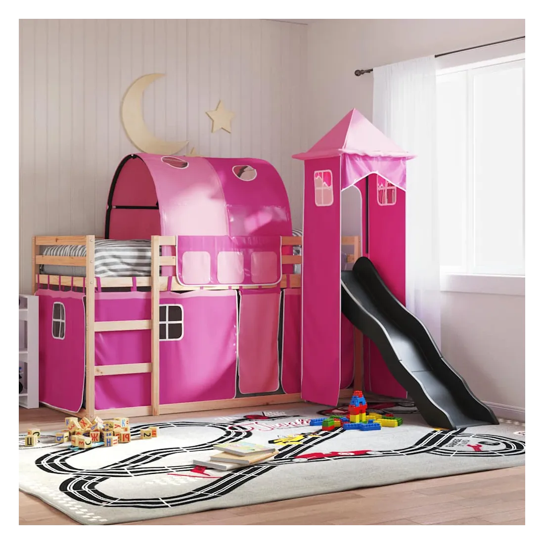 Ce lit superposé en bois est élégant et fonctionnel, ce qui en fait un supplément parfait à toute pièce dont l'espace est limité. Bois de pin massif : ce lit superposé est fabriqué en bois de pin massif pour plus de stabilité et de durabilité. Le bois de pin a un grain droit et les nœuds donnent au matériau son aspect rustique caractéristique.Très amusant : vous pouvez combiner les rideaux avec le lit superposé bas pour créer la base secrète de votre enfant, ce qui permet de s’amuser à l’heure du coucher et d’ajouter un point d'intérêt à la chambre à coucher !Barrières de sécurité : le lit supérieur est équipé de garde-corps de sécurité sur les 4 côtés, afin que votre enfant puisse dormir sans craindre de tomber.Échelle et toboggan pratiques : ce lit superposé est doté d'un toboggan amusant qui apporte de la joie et transforme leur chambre en une aire de jeux intérieure. La combinaison d'une échelle d'escalade et d'un toboggan rend l'heure du coucher plus vivante et plus intéressante pour les enfants.Lattes robustes : les lattes de contreplaqué assurent une bonne répartition du poids, garantissant que le matelas reste en place à chaque torsion de votre corps pendant le sommeil. Bon à savoir :Un matelas n'est pas inclus avec ce lit. Nous offrons une sélection variée de matelas. Vous pouvez consulter notre boutique pour trouver un matelas assorti. Attention :Pour éviter qu'il ne bascule, ce produit doit être utilisé avec le dispositif de fixation murale fourni.