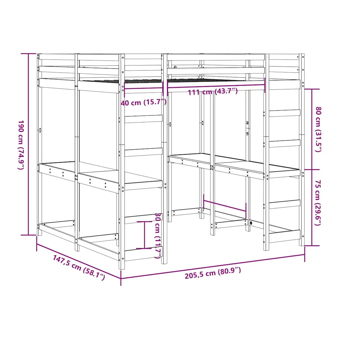 - Hauteur de la zone de couchage à partir du sol : 155 cm