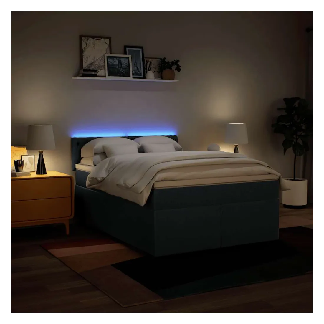 Utilisez ce lit à sommier pour profiter d'une nuit de sommeil réparatrice ! Il vous offre une relaxation maximale et un sommeil agréable. Matériau doux et durable : le tissu en polyester allie douceur, respirabilité et durabilité, vous garantissant un confort et une convivialité ultimes.Matelas à ressorts ensachés : ce matelas à ressorts ensachés comporte des ressorts ensachés individuels qui fonctionnent indépendamment pour offrir un soutien personnalisé en réagissant uniquement à la pression exercée dans chaque zone. Cette conception empêche « l'enroulement » et réduit le transfert de mouvement par rapport aux matelas traditionnels à ressorts ouverts. Chaque ressort ensaché soutient le corps individuellement.Lumières LED pour une ambiance agréable : ce lit est équipé de lumières LED qui peuvent être facilement réglées pour créer un spectacle lumineux personnalisé. Vous pouvez personnaliser les modes, les couleurs et la luminosité pour améliorer l'ambiance de votre espace intérieur.Surmatelas confortable : ce surmatelas améliore le soutien et le confort grâce à sa surface douce et respirante, tout en prolongeant la durée de vie de votre matelas. Sa housse amovible permet un lavage facile, ce qui facilite l'entretien. Bon à savoir :Ce produit est doté d'un connecteur USB qui nécessite une source d'alimentation USB de 5V certifiée (non incluse).Pour des raisons d'hygiène, le matelas ne peut pas être retourné si l'emballage est retiré ou ouvert.Seule la partie avec un symbole de ciseaux peut être coupée et seule la partie avec l'USB continuera à fonctionner comme avant.