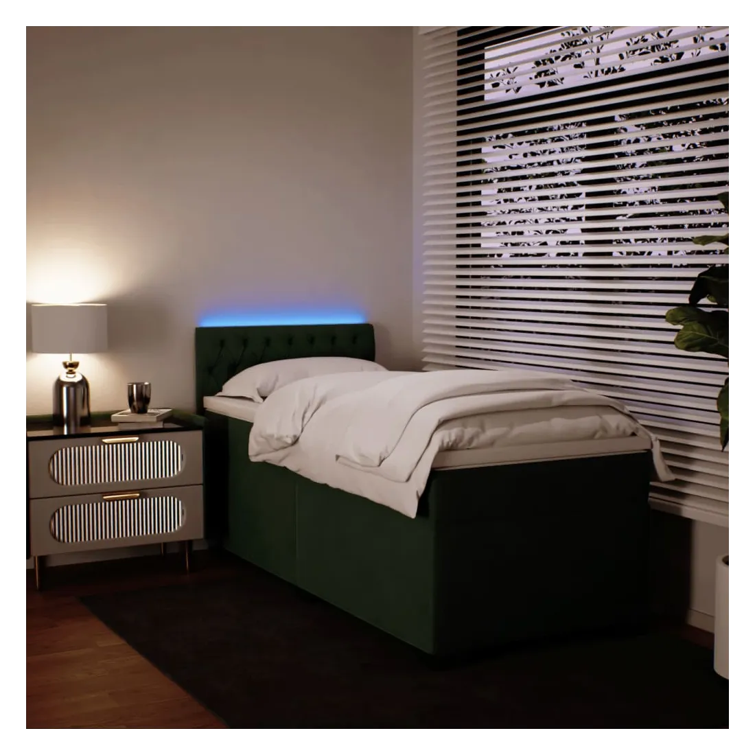 Utilisez ce lit à sommier pour profiter d'une nuit de sommeil réparatrice ! Il vous offre une relaxation maximale et un sommeil agréable. Matériau doux et confortable : le tissu en velours présente une surface douce et lisse qui offre une sensation agréable contre la peau, vous apportant chaleur et confort ultime.Matelas à ressorts ensachés : ce matelas à ressorts ensachés comporte des ressorts ensachés individuels qui fonctionnent indépendamment pour offrir un soutien personnalisé en réagissant uniquement à la pression exercée dans chaque zone. Cette conception empêche « l'enroulement » et réduit le transfert de mouvement par rapport aux matelas traditionnels à ressorts ouverts. Chaque ressort ensaché soutient le corps individuellement.Lumières LED pour une ambiance agréable : ce lit est équipé de lumières LED qui peuvent être facilement réglées pour créer un spectacle lumineux personnalisé. Vous pouvez personnaliser les modes, les couleurs et la luminosité pour améliorer l'ambiance de votre espace intérieur.Surmatelas confortable : ce surmatelas améliore le soutien et le confort grâce à sa surface douce et respirante, tout en prolongeant la durée de vie de votre matelas. Sa housse amovible permet un lavage facile, ce qui facilite l'entretien. Bon à savoir :Ce produit est doté d'un connecteur USB qui nécessite une source d'alimentation USB de 5V certifiée (non incluse).Pour des raisons d'hygiène, le matelas ne peut pas être retourné si l'emballage est retiré ou ouvert.Seule la partie avec un symbole de ciseaux peut être coupée et seule la partie avec l'USB continuera à fonctionner comme avant.