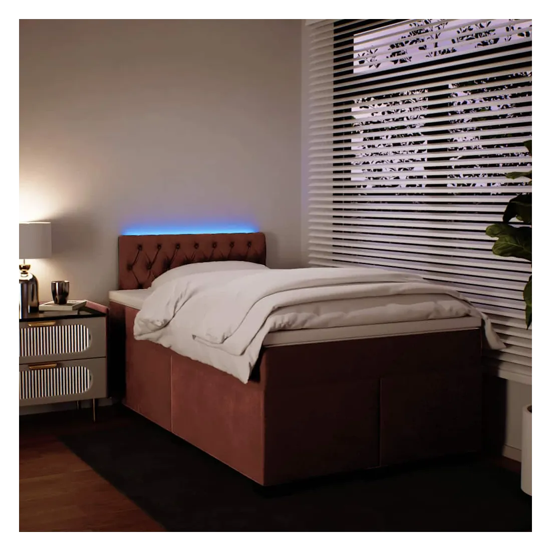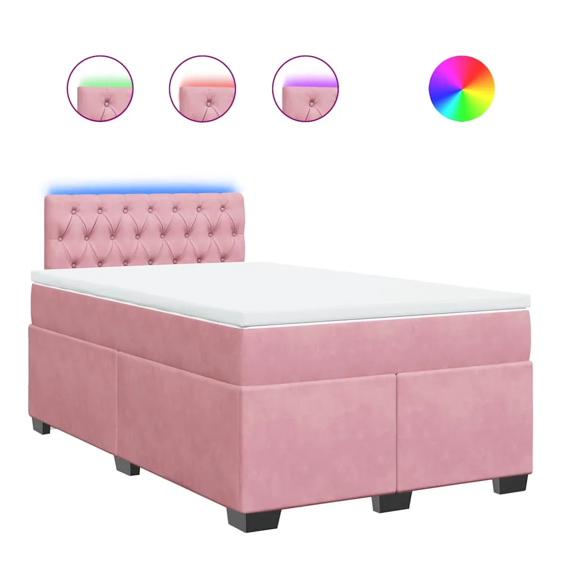 Utilisez ce lit à sommier pour profiter d'une nuit de sommeil réparatrice ! Il vous offre une relaxation maximale et un sommeil agréable. Matériau doux et confortable : le tissu en velours présente une surface douce et lisse qui offre une sensation agréable contre la peau, vous apportant chaleur et confort ultime.Matelas à ressorts ensachés : ce matelas à ressorts ensachés comporte des ressorts ensachés individuels qui fonctionnent indépendamment pour offrir un soutien personnalisé en réagissant uniquement à la pression exercée dans chaque zone. Cette conception empêche « l'enroulement » et réduit le transfert de mouvement par rapport aux matelas traditionnels à ressorts ouverts. Chaque ressort ensaché soutient le corps individuellement.Lumières LED pour une ambiance agréable : ce lit est équipé de lumières LED qui peuvent être facilement réglées pour créer un spectacle lumineux personnalisé. Vous pouvez personnaliser les modes, les couleurs et la luminosité pour améliorer l'ambiance de votre espace intérieur.Surmatelas confortable : ce surmatelas améliore le soutien et le confort grâce à sa surface douce et respirante, tout en prolongeant la durée de vie de votre matelas. Sa housse amovible permet un lavage facile, ce qui facilite l'entretien. Bon à savoir :Ce produit est doté d'un connecteur USB qui nécessite une source d'alimentation USB de 5V certifiée (non incluse).Pour des raisons d'hygiène, le matelas ne peut pas être retourné si l'emballage est retiré ou ouvert.Seule la partie avec un symbole de ciseaux peut être coupée et seule la partie avec l'USB continuera à fonctionner comme avant.