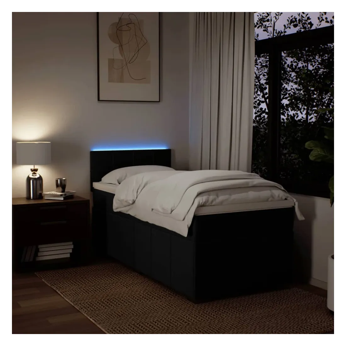 Utilisez ce lit à sommier pour profiter d'une nuit de sommeil réparatrice ! Il vous offre une relaxation maximale et un sommeil agréable. Matériau doux et durable : le tissu en polyester allie douceur, respirabilité et durabilité, vous garantissant un confort et une convivialité ultimes.Matelas à ressorts ensachés : ce matelas à ressorts ensachés comporte des ressorts ensachés individuels qui fonctionnent indépendamment pour offrir un soutien personnalisé en réagissant uniquement à la pression exercée dans chaque zone. Cette conception empêche « l'enroulement » et réduit le transfert de mouvement par rapport aux matelas traditionnels à ressorts ouverts. Chaque ressort ensaché soutient le corps individuellement.Lumières LED pour une ambiance agréable : ce lit est équipé de lumières LED qui peuvent être facilement réglées pour créer un spectacle lumineux personnalisé. Vous pouvez personnaliser les modes, les couleurs et la luminosité pour améliorer l'ambiance de votre espace intérieur.Surmatelas confortable : ce surmatelas améliore le soutien et le confort grâce à sa surface douce et respirante, tout en prolongeant la durée de vie de votre matelas. Sa housse amovible permet un lavage facile, ce qui facilite l'entretien. Bon à savoir :Ce produit est doté d'un connecteur USB qui nécessite une source d'alimentation USB de 5V certifiée (non incluse).Pour des raisons d'hygiène, le matelas ne peut pas être retourné si l'emballage est retiré ou ouvert.Seule la partie avec un symbole de ciseaux peut être coupée et seule la partie avec l'USB continuera à fonctionner comme avant.