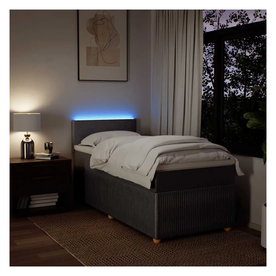 Utilisez ce lit à sommier pour profiter d'une nuit de sommeil réparatrice ! Il vous offre une relaxation maximale et un sommeil agréable. Matériau doux et durable : le tissu en polyester allie douceur, respirabilité et durabilité, vous garantissant un confort et une convivialité ultimes.Matelas à ressorts ensachés : ce matelas à ressorts ensachés comporte des ressorts ensachés individuels qui fonctionnent indépendamment pour offrir un soutien personnalisé en réagissant uniquement à la pression exercée dans chaque zone. Cette conception empêche « l'enroulement » et réduit le transfert de mouvement par rapport aux matelas traditionnels à ressorts ouverts. Chaque ressort ensaché soutient le corps individuellement.Lumières LED pour une ambiance agréable : ce lit est équipé de lumières LED qui peuvent être facilement réglées pour créer un spectacle lumineux personnalisé. Vous pouvez personnaliser les modes, les couleurs et la luminosité pour améliorer l'ambiance de votre espace intérieur.Surmatelas confortable : ce surmatelas améliore le soutien et le confort grâce à sa surface douce et respirante, tout en prolongeant la durée de vie de votre matelas. Sa housse amovible permet un lavage facile, ce qui facilite l'entretien. Bon à savoir :Ce produit est doté d'un connecteur USB qui nécessite une source d'alimentation USB de 5V certifiée (non incluse).Pour des raisons d'hygiène, le matelas ne peut pas être retourné si l'emballage est retiré ou ouvert.Seule la partie avec un symbole de ciseaux peut être coupée et seule la partie avec l'USB continuera à fonctionner comme avant.