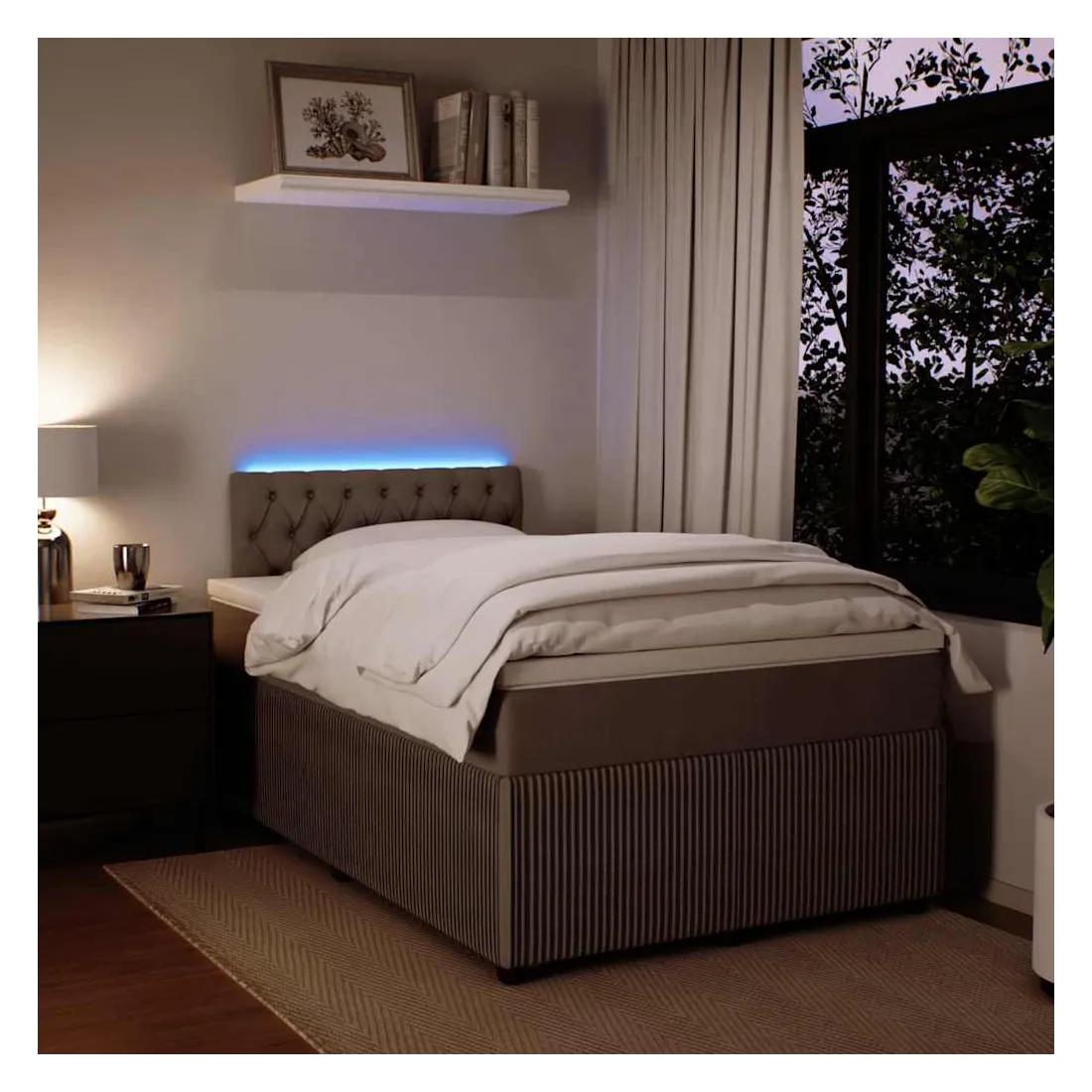 Utilisez ce lit à sommier pour profiter d'une nuit de sommeil réparatrice ! Il vous offre une relaxation maximale et un sommeil agréable. Matériau doux et confortable : le tissu en velours présente une surface douce et lisse qui offre une sensation agréable contre la peau, vous apportant chaleur et confort ultime.Matelas à ressorts ensachés : ce matelas à ressorts ensachés comporte des ressorts ensachés individuels qui fonctionnent indépendamment pour offrir un soutien personnalisé en réagissant uniquement à la pression exercée dans chaque zone. Cette conception empêche « l'enroulement » et réduit le transfert de mouvement par rapport aux matelas traditionnels à ressorts ouverts. Chaque ressort ensaché soutient le corps individuellement.Lumières LED pour une ambiance agréable : ce lit est équipé de lumières LED qui peuvent être facilement réglées pour créer un spectacle lumineux personnalisé. Vous pouvez personnaliser les modes, les couleurs et la luminosité pour améliorer l'ambiance de votre espace intérieur.Surmatelas confortable : ce surmatelas améliore le soutien et le confort grâce à sa surface douce et respirante, tout en prolongeant la durée de vie de votre matelas. Sa housse amovible permet un lavage facile, ce qui facilite l'entretien. Bon à savoir :Ce produit est doté d'un connecteur USB qui nécessite une source d'alimentation USB de 5V certifiée (non incluse).Pour des raisons d'hygiène, le matelas ne peut pas être retourné si l'emballage est retiré ou ouvert.Seule la partie avec un symbole de ciseaux peut être coupée et seule la partie avec l'USB continuera à fonctionner comme avant.
