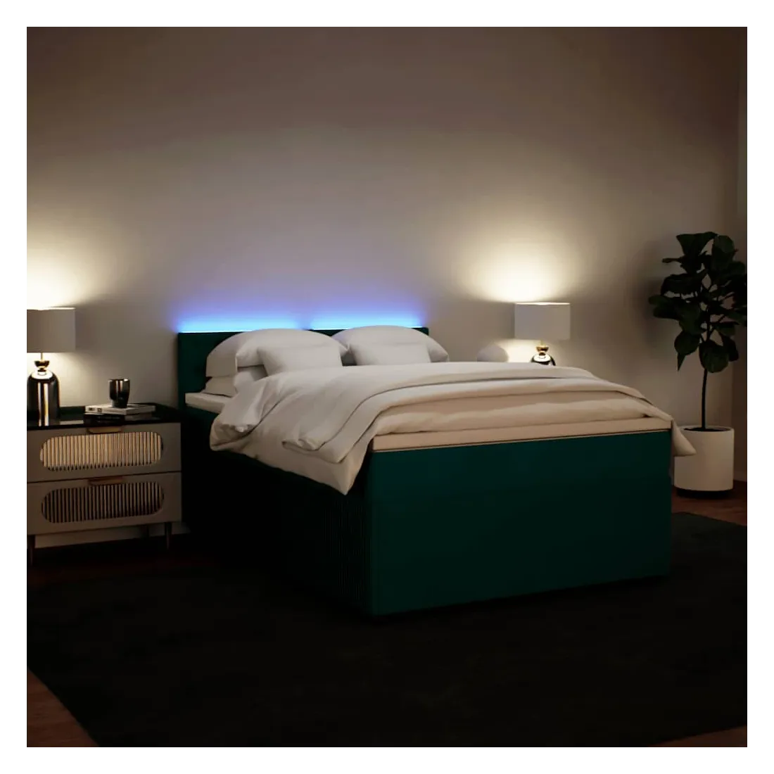 Utilisez ce lit à sommier pour profiter d'une nuit de sommeil réparatrice ! Il vous offre une relaxation maximale et un sommeil agréable. Matériau doux et confortable : le tissu en velours présente une surface douce et lisse qui offre une sensation agréable contre la peau, vous apportant chaleur et confort ultime.Matelas à ressorts ensachés : ce matelas à ressorts ensachés comporte des ressorts ensachés individuels qui fonctionnent indépendamment pour offrir un soutien personnalisé en réagissant uniquement à la pression exercée dans chaque zone. Cette conception empêche « l'enroulement » et réduit le transfert de mouvement par rapport aux matelas traditionnels à ressorts ouverts. Chaque ressort ensaché soutient le corps individuellement.Lumières LED pour une ambiance agréable : ce lit est équipé de lumières LED qui peuvent être facilement réglées pour créer un spectacle lumineux personnalisé. Vous pouvez personnaliser les modes, les couleurs et la luminosité pour améliorer l'ambiance de votre espace intérieur.Surmatelas confortable : ce surmatelas améliore le soutien et le confort grâce à sa surface douce et respirante, tout en prolongeant la durée de vie de votre matelas. Sa housse amovible permet un lavage facile, ce qui facilite l'entretien. Bon à savoir :Ce produit est doté d'un connecteur USB qui nécessite une source d'alimentation USB de 5V certifiée (non incluse).Pour des raisons d'hygiène, le matelas ne peut pas être retourné si l'emballage est retiré ou ouvert.Seule la partie avec un symbole de ciseaux peut être coupée et seule la partie avec l'USB continuera à fonctionner comme avant.