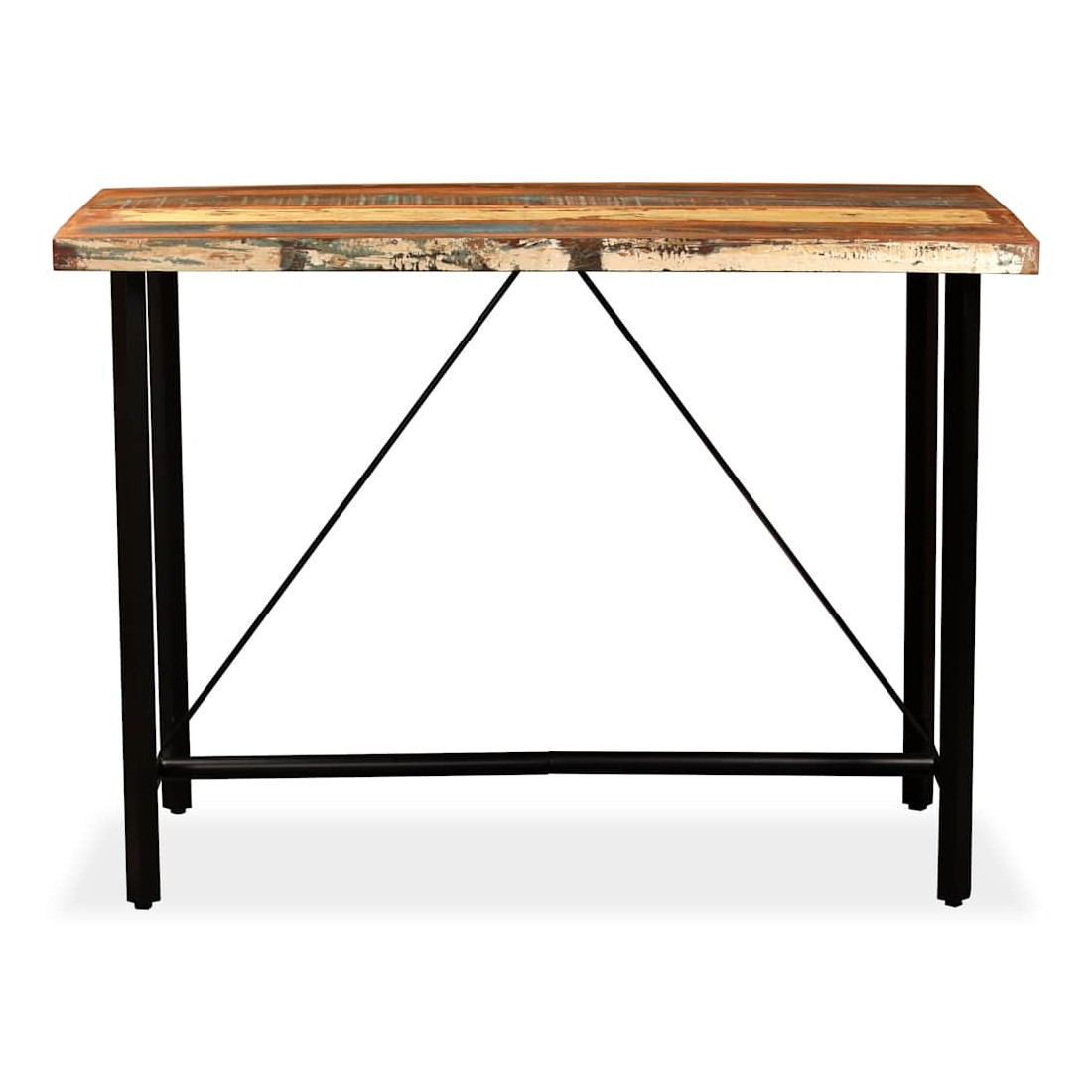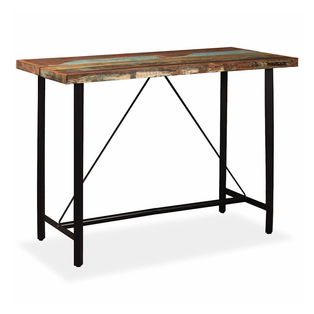 Cet ensemble de bar cool a un style industriel et sera un supplément distinctif à n'importe quelle maison, bar ou restaurant. La table de bar est faite de bois de récupération massif, ce qui signifie qu'elle a les caractéristiques de différents bois comme le teck, le bois de manguier, l'acacia, etc. Le bois de récupération est solide, stable, durable et beau. Des signes d'usure et d'artisanat donnent à chaque pièce un style unique. Il est entièrement fait à la main. Les pieds en acier robuste rendent la table de bar très robuste et durable et s'ajoutent à son style industriel spectaculaire. Remarque importante : Les grains et les couleurs du bois peuvent varier d'une pièce à l'autre, ce qui rend chaque pièce unique ; la livraison est aléatoire. Les tabourets de bar sont recouverts de c