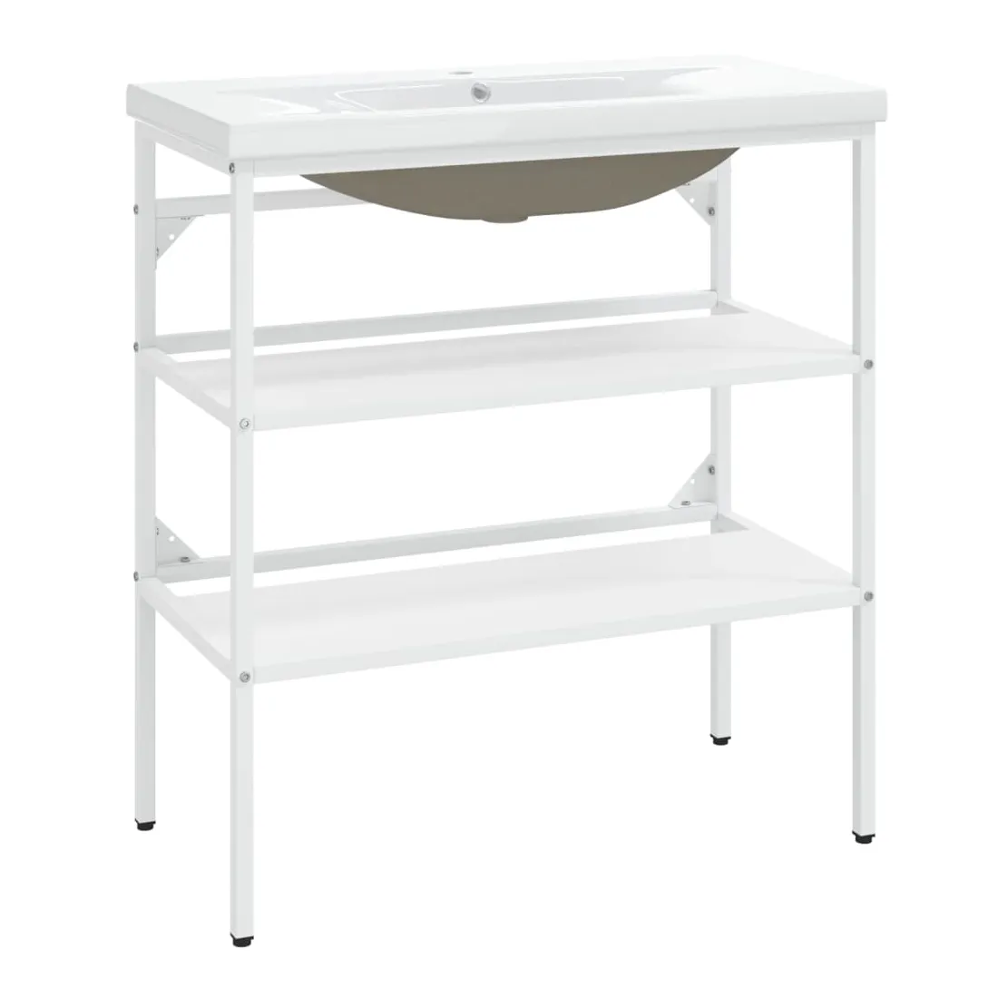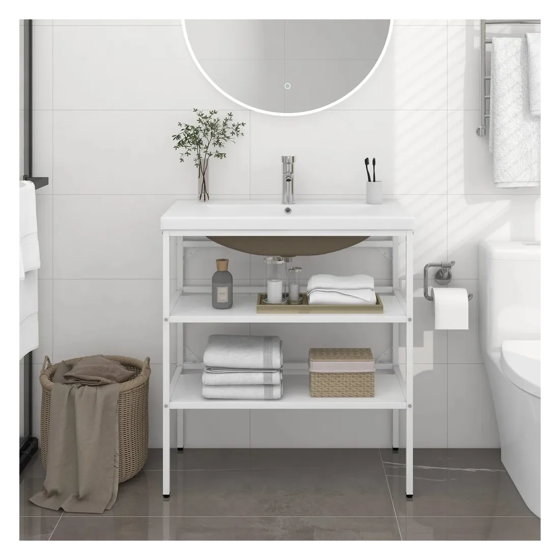 Ce cadre de lavabo de salle de bain avec une vasque à encastrer s'intègre parfaitement à votre salle de bain ou à votre salle d'eau, avec un aspect propre et ordonné. Le support de lavage est fabriqué en fer enduit de poudre, ce qui le rend stable et durable. Ce cadre de lavabo permet d'accéder facilement aux serviettes et aux paniers et crée un espace plus vaste qu'un rangement fermé. Fabriqué en céramique, le bassin peut non seulement servir de récipient pour un usage quotidien mais aussi d'ornement dans votre espace de vie. Grâce à son design tendance et contemporain, ce lavabo s'adaptera à tout décor. Un trop-plein est également prévu pour vidanger l'eau lorsque le lavabo est trop plein. Sa surface émaillée lui confère un design moderne et élégant. De plus, le cadre de lavabo et la