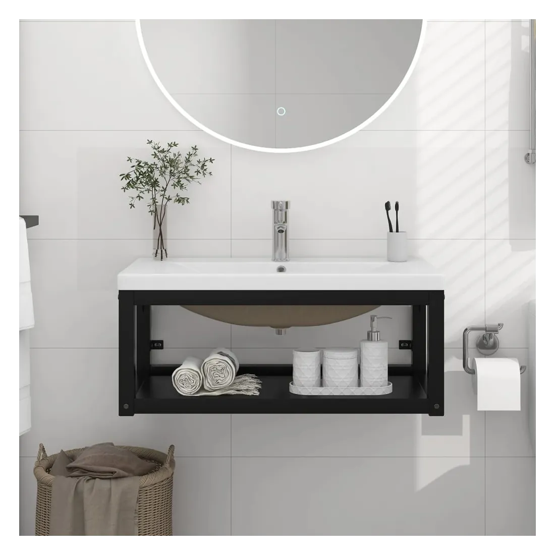 Ce cadre de lavabo de salle de bain mural avec une vasque à encastrer s'intègre parfaitement à votre salle de bain ou à votre salle d'eau, avec un aspect propre et ordonné. Le support de lavage est fabriqué en fer enduit de poudre, ce qui le rend stable et durable. Ce cadre de lavabo permet d'accéder facilement aux serviettes et aux paniers et crée un espace plus vaste qu'un rangement fermé. Fabriqué en céramique, le bassin peut non seulement servir de récipient pour un usage quotidien mais aussi d'ornement dans votre espace de vie. Grâce à son design tendance et contemporain, ce lavabo s'adaptera à tout décor. Un trop-plein est également prévu pour vidanger l'eau lorsque le lavabo est trop plein. Sa surface émaillée lui confère un design moderne et élégant. De plus, le cadre de lavabo et la vasque sont faciles à nettoyer avec un chiffon humide. Remarque : le robinet et le vidange ne sont pas inclus dans la livraison.