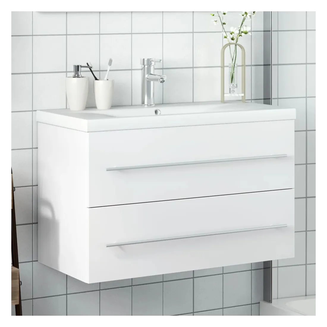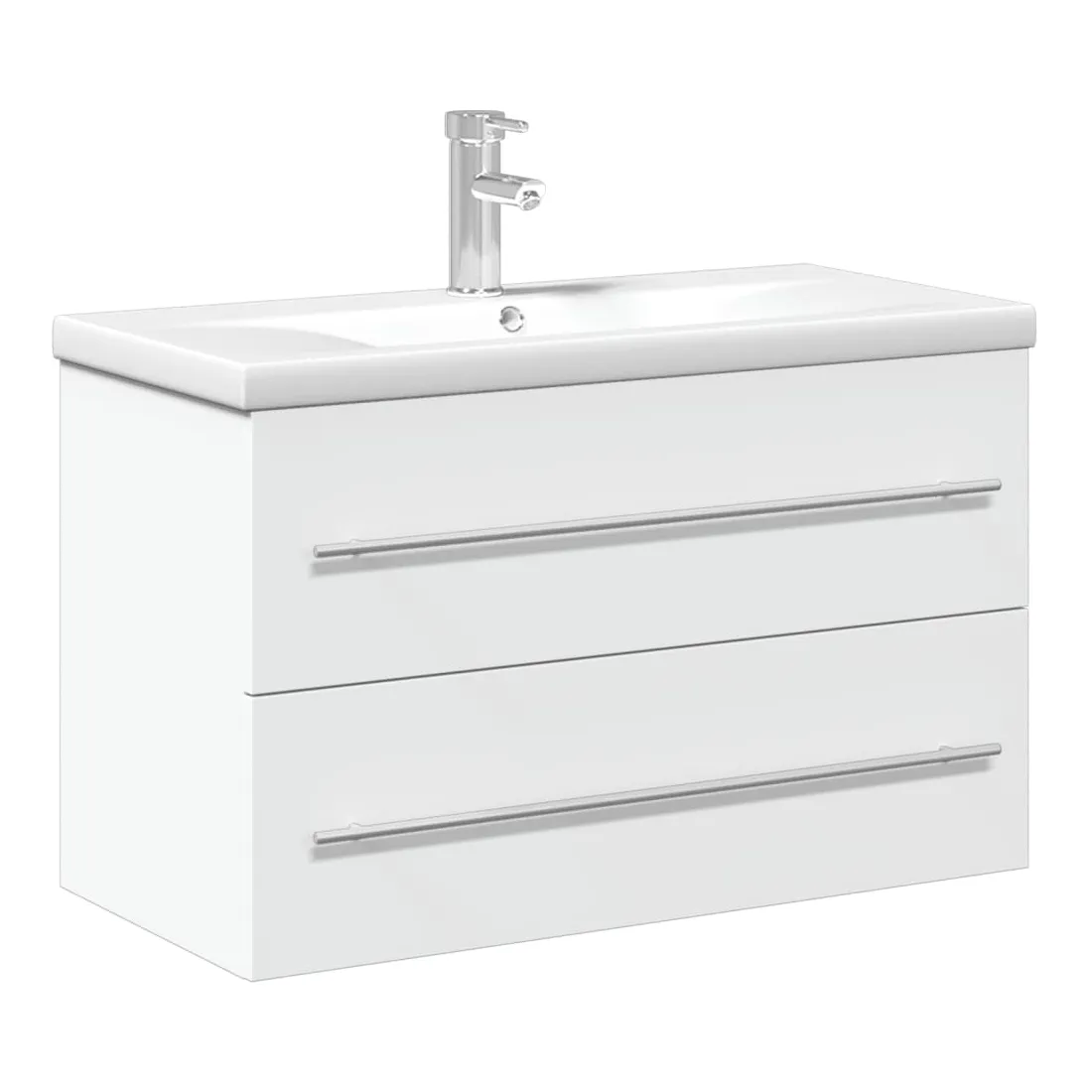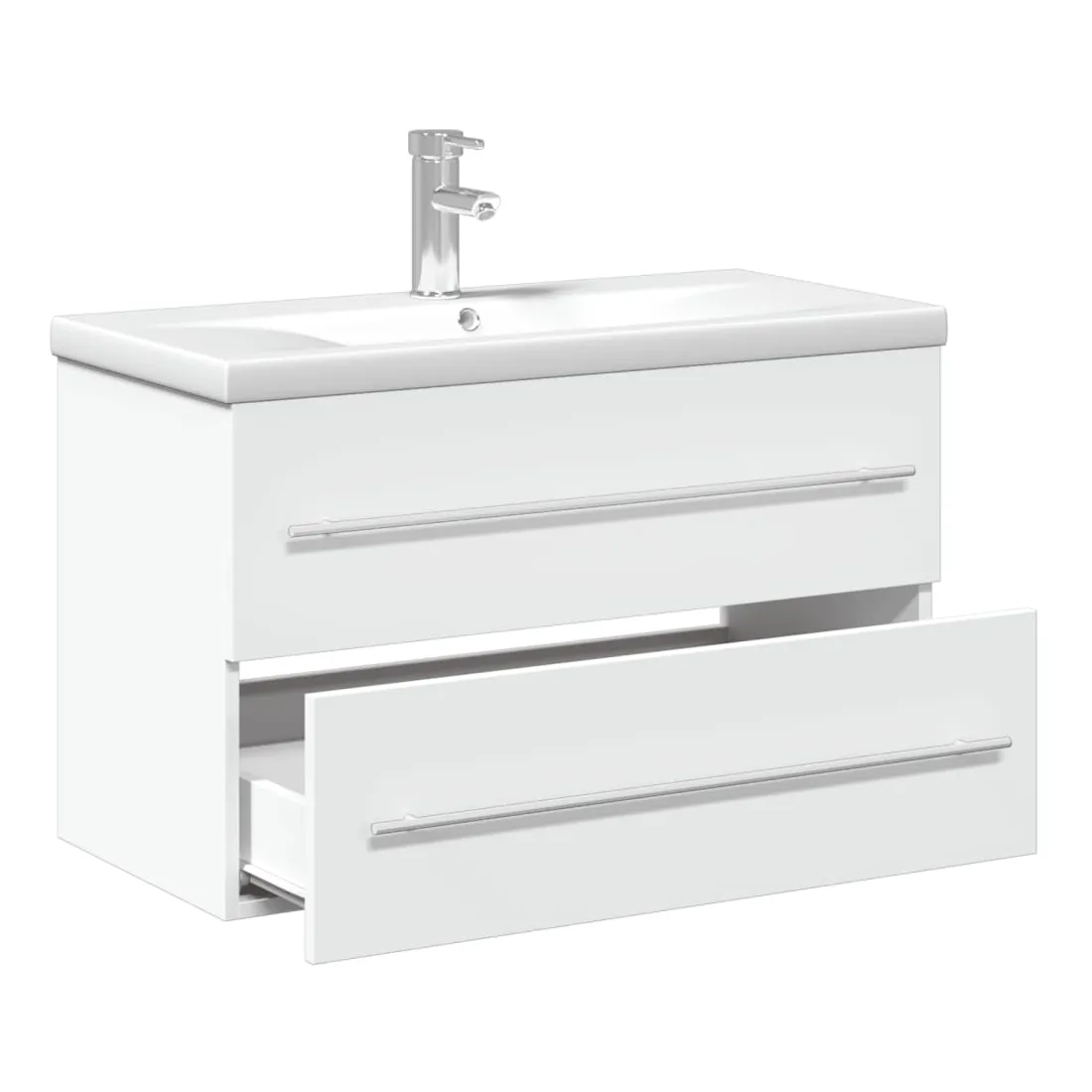 Cet élégant meuble-lavabo de salle de bain avec bassin intégré, avec un espace de rangement spacieux, est un excellent supplément à votre salle de bain, ce qui lui donne une apparence ordonnée et saisissante ! Matériau robuste : le meuble sous évier est fabriqué en bois d'ingénierie, qui est d'une qualité exceptionnelle avec une surface lisse et se caractérise également par sa solidité, stabilité et résistance à l'humidité.Grand espace de rangement : le meuble lavabo de salle de bain dispose de 1 tiroir, offrant un grand espace de rangement pour ranger des articles dans votre salle de bain.Fonction murale : l'armoire de salle de bain peut être fixée au mur pour ajouter de l'espace de stockage supplémentaire. De cette façon, vous pouvez maximiser votre espace au sol et garder la zone propre.Lavabo élégant : le lavabo de la salle de bain est fabriqué en céramique lisse, durable et facile à nettoyer. La surface vitrée apporte un design à la fois moderne et élégant.Trop-plein pratique : le lavabo est équipé d'une option anti-débordement qui permet d'évacuer l'eau lorsqu'il est trop plein. Bon à savoir :Les vis et les chevilles pour l'intérieur du mur ne sont pas incluses. Recherchez et utilisez des vis et des chevilles adaptées à vos murs. Si vous n'êtes pas sûr, demandez conseil à un professionnel. Lisez et suivez attentivement chaque étape des instructions.Le robinet et l'égouttoir à pousser avec fonction de trop-plein sont inclus.Le robinet est un robinet d'eau chaude et froide, et si vous avez besoin d'eau chaude, un chauffe-eau doit être connecté.