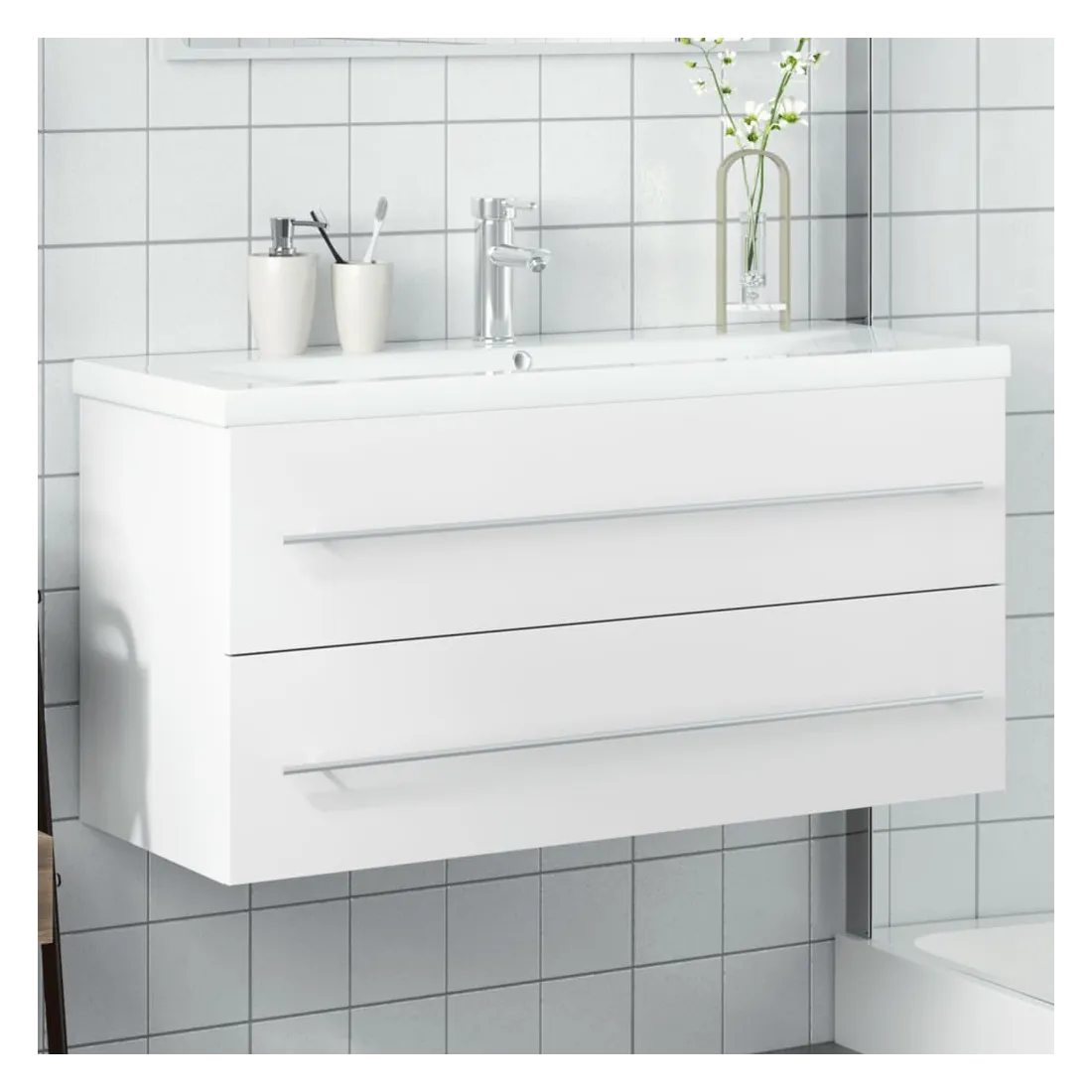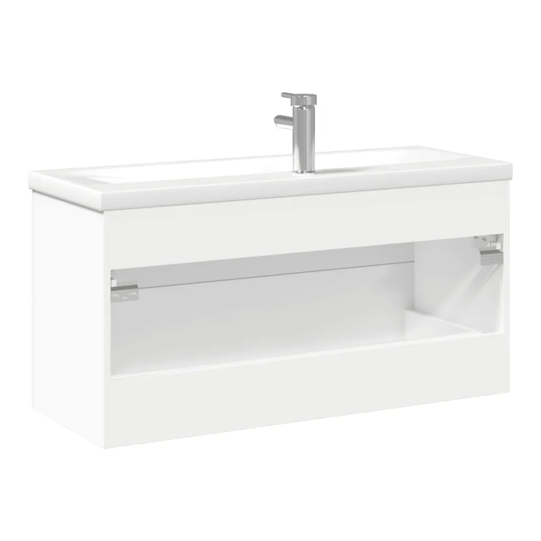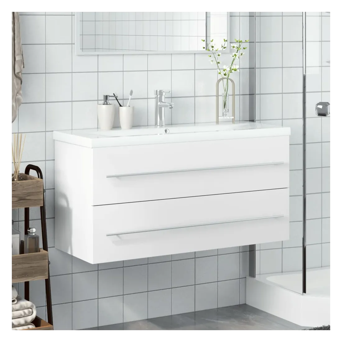 vidaXLCet élégant meuble-lavabo de salle de bain avec bassin intégré, avec un espace de rangement spacieux, est un excellent supplément à votre salle de bain, ce qui lui donne une apparence ordonnée et saisissante ! Matériau robuste : le meuble sous évier est fabriqué en bois d'ingénierie, qui est d'une qualité exceptionnelle avec une surface lisse et se caractérise également par sa solidité, stabilité et résistance à l'humidité.Grand espace de rangement : le meuble lavabo de salle de bain dispose de 1 tiroir, offrant un grand espace de rangement pour ranger des articles dans votre salle de bain.Fonction murale : l'armoire de salle de bain peut être fixée au mur pour ajouter de l'espace de stockage supplémentaire. De cette façon, vous pouvez maximiser votre espace au sol et garder la zone propre.Lavabo élégant : le lavabo de la salle de bain est fabriqué en céramique lisse, durable et facile à nettoyer. La surface vitrée apporte un design à la fois moderne et élégant.Trop-plein pratique : le lavabo est équipé d'une option anti-débordement qui permet d'évacuer l'eau lorsqu'il est trop plein. Bon à savoir :Les vis et les chevilles pour l'intérieur du mur ne sont pas incluses. Recherchez et utilisez des vis et des chevilles adaptées à vos murs. Si vous n'êtes pas sûr, demandez conseil à un professionnel. Lisez et suivez attentivement chaque étape des instructions.Le robinet et l'égouttoir à pousser avec fonction de trop-plein sont inclus.Le robinet est un robinet d'eau chaude et froide, et si vous avez besoin d'eau chaude, un chauffe-eau doit être connecté.