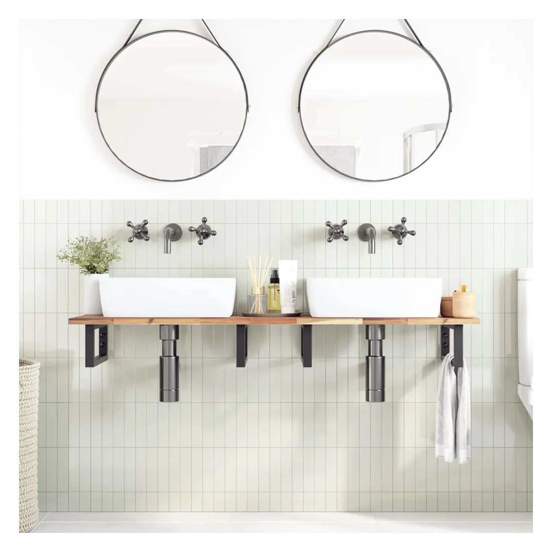 Améliorez votre salle de bain avec ce dessus de meuble-lavabo en bois pour une touche de charme rustique ! Matériau robuste et stable : le bois d'acacia massif est connu pour sa solidité et sa durabilité. Ses couleurs variées et ses grains uniques lui confèrent un aspect attrayant. Avec une excellente stabilité et résistance aux intempéries, il est idéal pour la fabrication de mobilier d'intérieur et d'extérieur.Surface non traitée : ce dessus de table est fabriqué en bois d'acacia non traité, et vous pouvez conserver sa couleur d'origine ou le personnaliser avec de la peinture ou de la laque pour l'adapter à vos préférences.Utilisation polyvalente : ce comptoir multifonctionnel peut être associé à différentes bases pour un large éventail d'utilisations, telles qu'un poste de travail dans la cuisine, un établi dans le garage, une étagère dans la salle de bain ou un bureau.Entretien facile : grâce à sa surface lisse, le plan de travail est facile à nettoyer avec un chiffon humide et nécessite moins d'entretien. Bon à savoir :Chaque article est unique, avec des variations de couleurs et de grains. La livraison est aléatoire, ce qui garantit l'exclusivité et l'individualité de votre produit.