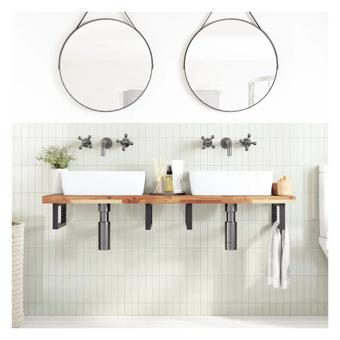 Améliorez votre salle de bain avec ce dessus de meuble-lavabo en bois pour une touche de charme rustique ! Matériau robuste et stable : le bois d'acacia massif est connu pour sa solidité et sa durabilité. Ses couleurs variées et ses grains uniques lui confèrent un aspect attrayant. Avec une excellente stabilité et résistance aux intempéries, il est idéal pour la fabrication de mobilier d'intérieur et d'extérieur.Surface finie à l’huile : ce dessus de meuble est fait de bois d'acacia avec une finition à l'huile qui le rend plus résistant à l'humidité et aux dégâts d'eau, tout en préservant son caractère unique.Utilisation polyvalente : ce comptoir multifonctionnel peut être associé à différentes bases pour un large éventail d'utilisations, telles qu'un poste de travail dans la cuisine, un établi dans le garage, une étagère dans la salle de bain ou un bureau.Entretien facile : grâce à sa surface lisse, le dessus est facile à nettoyer avec un chiffon humide. Bon à savoir :Chaque article est unique, avec des variations de couleurs et de grains. La livraison est aléatoire, ce qui garantit l'exclusivité et l'individualité de votre produit.Il est recommandé de réappliquer une finition à l’huile pour conserver sa qualité et son apparence au moins une fois par an.