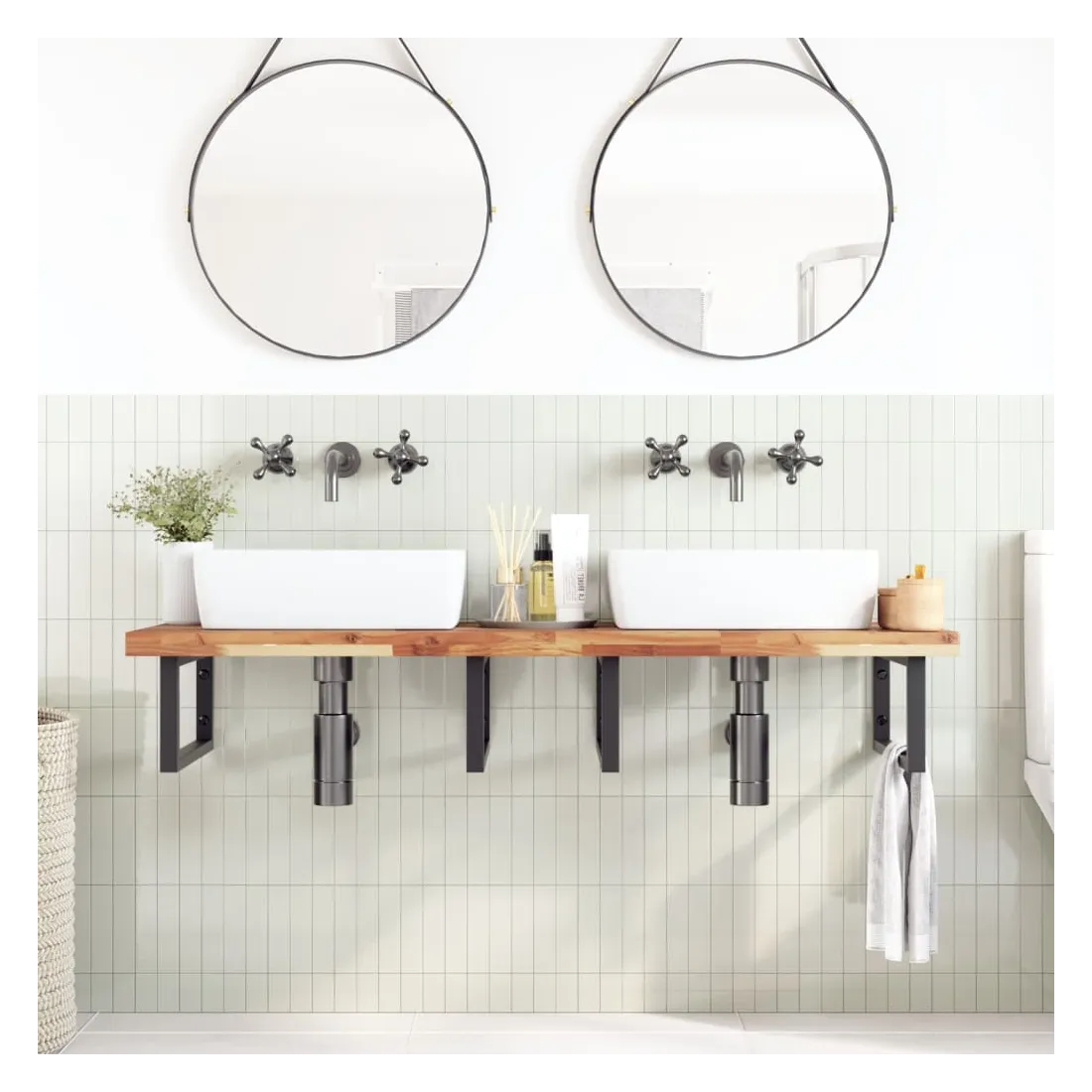 Améliorez votre salle de bain avec ce dessus de meuble-lavabo en bois pour une touche de charme rustique ! Matériau robuste et stable : le bois d'acacia massif est connu pour sa solidité et sa durabilité. Ses couleurs variées et ses grains uniques lui confèrent un aspect attrayant. Avec une excellente stabilité et résistance aux intempéries, il est idéal pour la fabrication de mobilier d'intérieur et d'extérieur.Surface finie à l’huile : ce dessus de meuble est fait de bois d'acacia avec une finition à l'huile qui le rend plus résistant à l'humidité et aux dégâts d'eau, tout en préservant son caractère unique.Utilisation polyvalente : ce comptoir multifonctionnel peut être associé à différentes bases pour un large éventail d'utilisations, telles qu'un poste de travail dans la cuisine, un établi dans le garage, une étagère dans la salle de bain ou un bureau.Entretien facile : grâce à sa surface lisse, le dessus est facile à nettoyer avec un chiffon humide. Bon à savoir :Chaque article est unique, avec des variations de couleurs et de grains. La livraison est aléatoire, ce qui garantit l'exclusivité et l'individualité de votre produit.Il est recommandé de réappliquer une finition à l’huile pour conserver sa qualité et son apparence au moins une fois par an.