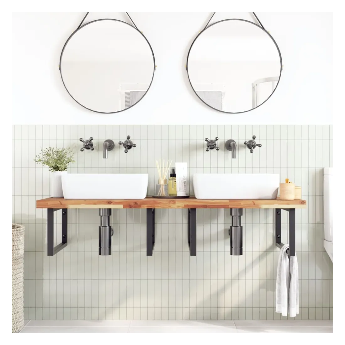 Améliorez votre salle de bain avec ce dessus de meuble-lavabo en bois pour une touche de charme rustique ! Matériau robuste et stable : le bois d'acacia massif est connu pour sa solidité et sa durabilité. Ses couleurs variées et ses grains uniques lui confèrent un aspect attrayant. Avec une excellente stabilité et résistance aux intempéries, il est idéal pour la fabrication de mobilier d'intérieur et d'extérieur.Surface finie à l’huile : ce dessus de meuble est fait de bois d'acacia avec une finition à l'huile qui le rend plus résistant à l'humidité et aux dégâts d'eau, tout en préservant son caractère unique.Utilisation polyvalente : ce comptoir multifonctionnel peut être associé à différentes bases pour un large éventail d'utilisations, telles qu'un poste de travail dans la cuisine, un établi dans le garage, une étagère dans la salle de bain ou un bureau.Entretien facile : grâce à sa surface lisse, le dessus est facile à nettoyer avec un chiffon humide. Bon à savoir :Chaque article est unique, avec des variations de couleurs et de grains. La livraison est aléatoire, ce qui garantit l'exclusivité et l'individualité de votre produit.Il est recommandé de réappliquer une finition à l’huile pour conserver sa qualité et son apparence au moins une fois par an.