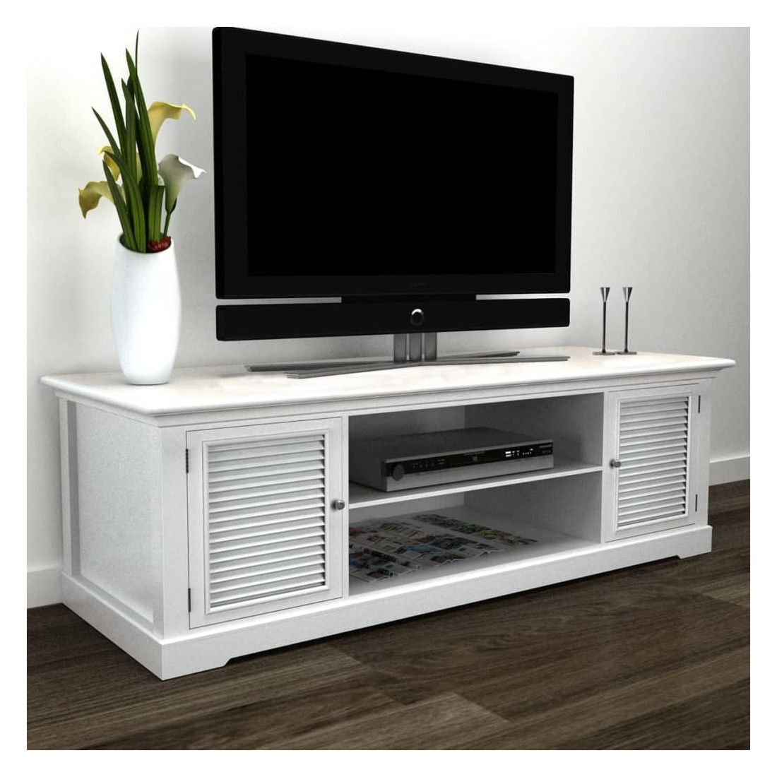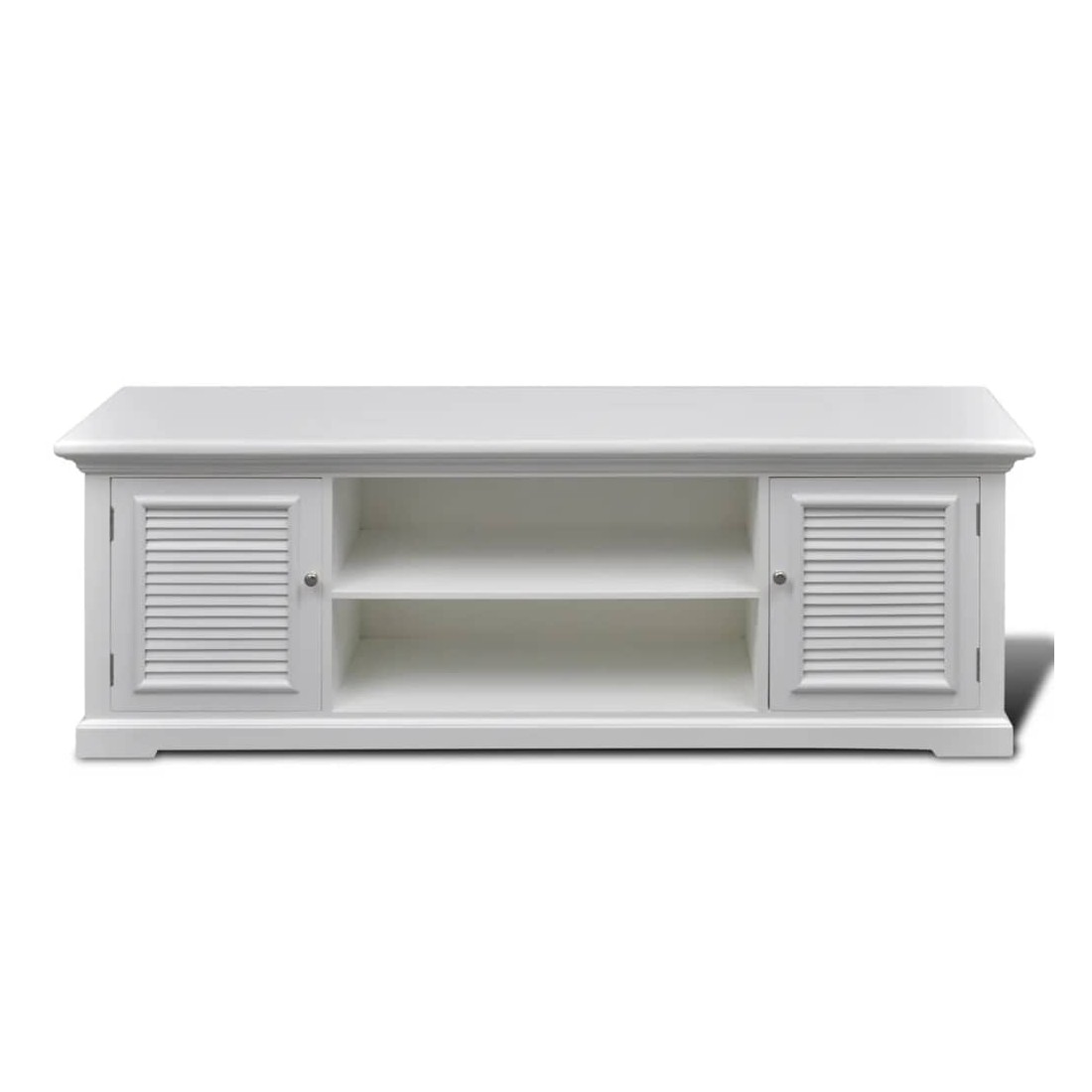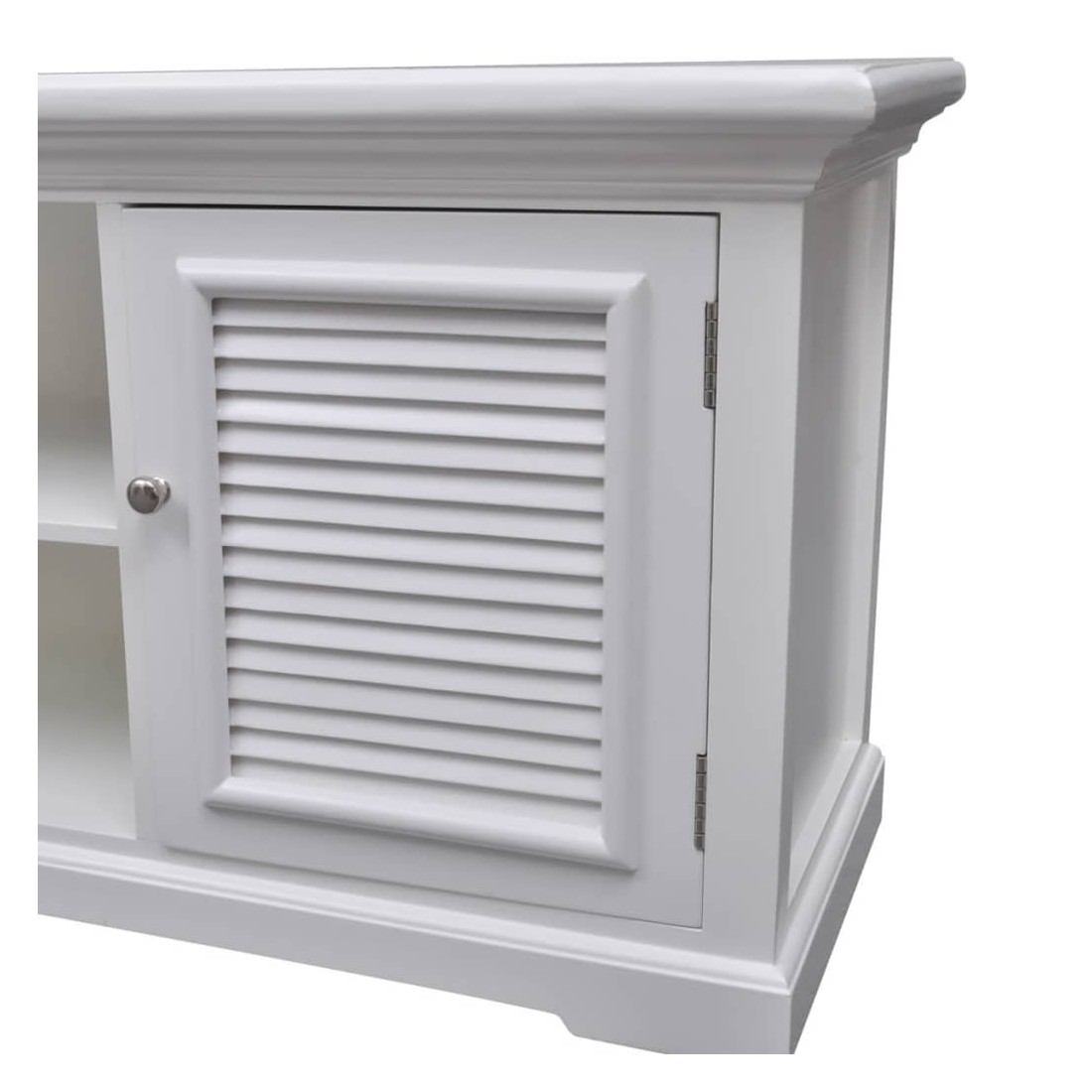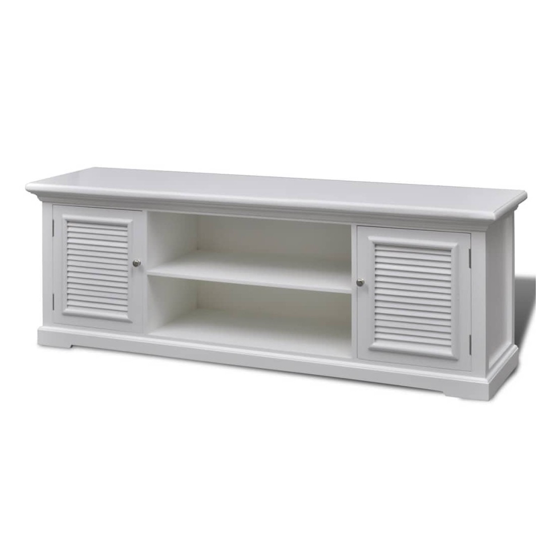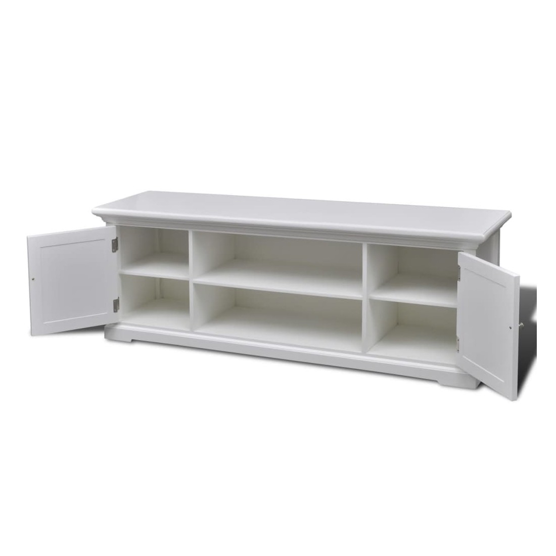 Cet élégant meuble TV en bois à l'aspect antique avec des lignes épurées sera un complément parfait à presque tous les styles d'intérieur, des lofts ultra-modernes aux chambres familiales décontractées. Il ajoutera une touche de style à votre installation de cinéma à la maison. La console de télévision a quatre étagères avec deux portes, qui fournissent un stockage hors de vue pour les jeux, les films, la musique et d'autres éléments essentiels de divertissement. Deux autres étagères peuvent accueillir différents systèmes de divertissement à domicile, tels que des lecteurs de CD, des lecteurs DVD et des systèmes DVR. La large surface supérieure de ce meuble TV le rend idéal pour exposer un téléviseur plasma ou LCD à écran large autoportant. Fabriqué en MDF robuste et de bois de pin, le meuble TV résiste bien à l'usure quotidienne. La finition de peinture blanche facilite le nettoyage avec un chiffon humide.