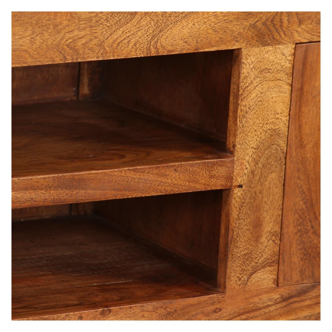 Ce meuble TV élégant et pratique sera un ajout intemporel à votre décor. Il peut également être utilisé comme meuble HiFi ou buffet. Cette armoire à plasma est fabriquée en bois d'acacia massif avec une finition miel. L'acacia est un bois dur tropical durable. Le meuble TV est entièrement fait à la main et les beaux grains de bois rendent chaque meuble unique et légèrement différent l'un de l'autre. Ses 2 armoires et 2 étagères offrent amplement d'espace pour ranger les appareils multimédias, les supports média et tout autre élément que vous souhaitez afficher ou garder à portée de main. Chaque armoire a une porte avec une charnière spéciale, de cette façon la porte n'a pas besoin d'une poignée de porte. L'article est déjà assemblé ; aucun assemblage n'est requis. Remarque importante :