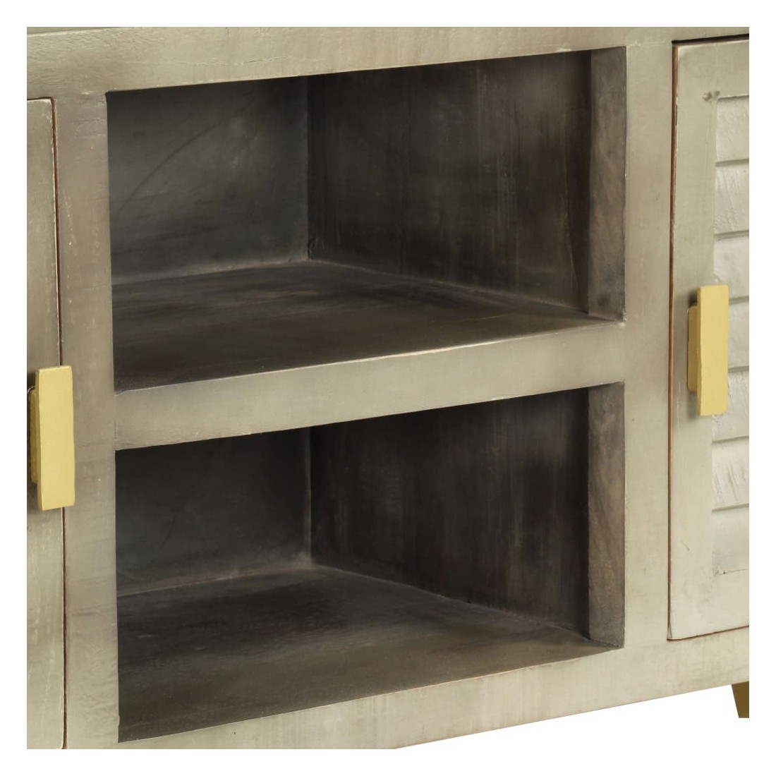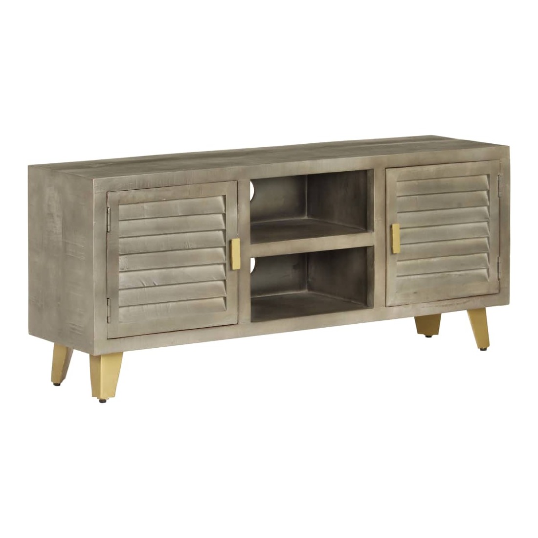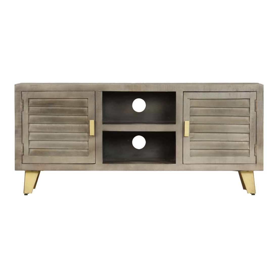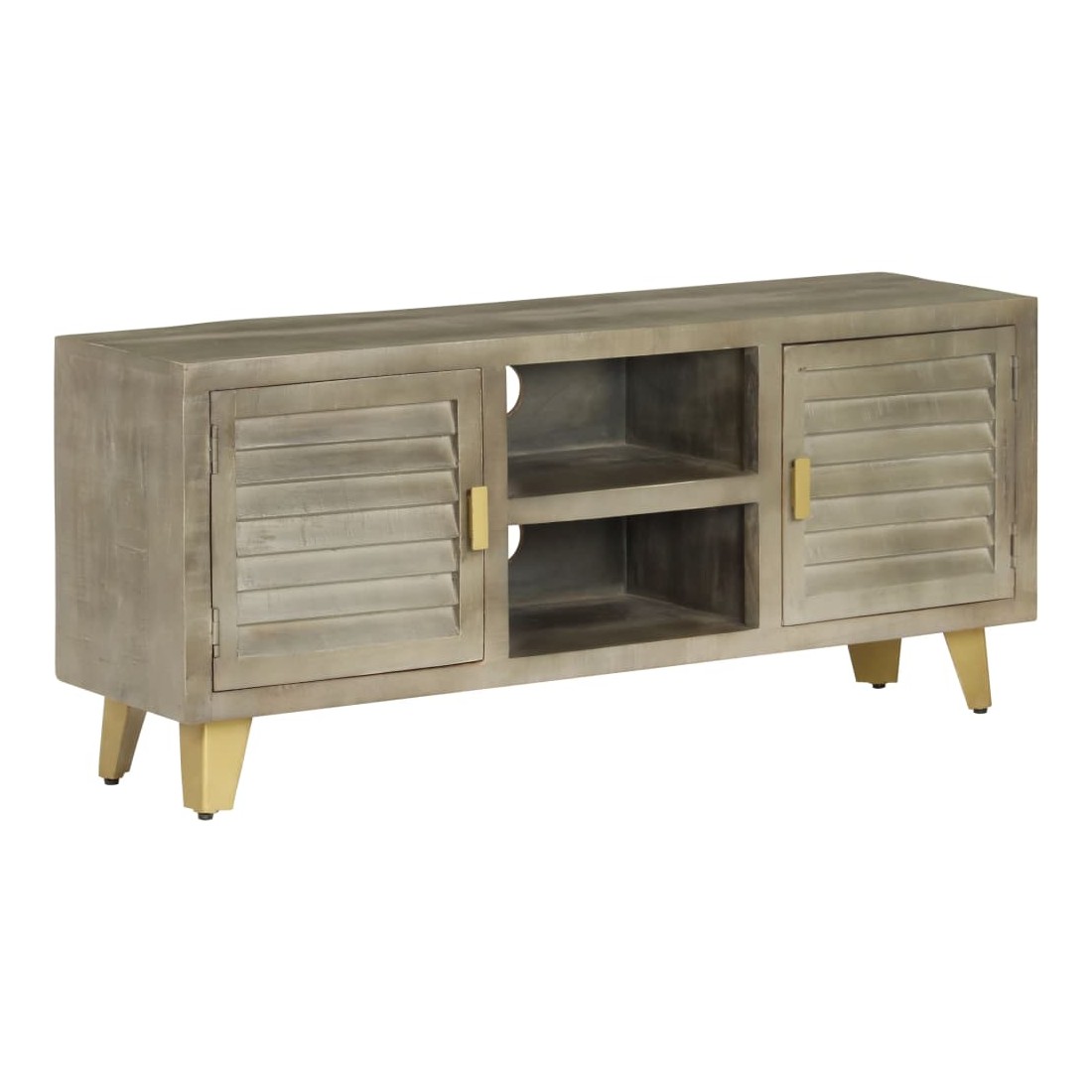 Ce meuble TV dégage un charme vintage qui apportera une touche intemporelle à votre maison. Il est doté de deux tablettes ainsi que de deux compartiments et de portes, ce qui sera idéal pour garder vos lecteurs de DVD, consoles de jeu, appareils de diffusion en continu et supports multimédia bien rangés. L'armoire hi - fi est en bois massif de manguier qui est solide, stable, durable et beau. En outre, l'artisanat ajoute à son style rétro spectaculaire. Chaque étape du processus est réalisée avec le plus grand soin, que ce soit le polissage, la peinture ou le laquage. De plus, les pieds en acier recouverts de laiton ajoutent à la fois à la stabilité et au charme unique du buffet. Ce produit est facile à assembler. Veuillez noter que la couleur du bois peut varier d'une pièce à l'autre, ce qui rend chaque pièce unique et légèrement différente l'une de l'autre. La livraison est aléatoire, ce qui garantit l'exclusivité et l'individualité de votre produit.