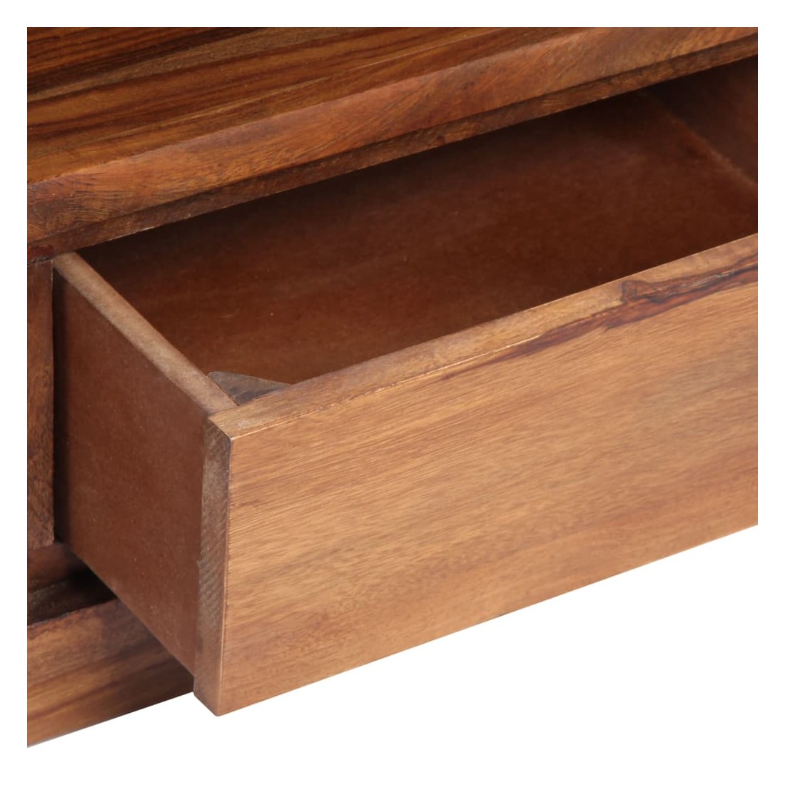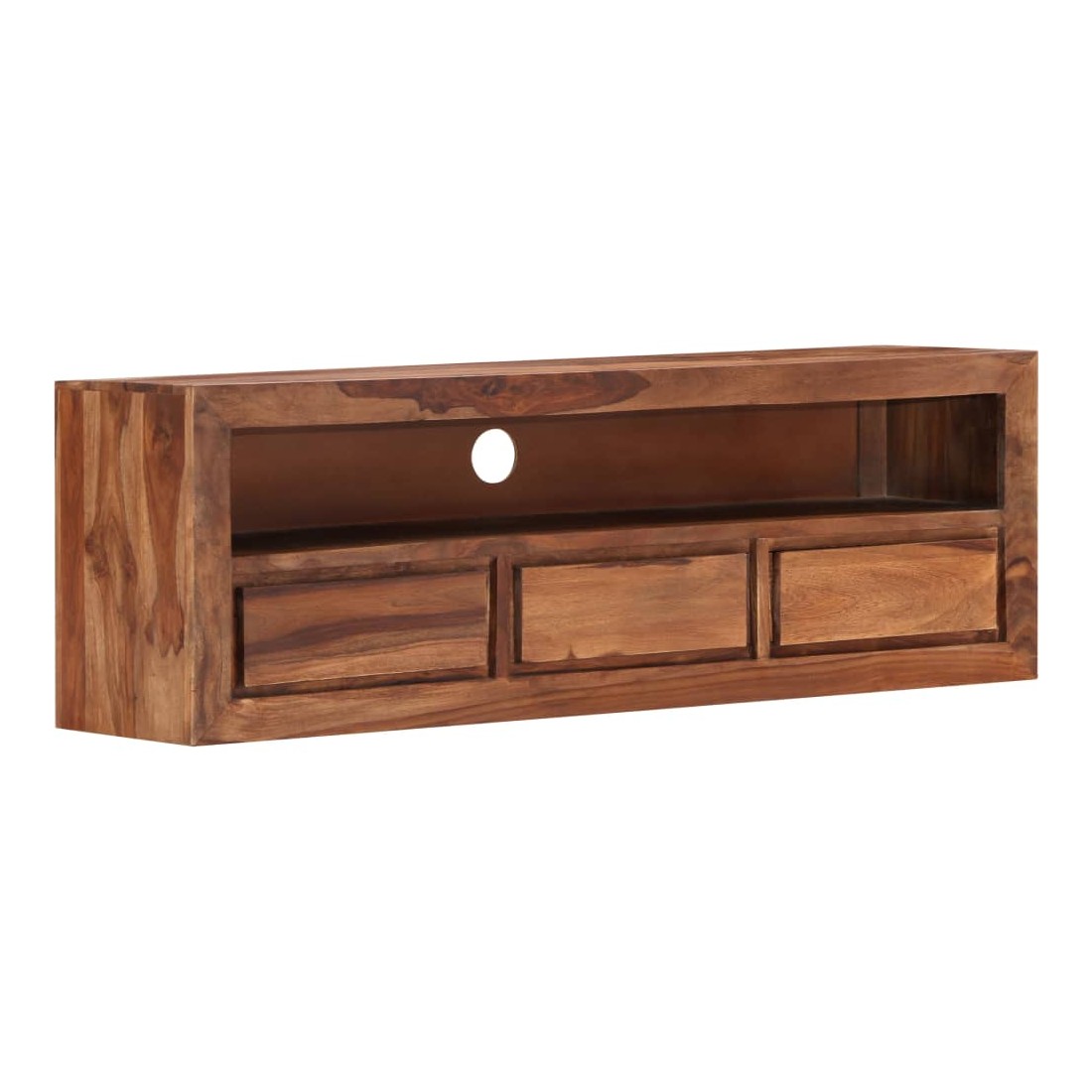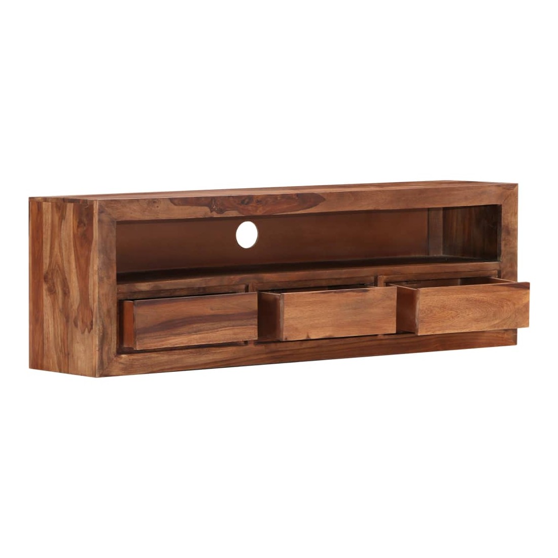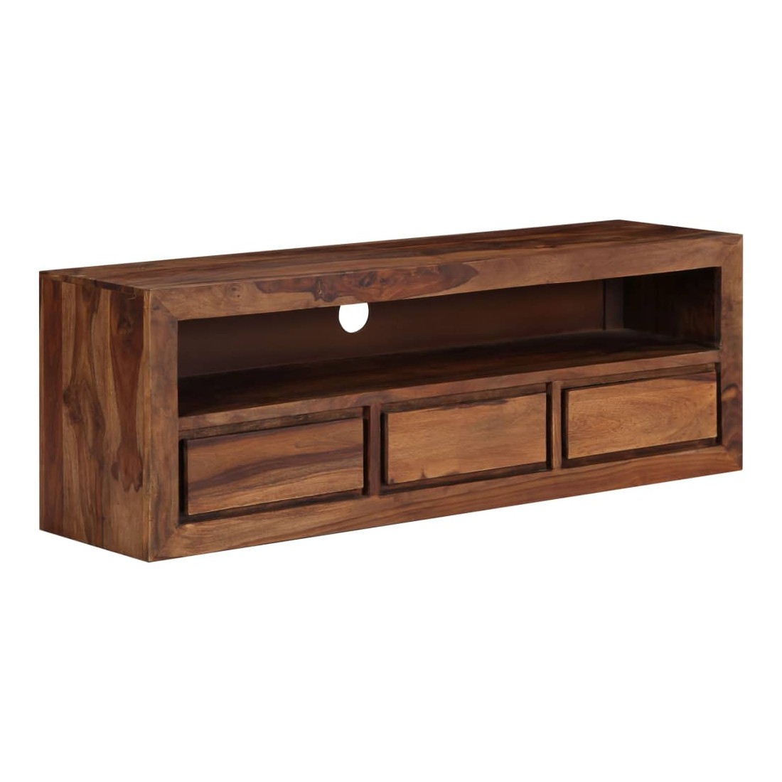 Ce meuble de télévision dégage un charme rustique. Il deviendra une pièce de résistance de votre intérieur. Le buffet est fait de bois solide, également appelé palissandre ou bois de rose, est un bois dur tropical qui est célèbre pour ses grains naturels et sa texture lisse. De plus, il ne se déforme pas et ne se fend pas et présente une résistance naturelle à la pourriture. En conséquence, ce buffet au design magnifique est extrêmement stable, durable et captivante. Ce meuble stéréo est entièrement fabriqué à la main et les grains de bois esthétiquement attrayants rendent chaque meuble distinctif et légèrement différent l'un de l'autre. Cette armoire HiFi comprend 3 tiroirs et 1 compartiment, offrant amplement d'espace pour ranger vos appareils multimédia, vos livres, ainsi que divers