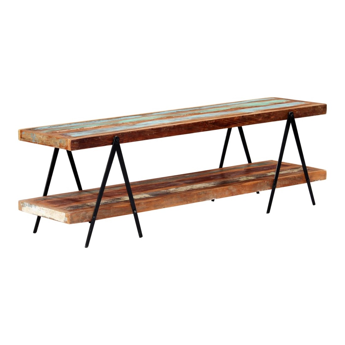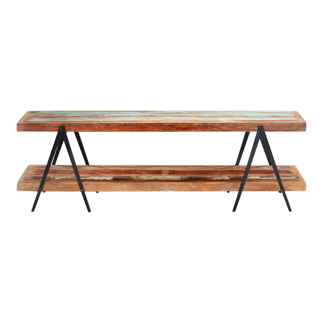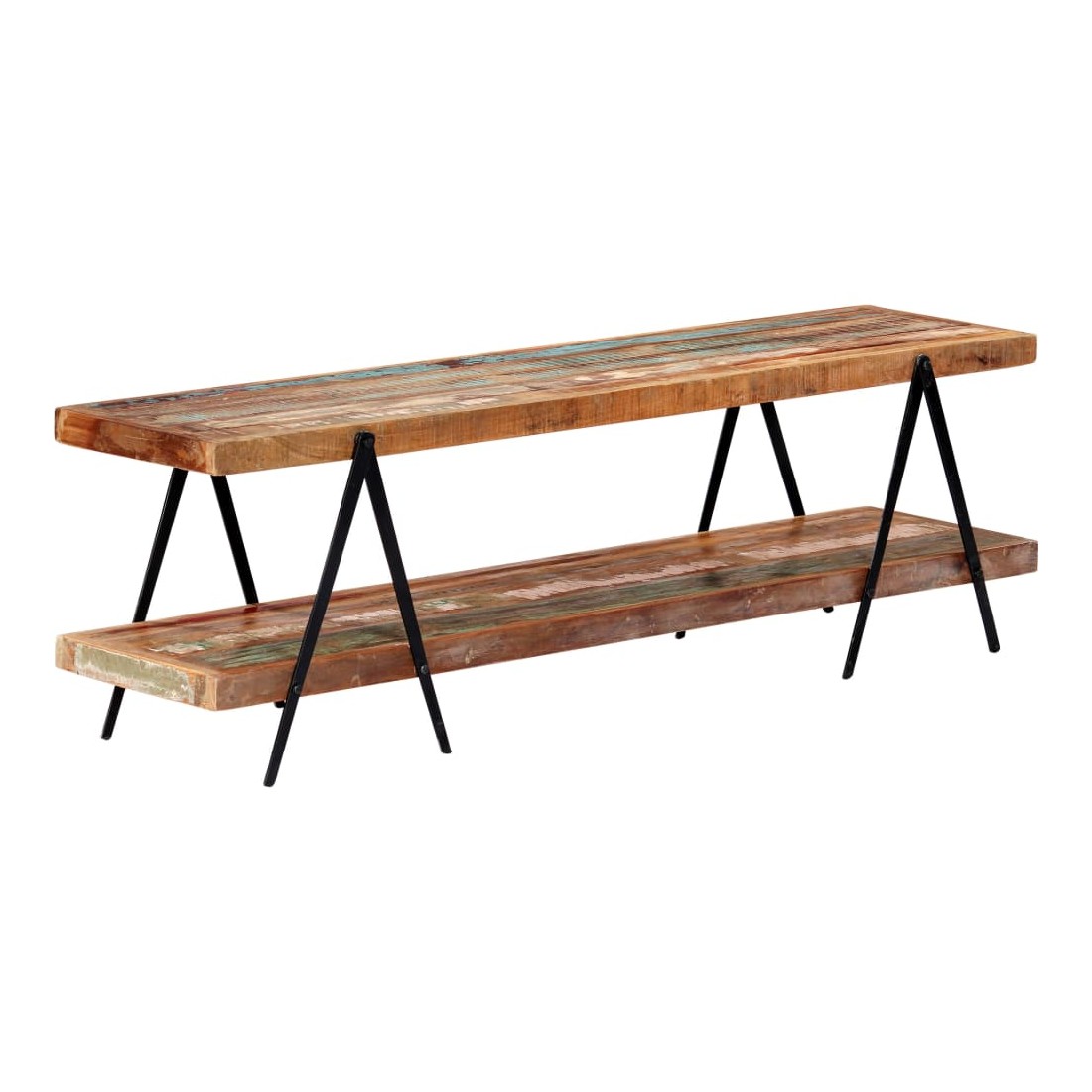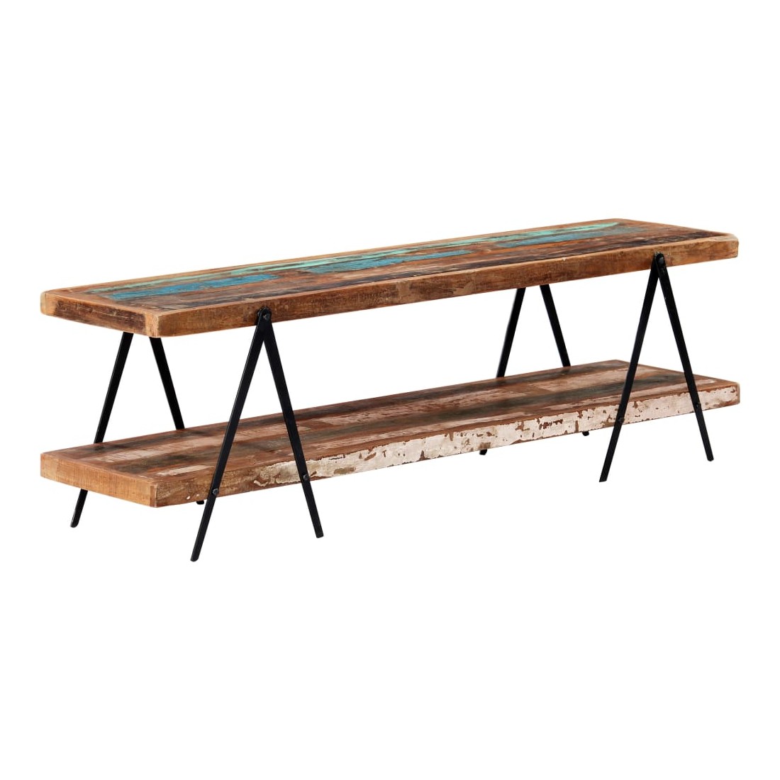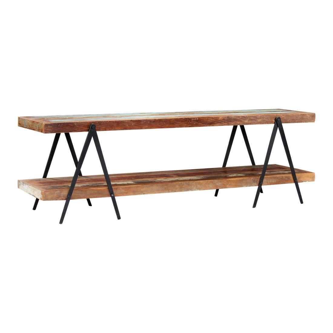 Vintage mai élégant, ce meuble tv en bois évoque un charme vintage et industriel avec son bois de récupération solide et son cadre en fer enduit de poudre. Le meuble est fabriqué en bois de récupération solide provenant des solives, des planchers et des poutres de soutènement d'anciens bâtiments démolis. Il peut être composé de différents types de bois : pinède, teck, hêtre, chêne, cèdre, manguier, acacia, etc. Cela signifie que le bois de récupération conserve les caractéristiques de ces différents types de bois. Le bois de récupération est déjà vieilli, érodé et séché, donc il ne rétrécit ni se plie. Le savoir-faire exquis et les grains de bois esthétiquement attrayants rendent chaque meuble unique et légèrement différent l'un de l'autre. Chaque étape du processus est réalisée avec le plus grand soin, qu'il s'agisse de polissage ou de laquage. En outre, cette armoire comporte 2 étagères, offrant un grand espace pour ranger vos appareils multimédia, vos livres, ainsi que divers autres articles. Le cadre revêtu de poudre contribue à la construction robuste et ajoute également le charme industriel de l'armoire à plasma. Cet article est facile à assembler. Remarque importante : les couleurs et les grains varient d'une pièce à l'autre, rendant chaque pièce unique. La livraison est aléatoire, ce qui garantit l'exclusivité et l'individualité de votre produit.