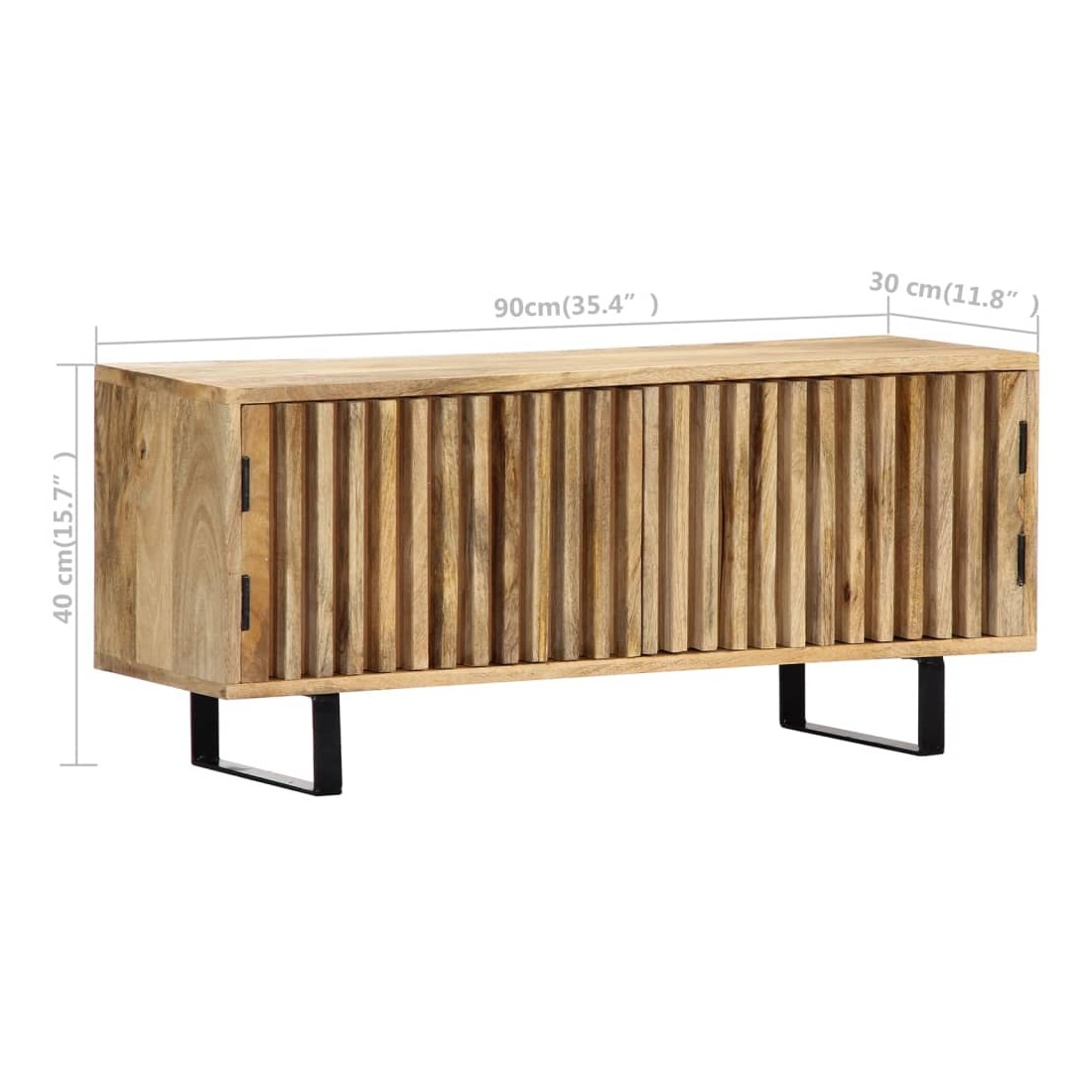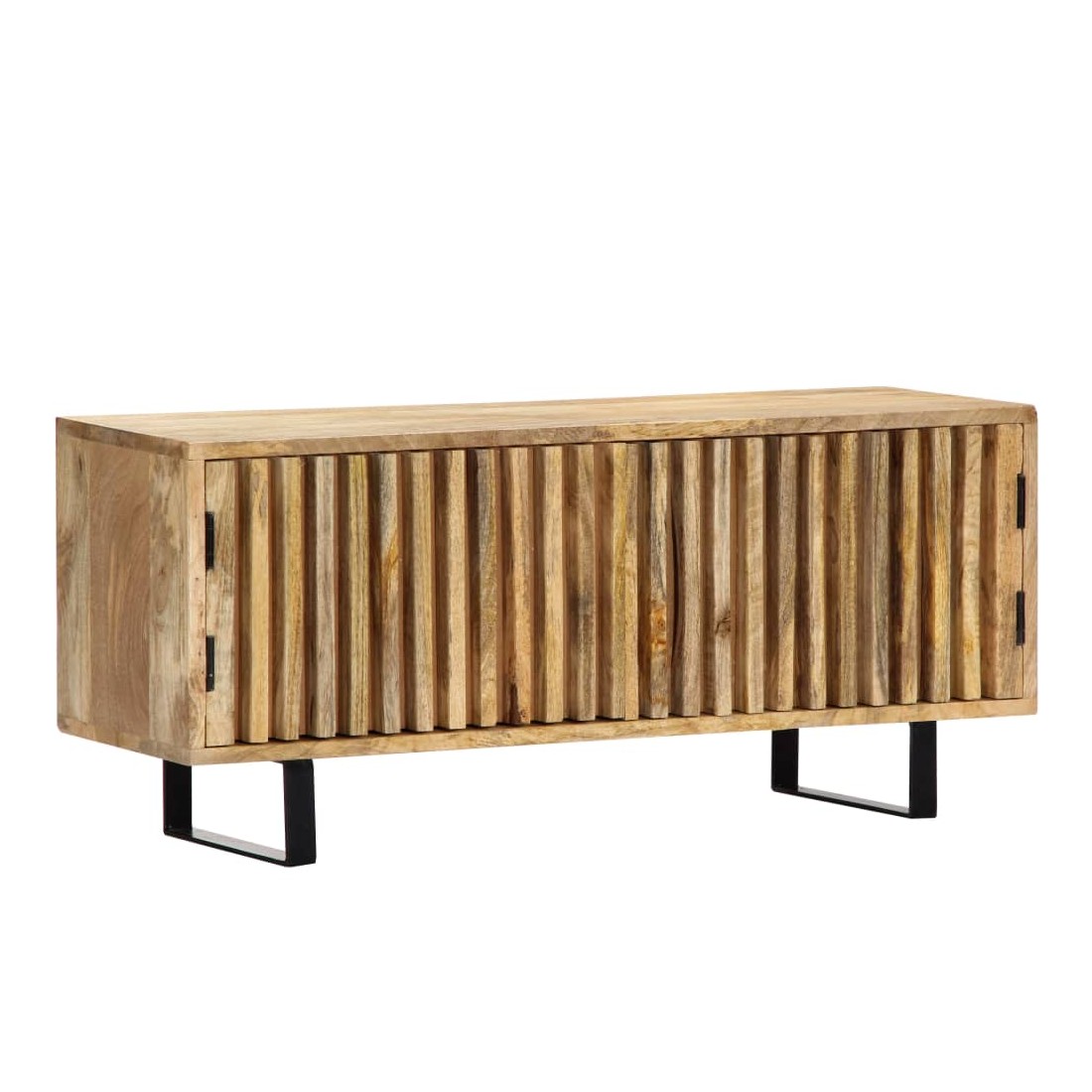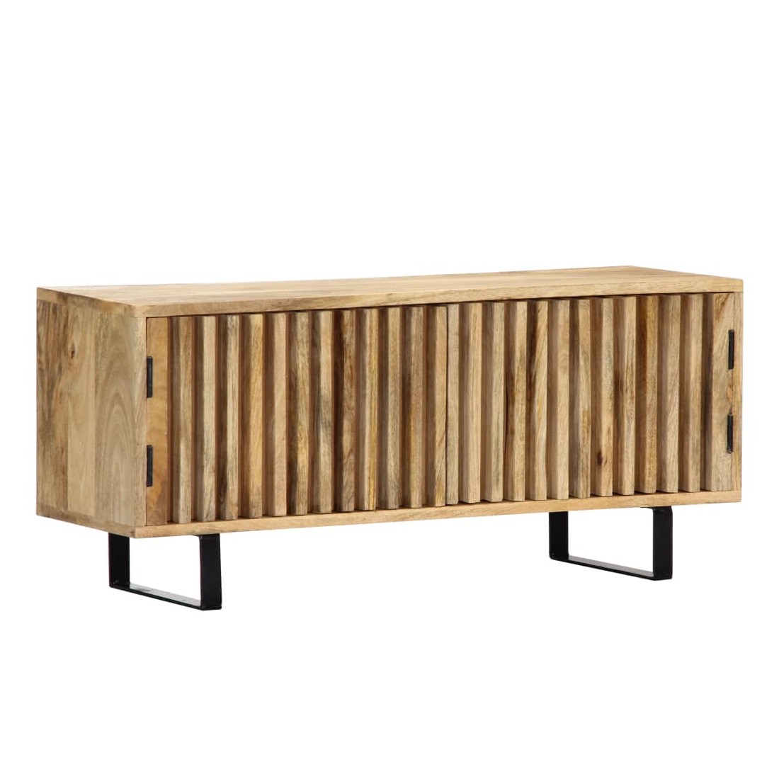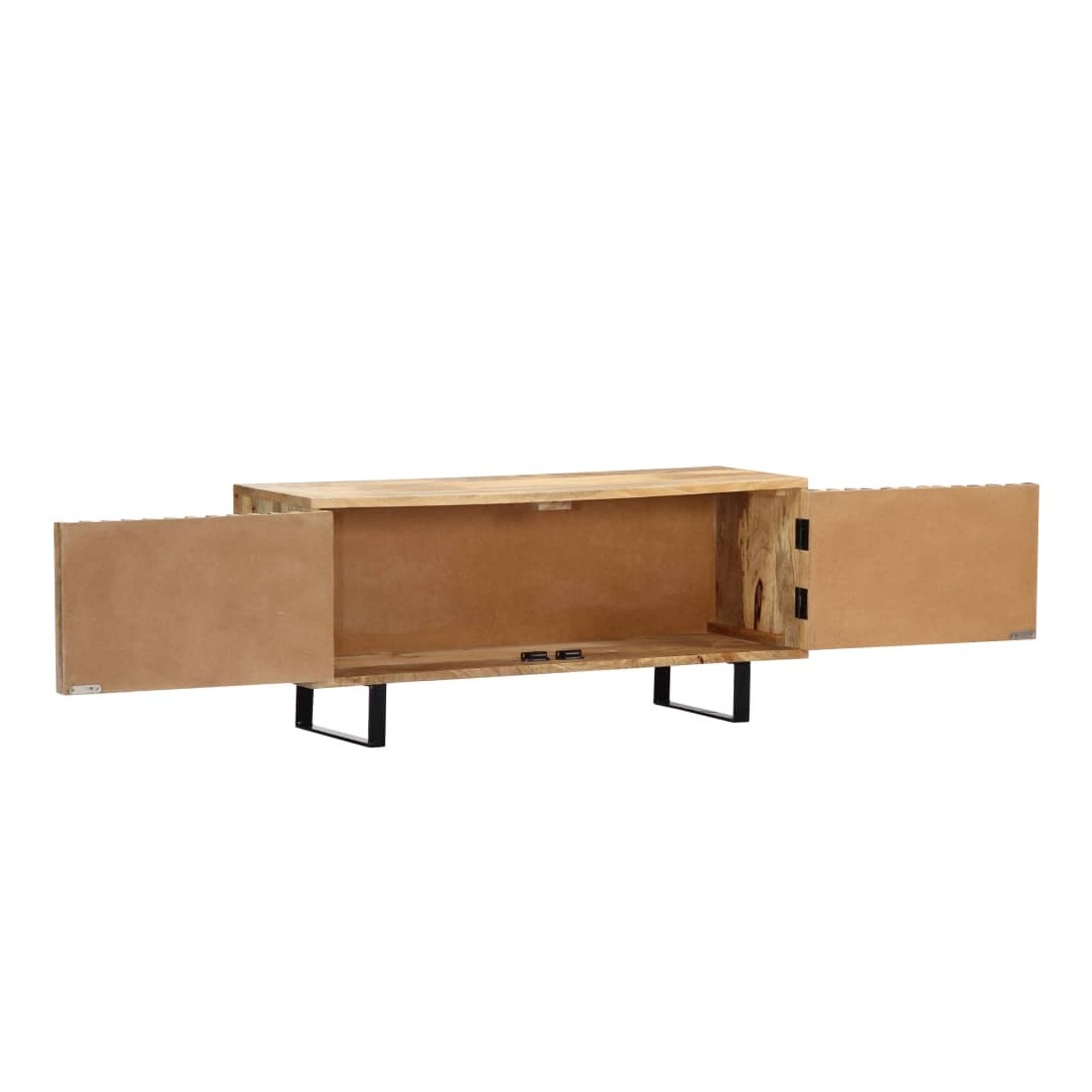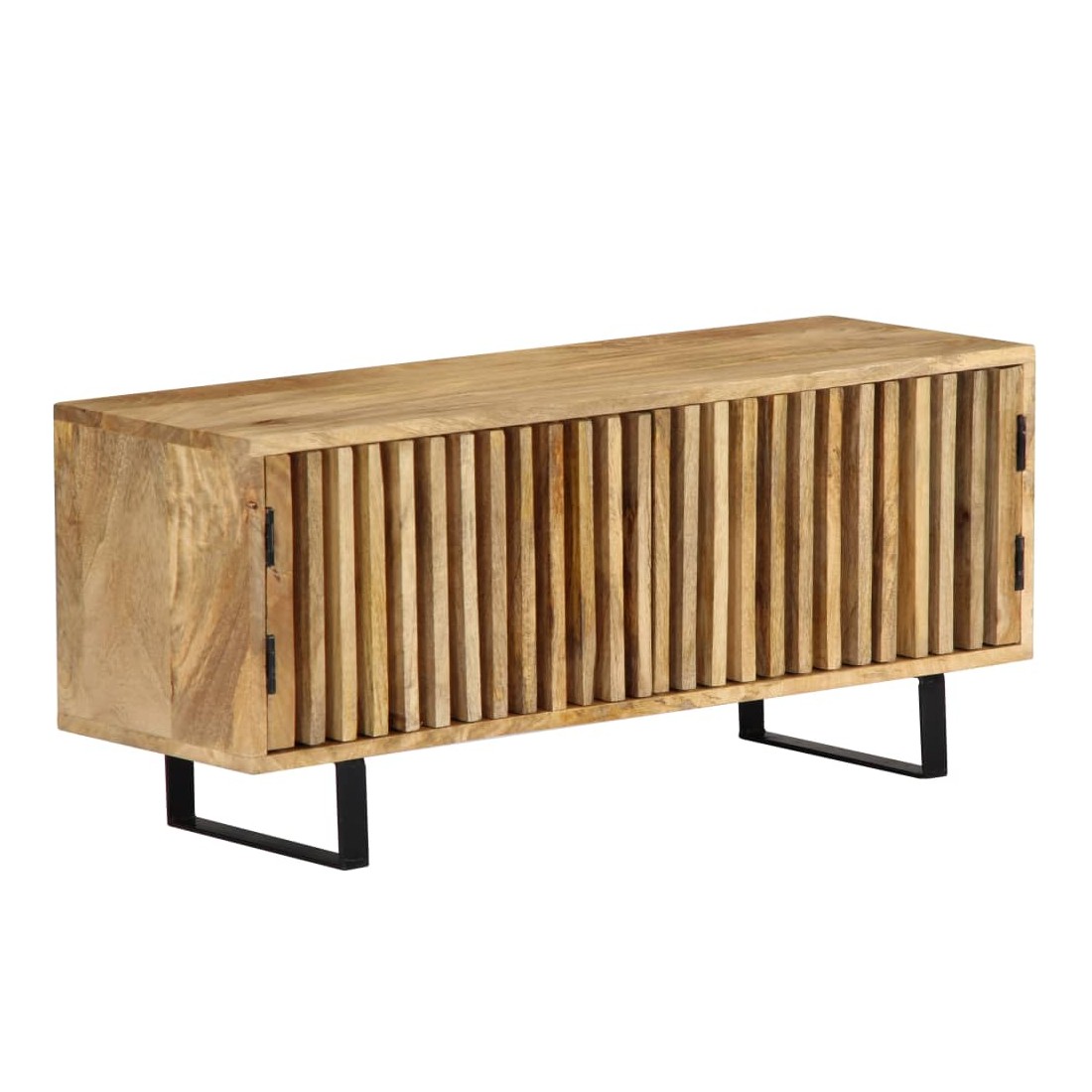 Avec un design élégant et tendance, ce meuble de télévision en bois ajoutera une touche captivante à votre intérieur. L'armoire HiFi est en bois de manguier massif, un bois dur aux grains denses. Le bois de manguier brut possède non seulement la résistance nécessaire pour supporter le poids, mais il résiste également à l'usure du temps. En conséquence, cette armoire au design élégant est extrêmement stable, durable et accrocheur. De plus, ce meuble stéréo est entièrement fait à la main, le travail artisanal exquis et les grains de bois esthétiques rendent chaque meuble unique et légèrement différent l'un de l'autre. Ce buffet bas dispose d'une armoire à 2 portes, offrant suffisamment d'espace pour ranger vos appareils multimédia, livres, ainsi que divers autres articles. Remarque importante : les couleurs varient d'une pièce à l'autre, rendant chaque pièce unique. La livraison est aléatoire, garantissant l'exclusivité et l'individualité de votre produit.