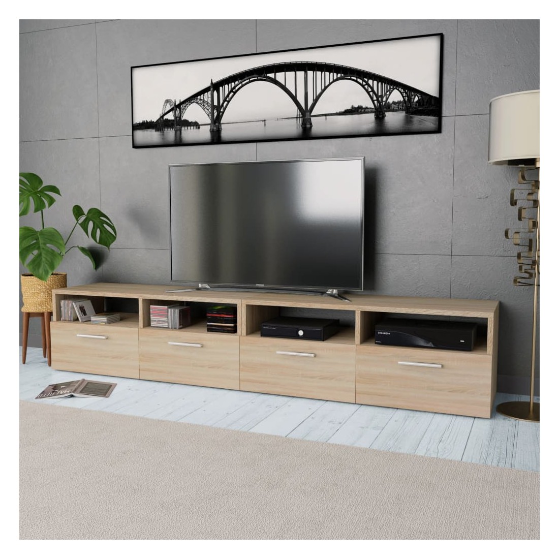 Les meubles TV modernes ont un design sobre et pratique et conviendront à n'importe quel décor de maison. Les meubles HiFi sont en bois d’ingénierie avec des bords en PVC et sont stables et durables. Chaque meuble a deux étagères ouvertes et deux armoires avec des portes s'ouvrant vers le bas qui ont amplement d'espace de rangement pour votre lecteur DVD, console de jeu, récepteur numérique ou vos supports média. Les meubles TV seront un excellent supplément à votre chambre à coucher ou salon. L'assemblage est facile. La livraison comprend 2 armoires TV.