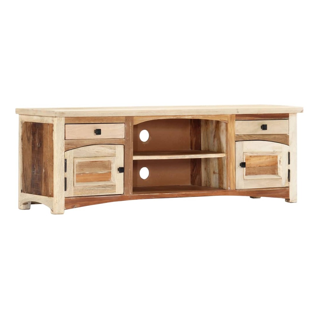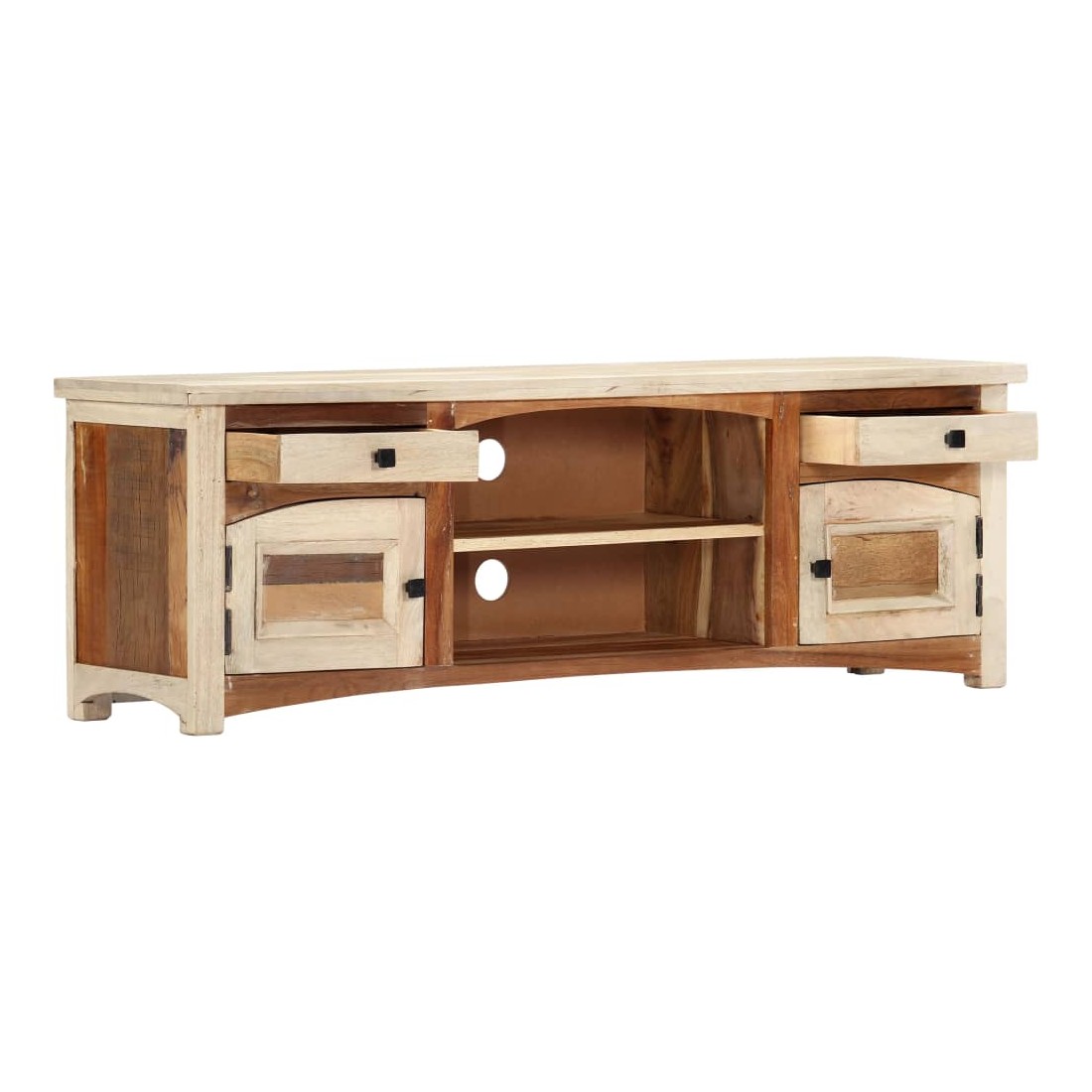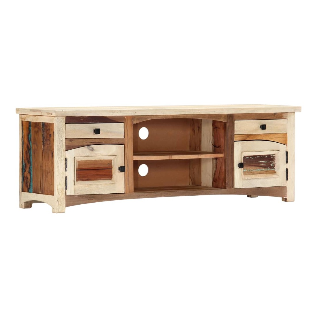 Introduisez un air d'élégance du milieu du siècle dans votre intérieur avec notre magnifique meuble TV en bois massif ! Ce meuble HiFi est fait de bois de manguier massif et de bois de récupération provenant des solives, des planchers et des poutres de soutien de vieux bâtiments démolis et peut être composé de différents types de bois comme le pin, le teck, le hêtre, le chêne, le cèdre, le bois de manguier, l'acacia, etc. Cela signifie que le bois de récupération conserve les caractéristiques de ces différents types de bois. Le bois de récupération est déjà vieilli, patiné et séché, donc il ne rétrécit pas et ne se plie pas. Chaque étape du processus est réalisée avec le plus grand soin, qu'il s'agisse du polissage ou du laquage. L'artisanat exquis et les grains de bois gracieux rendent chaque meuble distinctif et légèrement différent l'un de l'autre. De plus, ce meuble à plasma se distingue par 2 portes, 2 tiroirs et 2 compartiments, offrant une solution idéale pour garder vos petits objets rangés et à portée de main. Le support TV est facile à assembler. Note importante : Les couleurs et les grains de bois varient d'une pièce à l'autre, ce qui rend chacun de nos meubles TV unique. La livraison est aléatoire, ce qui garantit l'exclusivité et l'individualité de votre produit.