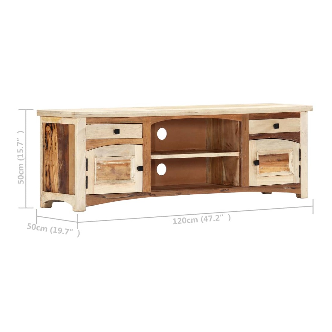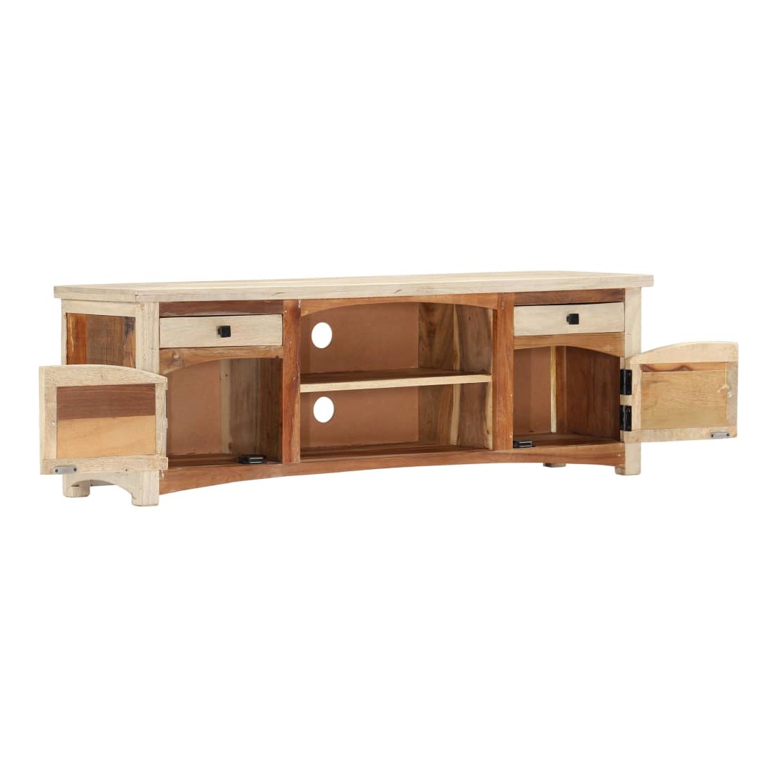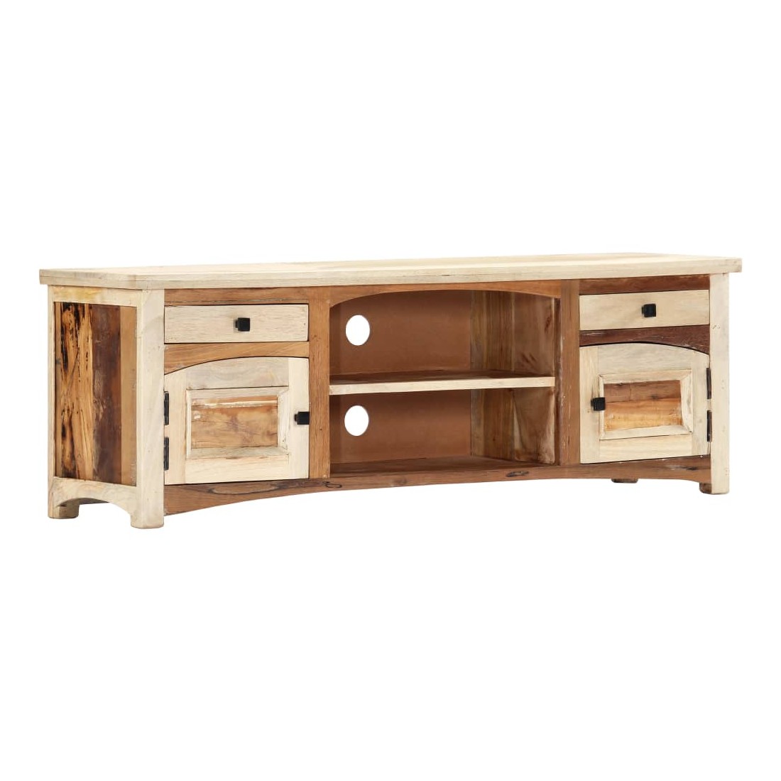 Introduisez un air d'élégance du milieu du siècle dans votre intérieur avec notre magnifique meuble TV en bois massif ! Ce meuble HiFi est fait de bois de manguier massif et de bois de récupération provenant des solives, des planchers et des poutres de soutien de vieux bâtiments démolis et peut être composé de différents types de bois comme le pin, le teck, le hêtre, le chêne, le cèdre, le bois de manguier, l'acacia, etc. Cela signifie que le bois de récupération conserve les caractéristiques de ces différents types de bois. Le bois de récupération est déjà vieilli, patiné et séché, donc il ne rétrécit pas et ne se plie pas. Chaque étape du processus est réalisée avec le plus grand soin, qu'il s'agisse du polissage ou du laquage. L'artisanat exquis et les grains de bois gracieux rendent chaque meuble distinctif et légèrement différent l'un de l'autre. De plus, ce meuble à plasma se distingue par 2 portes, 2 tiroirs et 2 compartiments, offrant une solution idéale pour garder vos petits objets rangés et à portée de main. Le support TV est facile à assembler. Note importante : Les couleurs et les grains de bois varient d'une pièce à l'autre, ce qui rend chacun de nos meubles TV unique. La livraison est aléatoire, ce qui garantit l'exclusivité et l'individualité de votre produit.
