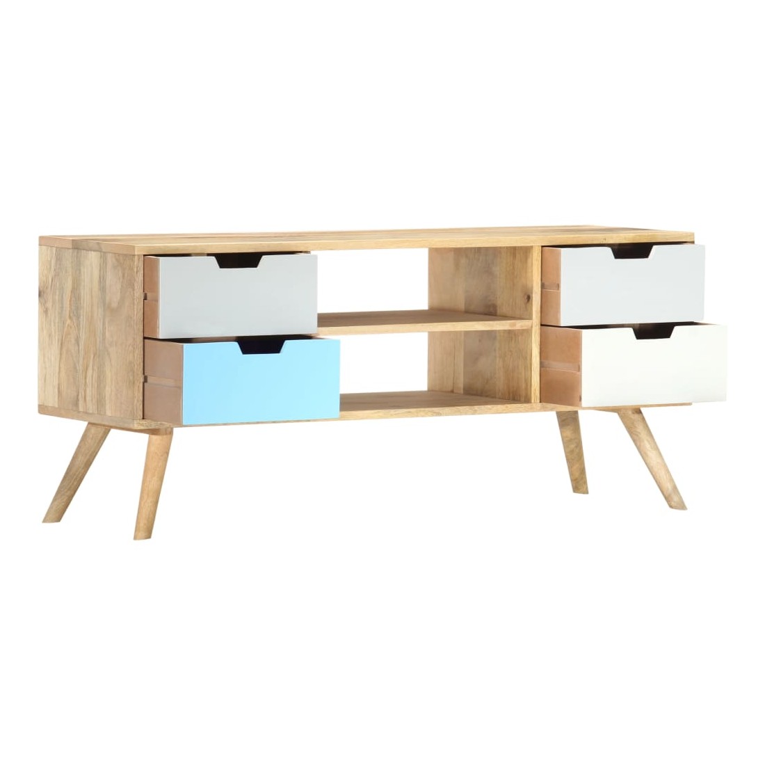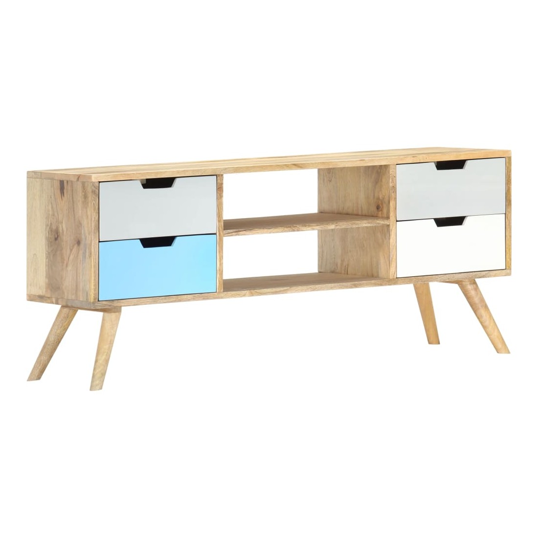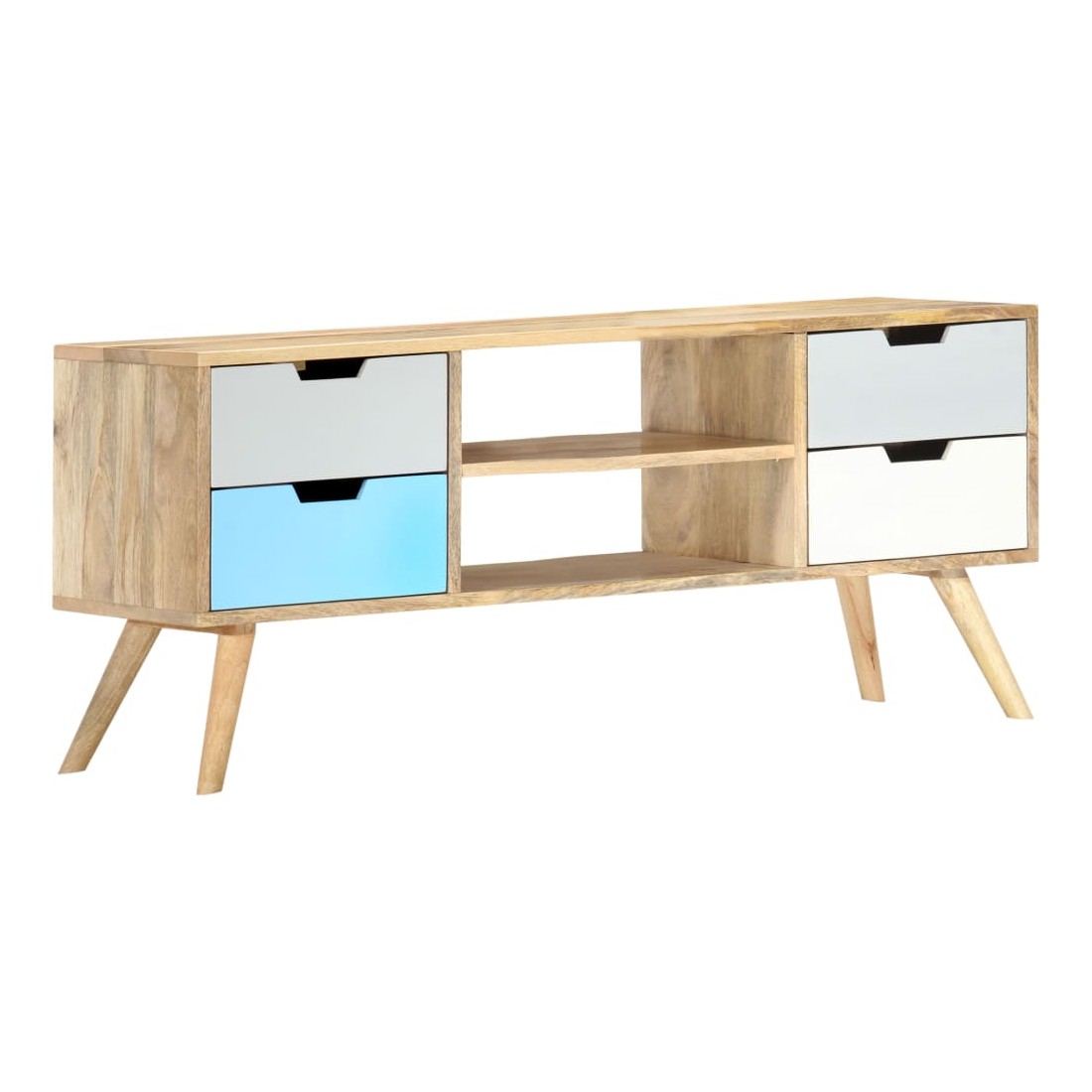 Ce meuble TV en bois massif de manguier avec laquage apportera une touche décorative et pratique à votre décoration. Il peut également être utilisé comme buffet ou armoire HiFi. Le meuble est fait à la main en bois de manguier qui est solide, stable, durable et beau et l'artisanat ajoute à son style rétro spectaculaire. Chaque étape du processus est réalisée avec le plus grand soin, que ce soit le polissage ou le laquage. L'artisanat et les beaux grains de bois font de chaque meuble un objet unique et légèrement différent l'un de l'autre. Ce meuble est doté d'un solide dessus sur lequel vous pouvez placer des objets décoratifs comme des paniers de fruits ou des vases. Conçu avec 4 tiroirs et 2 compartiments, ce buffet vous offre suffisamment d'espace pour garder vos objets importants organisés et à portée de main. Notre meuble TV est facile à assembler. Remarque importante : les couleurs et les grains varient d'une pièce à l'autre, rendant chacun de nos meubles TV unique. La livraison est aléatoire, ce qui garantit l'exclusivité et l'individualité de votre produit.