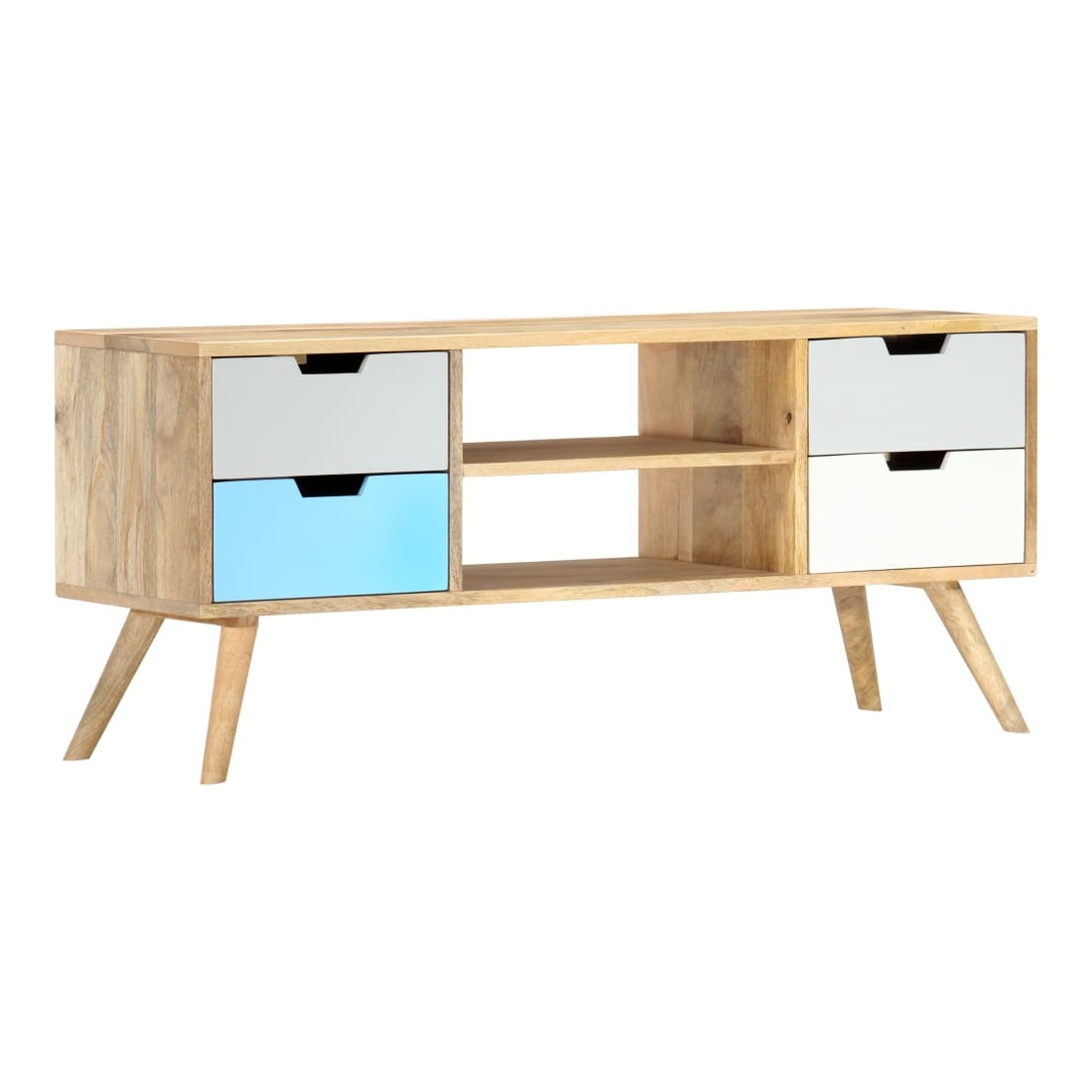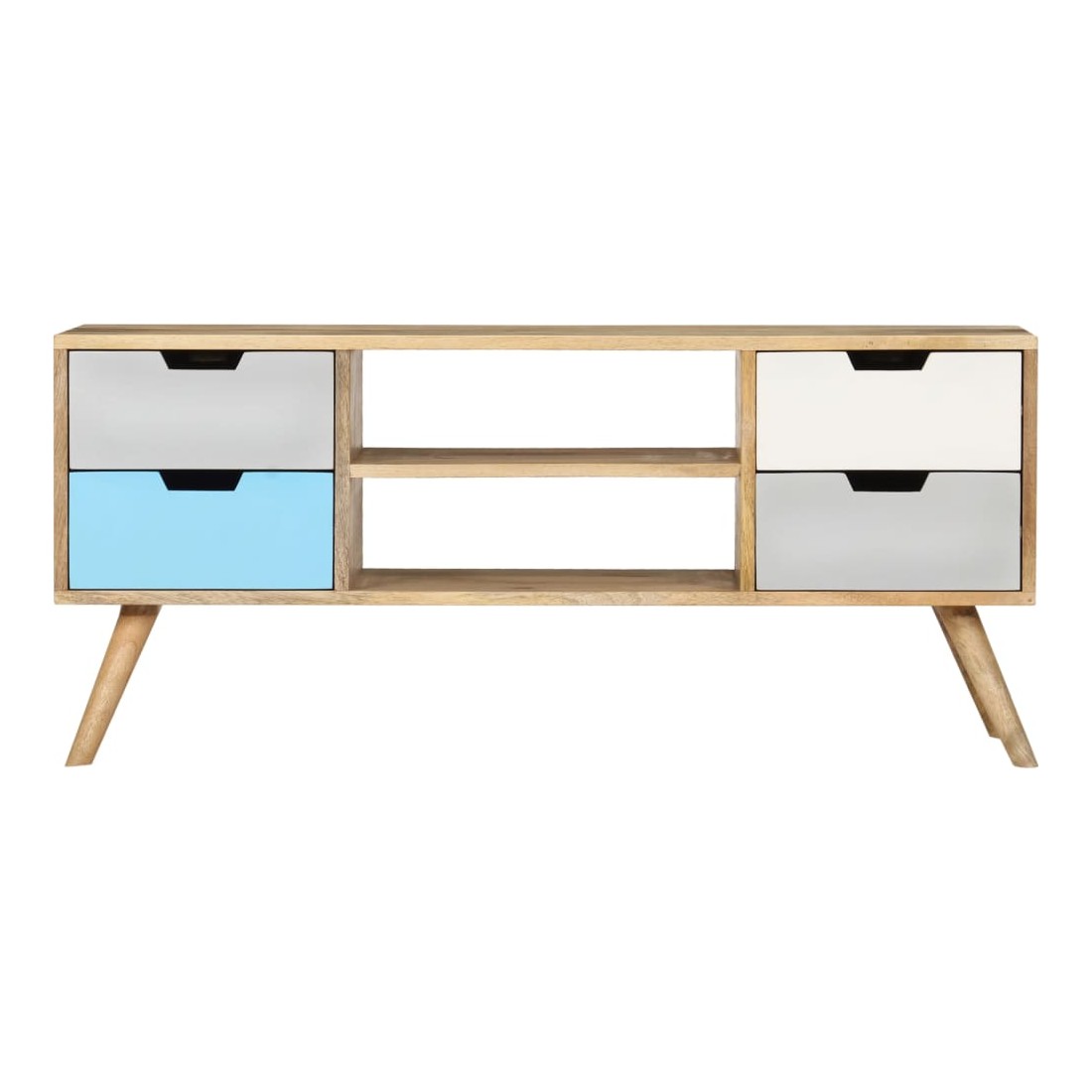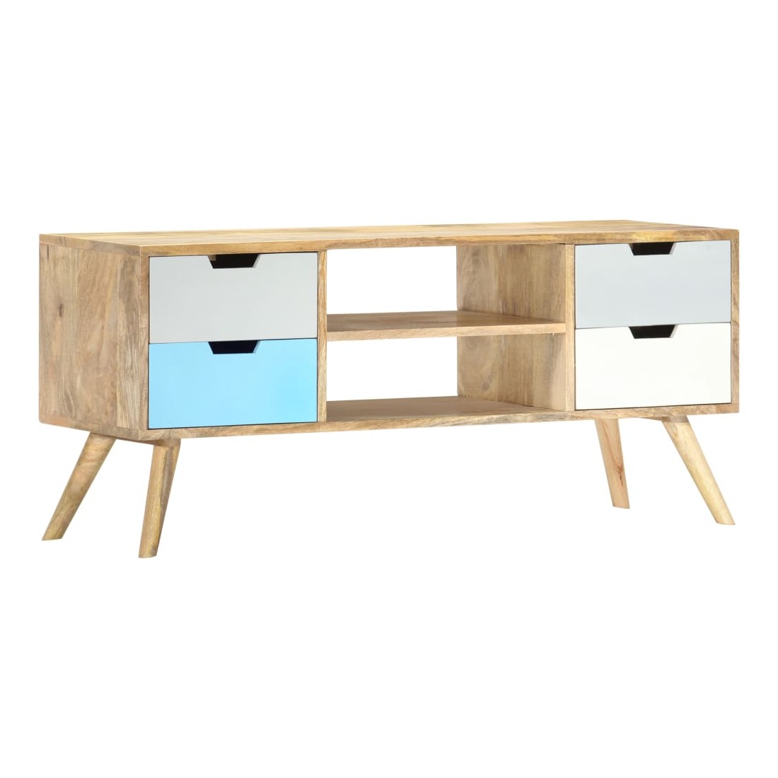 Ce meuble TV en bois massif de manguier avec laquage apportera une touche décorative et pratique à votre décoration. Il peut également être utilisé comme buffet ou armoire HiFi. Le meuble est fait à la main en bois de manguier qui est solide, stable, durable et beau et l'artisanat ajoute à son style rétro spectaculaire. Chaque étape du processus est réalisée avec le plus grand soin, que ce soit le polissage ou le laquage. L'artisanat et les beaux grains de bois font de chaque meuble un objet unique et légèrement différent l'un de l'autre. Ce meuble est doté d'un solide dessus sur lequel vous pouvez placer des objets décoratifs comme des paniers de fruits ou des vases. Conçu avec 4 tiroirs et 2 compartiments, ce buffet vous offre suffisamment d'espace pour garder vos objets importants organisés et à portée de main. Notre meuble TV est facile à assembler. Remarque importante : les couleurs et les grains varient d'une pièce à l'autre, rendant chacun de nos meubles TV unique. La livraison est aléatoire, ce qui garantit l'exclusivité et l'individualité de votre produit.