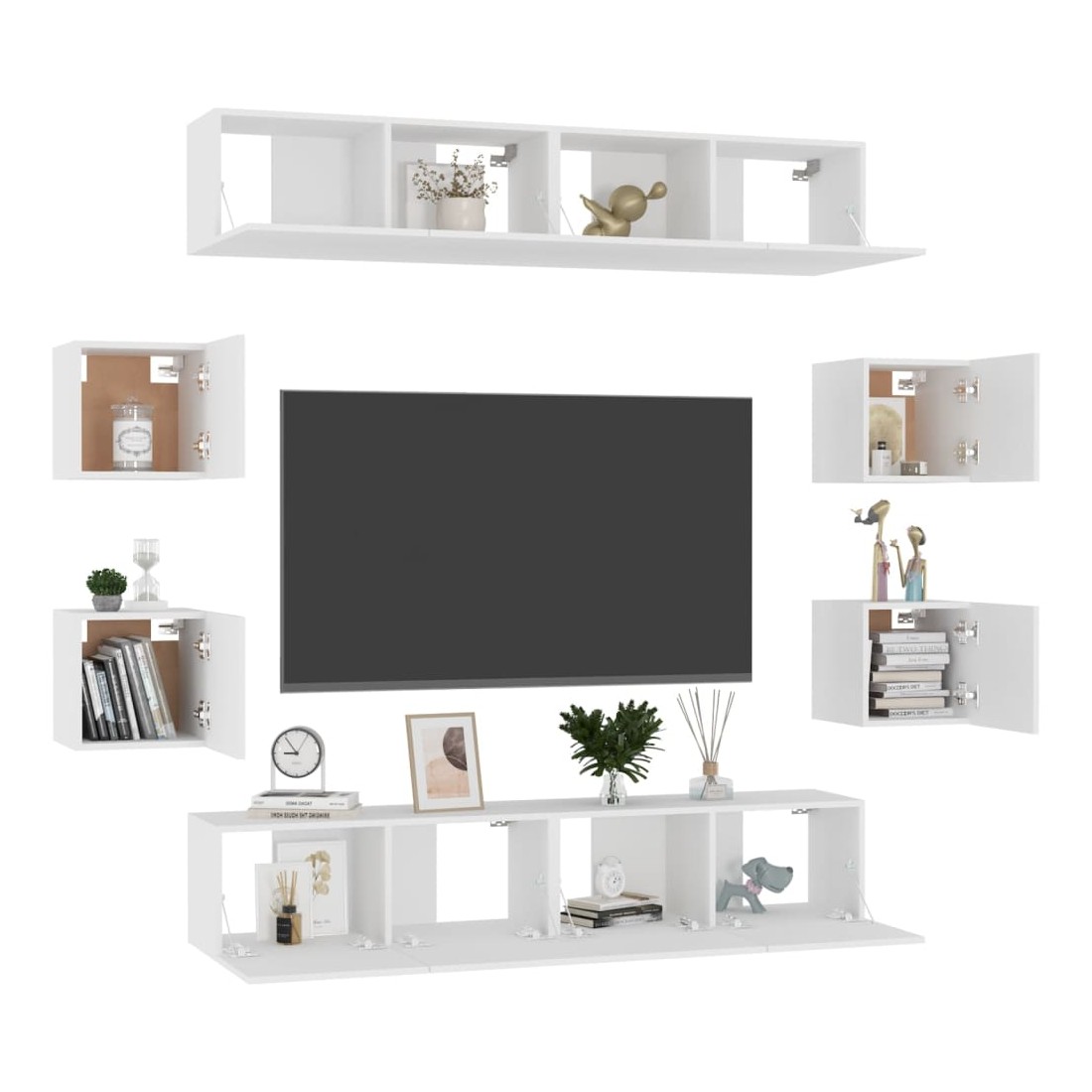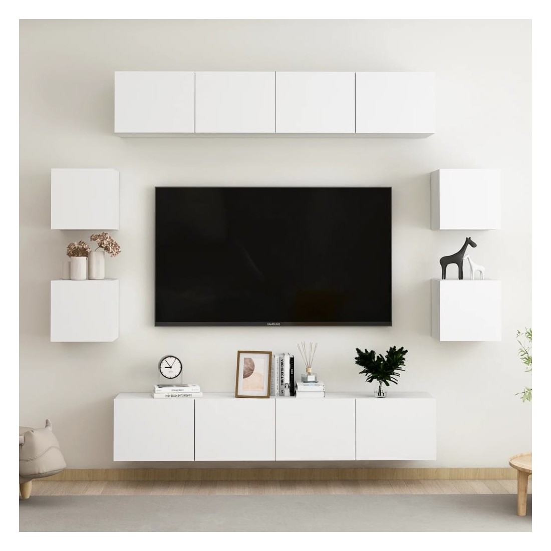 Cet ensemble de meuble TV robuste est destiné à être le point de mire de votre pièce avec un design à la fois tendance et pratique. Le meuble TV est fixé au mur, ce qui en fait un supplément intemporel à votre maison. Il offre de nombreux compartiments de rangement, ce qui en fait un endroit idéal pour stocker tous vos livres, magazines, DVD ou autres objets. Le meuble stéréo est facile à entretenir et à nettoyer avec un chiffon humide.