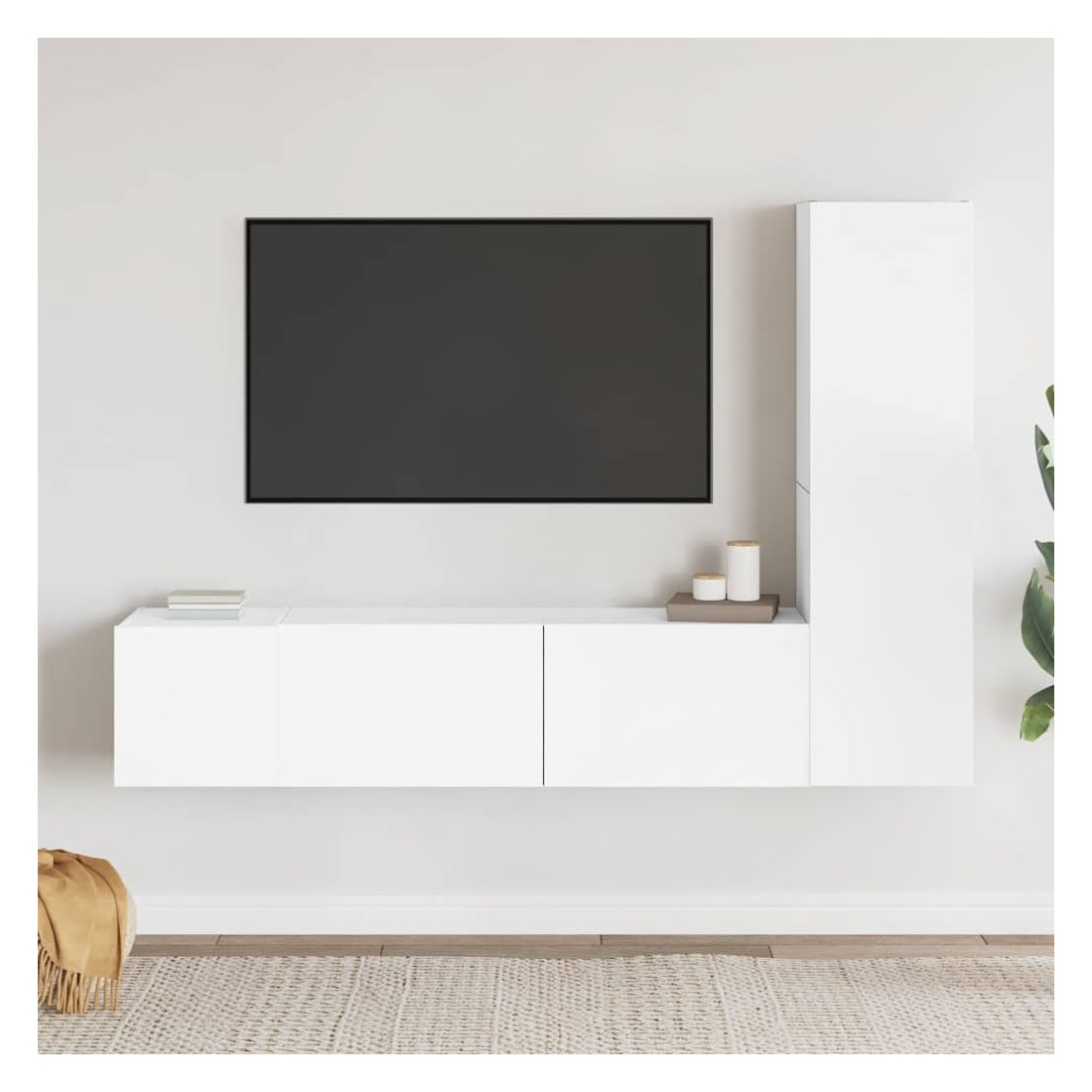 Cet ensemble de meuble TV robuste est destiné à être le point de mire de votre pièce avec un design à la fois tendance et pratique. Le meuble TV est fixé au mur, ce qui en fait un supplément intemporel à votre maison. Il offre de nombreux compartiments de rangement, ce qui en fait un endroit idéal pour stocker tous vos livres, magazines, DVD ou autres objets. Le meuble stéréo est facile à entretenir et à nettoyer avec un chiffon humide.